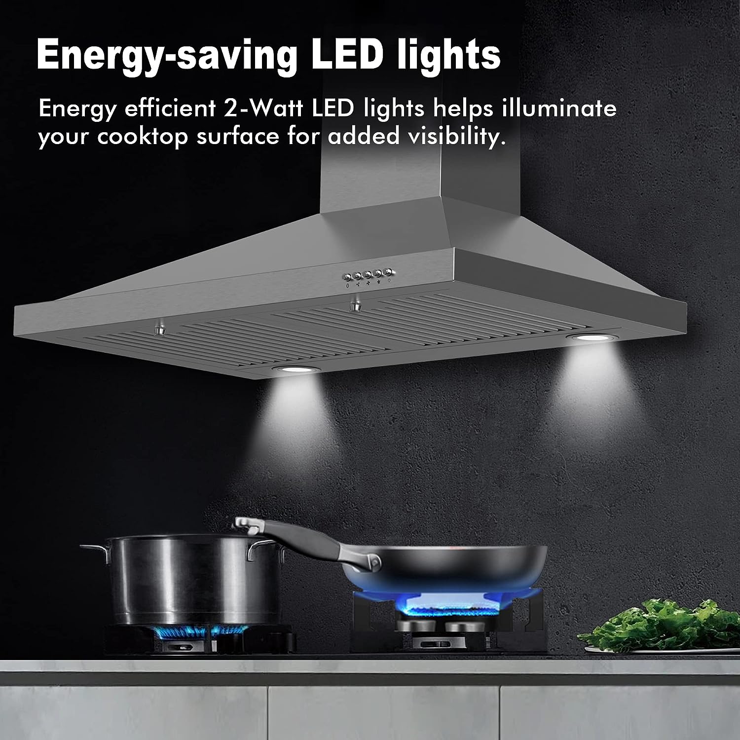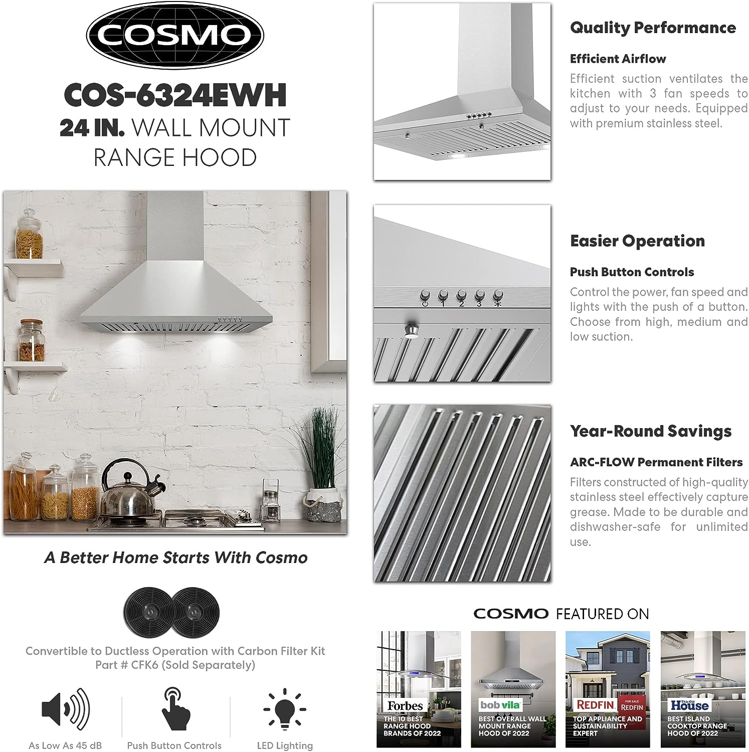 COSMO COS-6324EWH Wall Mount Range Hood. Chimney-Style Over Stove Vent. 3 Speed Fan. Permanent Filters. LED Lights in Stainless Steel (24 inch)