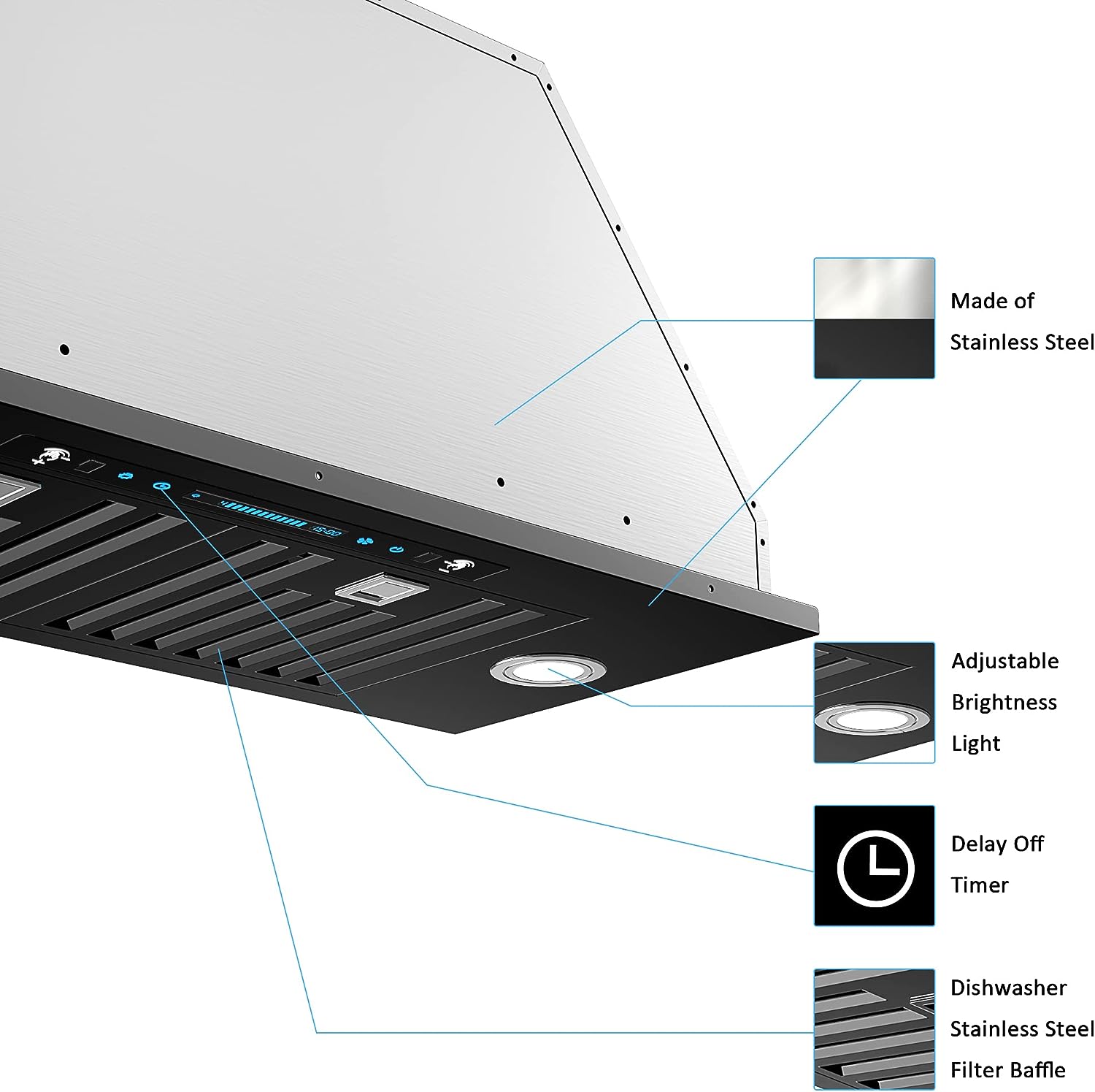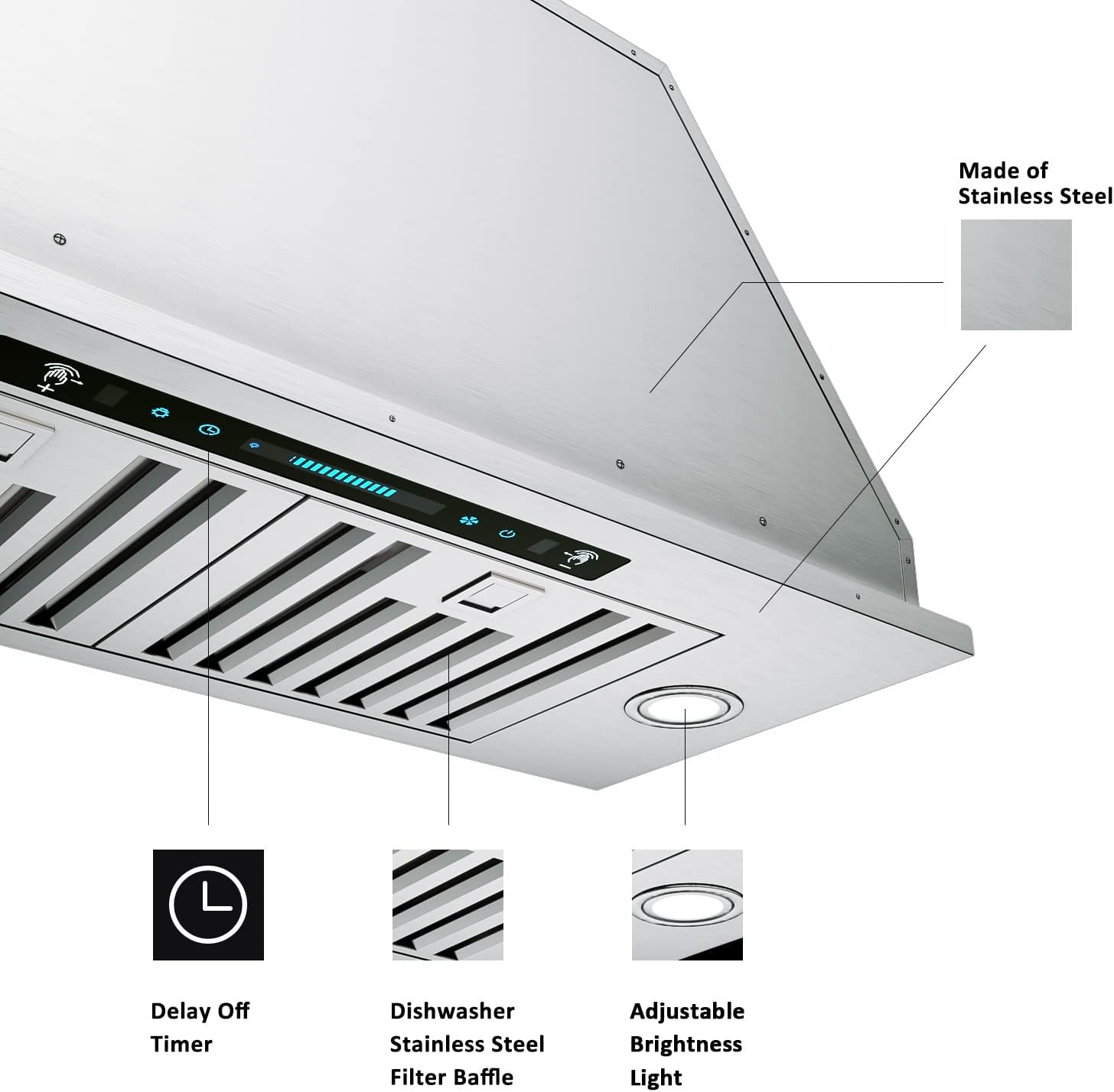 IKTCH 36 inch Built-in/Insert Range Hood 900 CFM. Ducted/Ductless Convertible Duct. Stainless Steel Kitchen Vent Hood with 4 Speed Gesture Sensing&Touch Control Panel(IKB01-36)