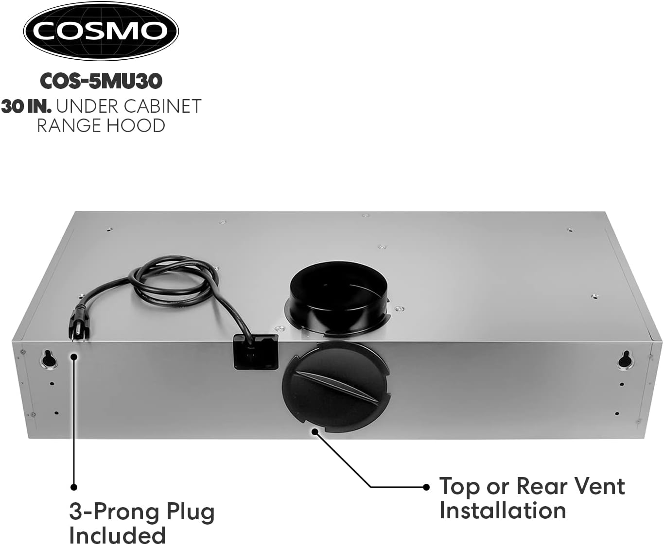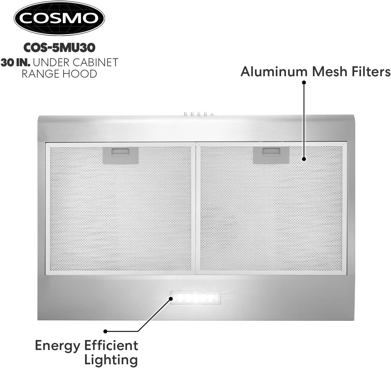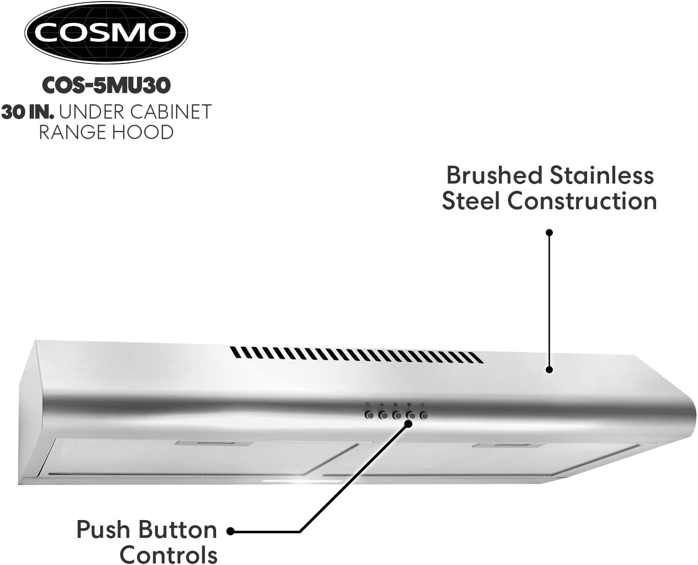 COSMO COS-5MU30 30 in. Under Cabinet Range Hood Ductless Convertible Duct. Slim Kitchen Stove Vent with. 3 Speed Exhaust Fan. Reusable Filter and LED Lights in Stainless Steel. 30 inch
