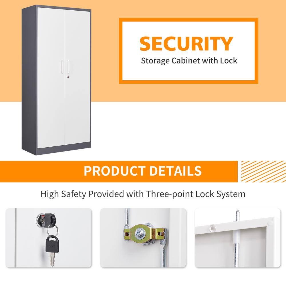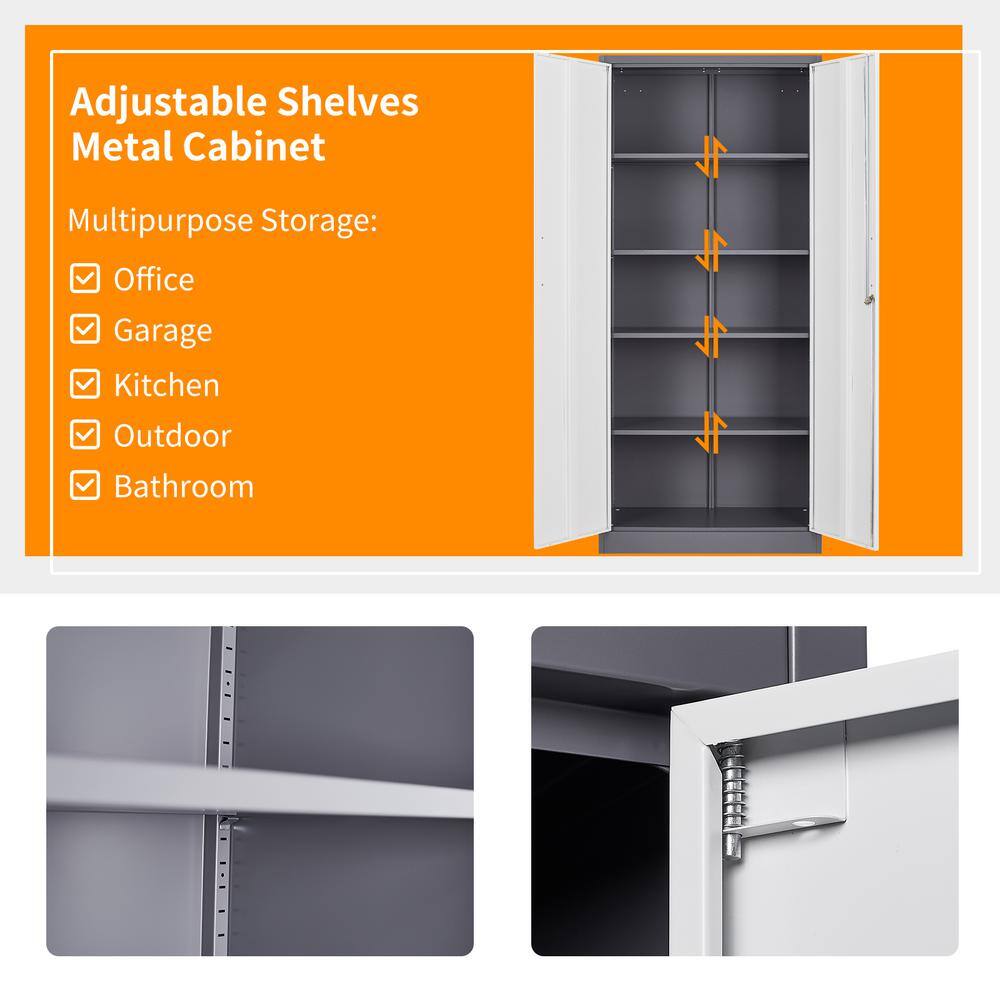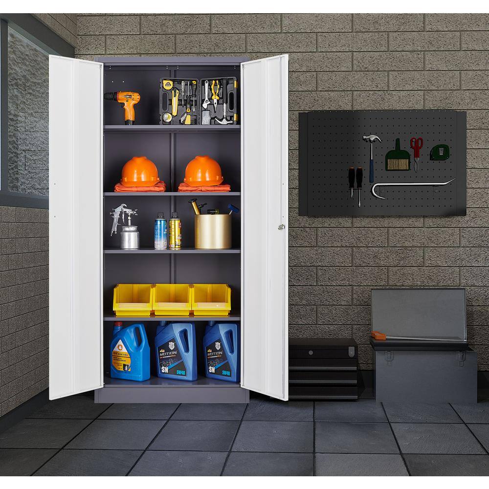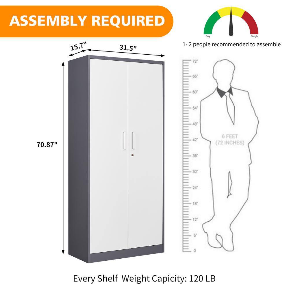 Mlezan DBXG2022122GW Metal Storage Cabinet 15.74″D x 31.5″W x 71″H in Gray White cabinet with 4 shelves and 2 doors.