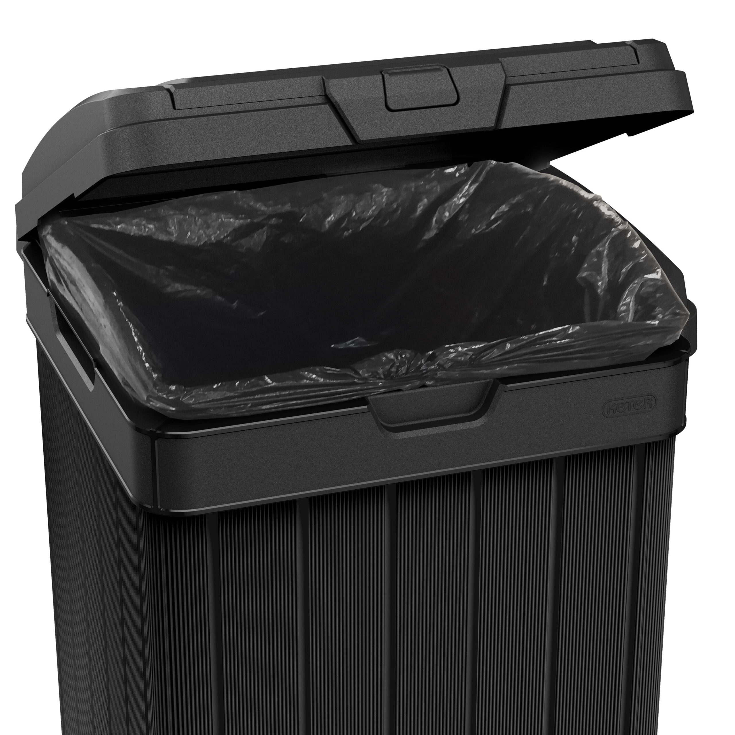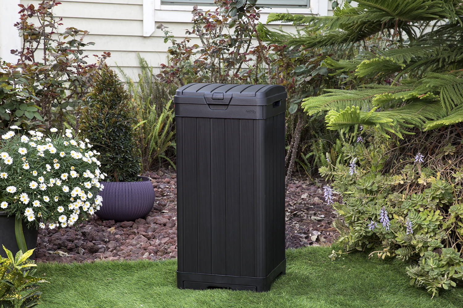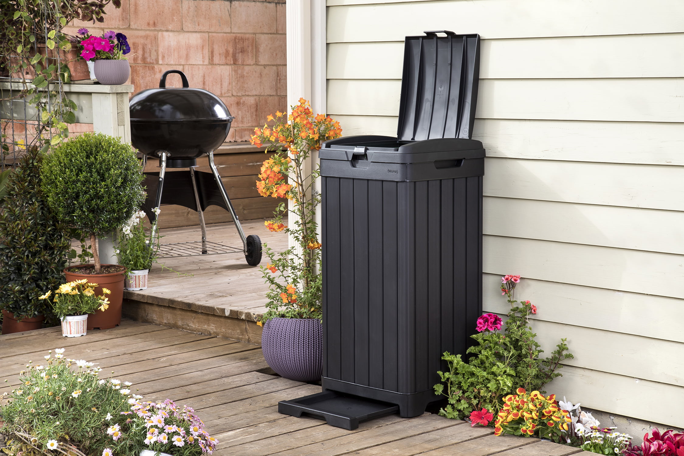 Keter Baltimore Duotech Outdoor Trash Can. Resin Wastebin. Black Woodlook