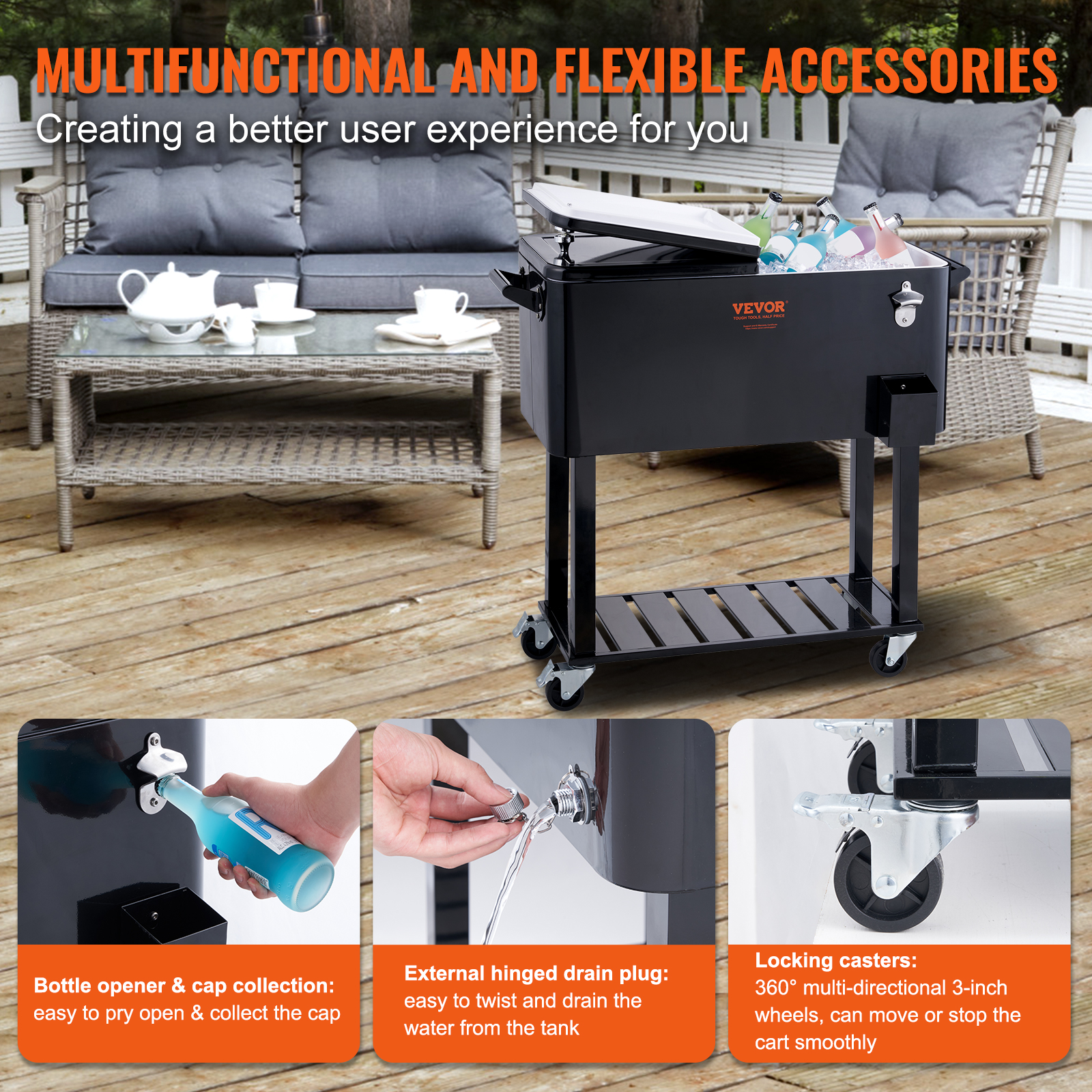 VINGLI 80 Quart Rolling Ice Chest. Steel Drink Cooler Cart for Patio Party Bar Beverage Pool with Bottle Opener. Shelf(Black)