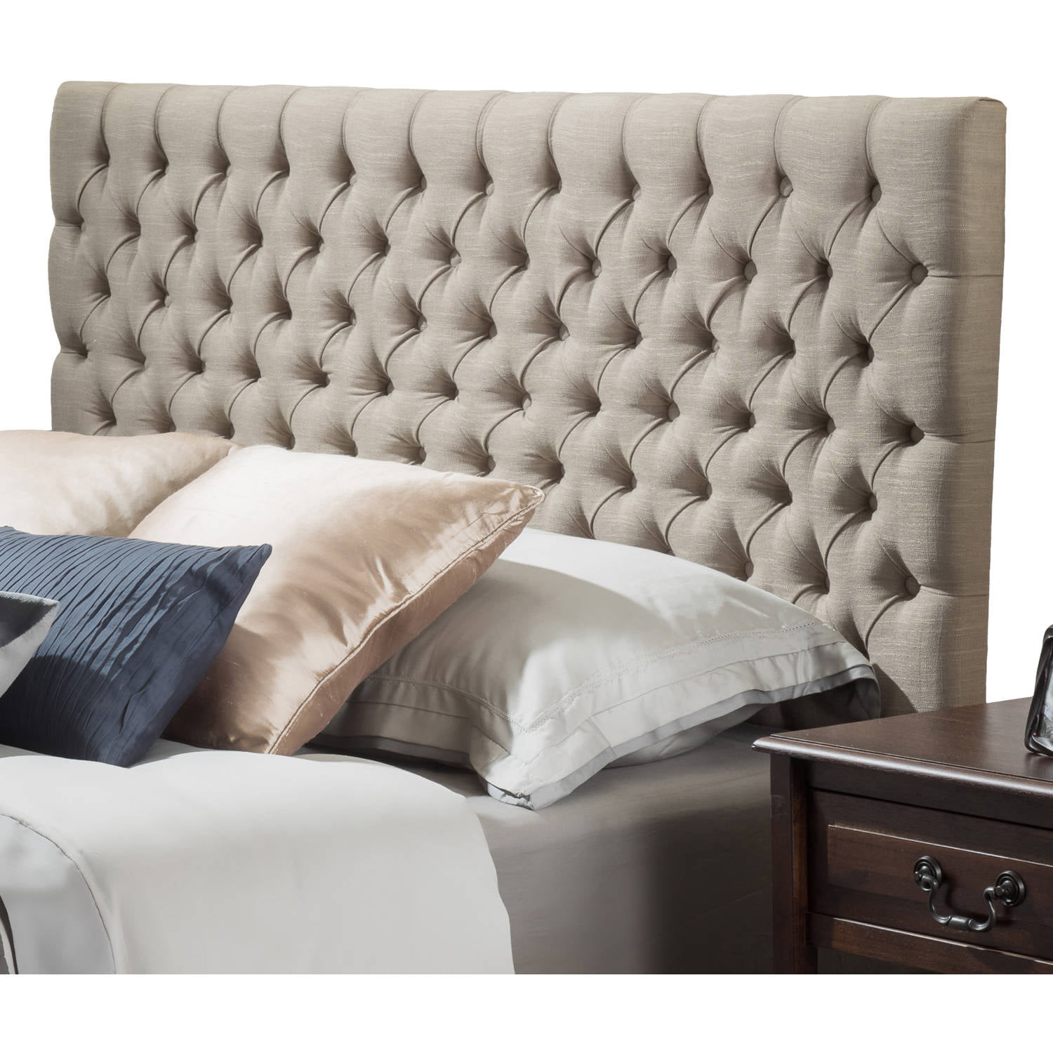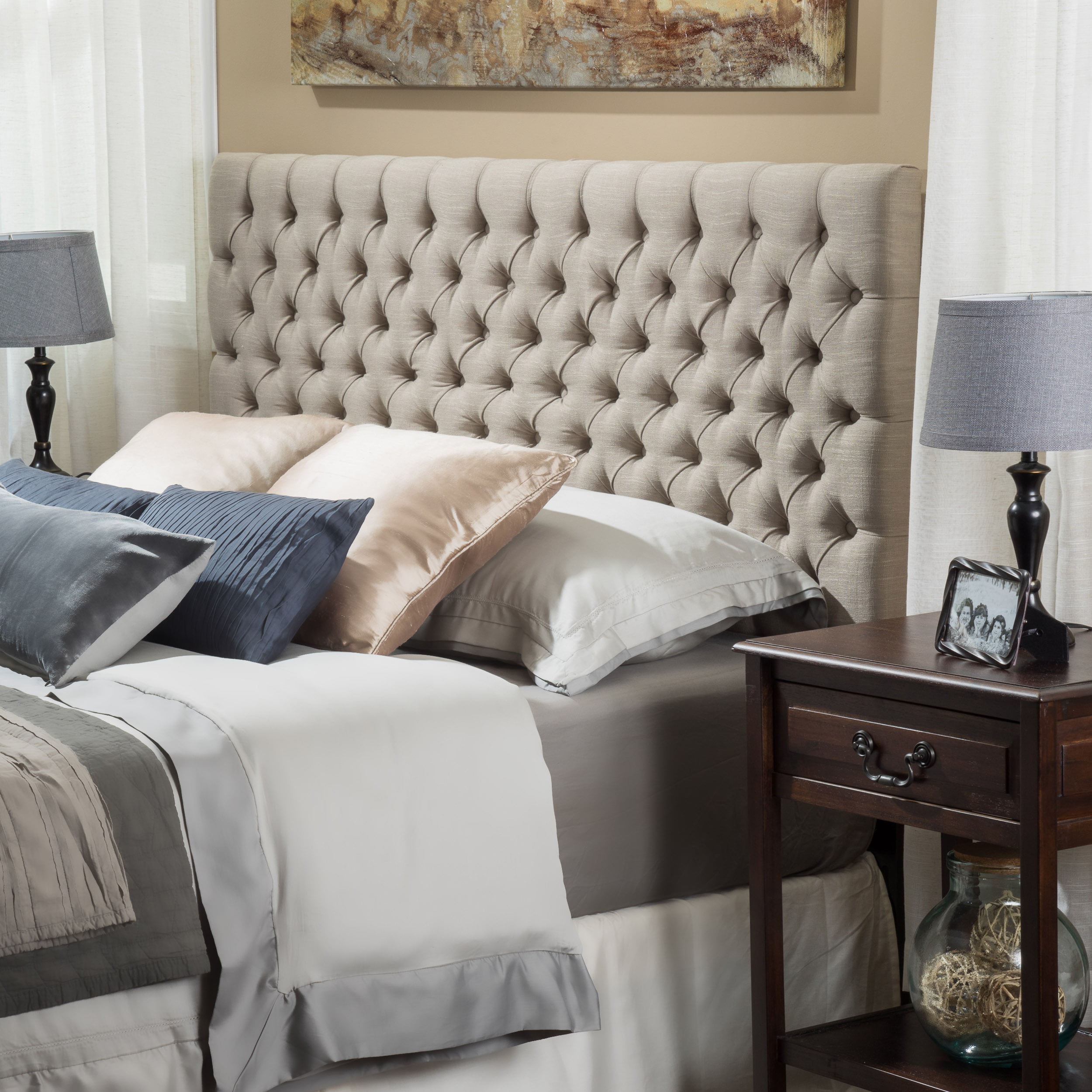 Noble House Abigail Queen Button Sand Tufted Fabric Headboard. Beige