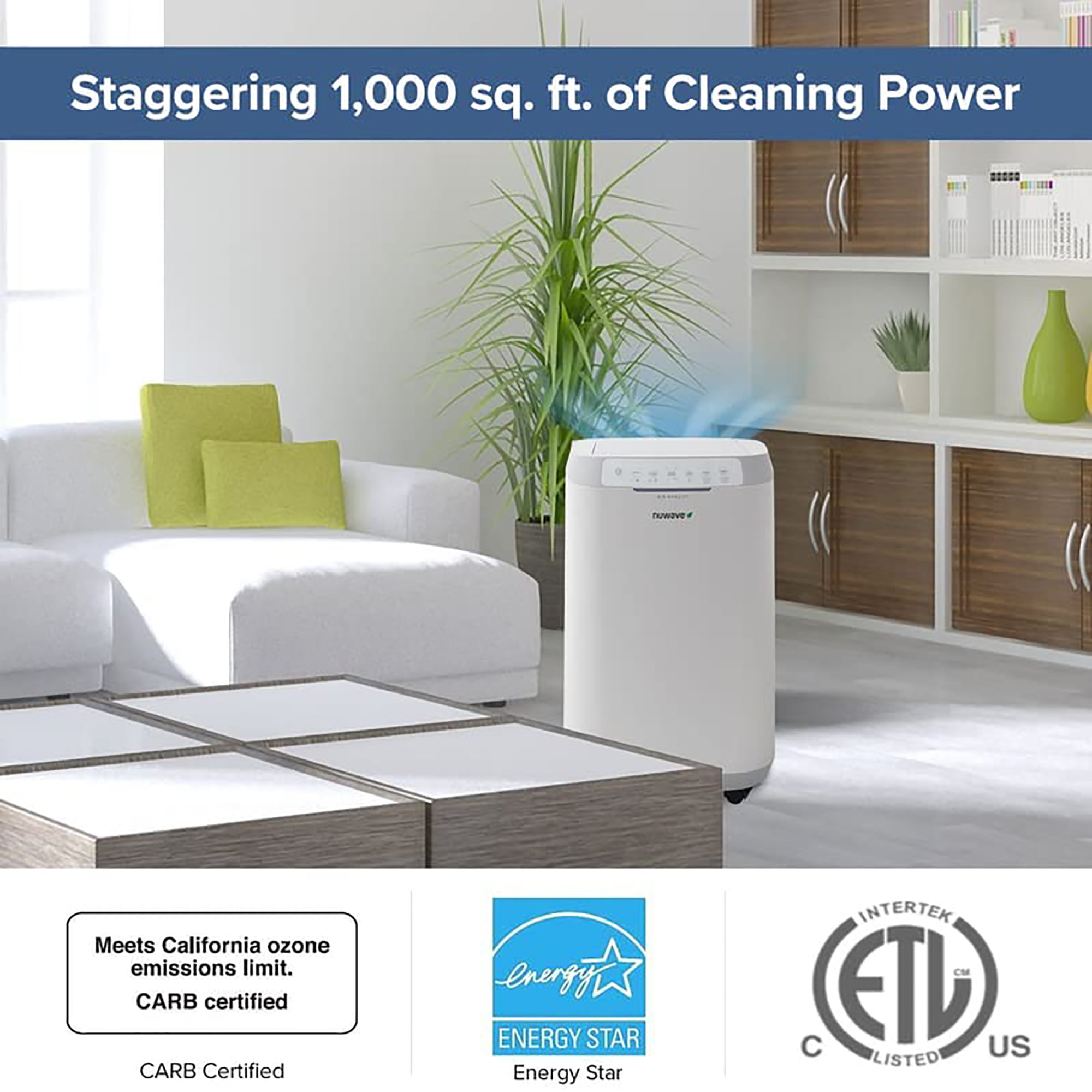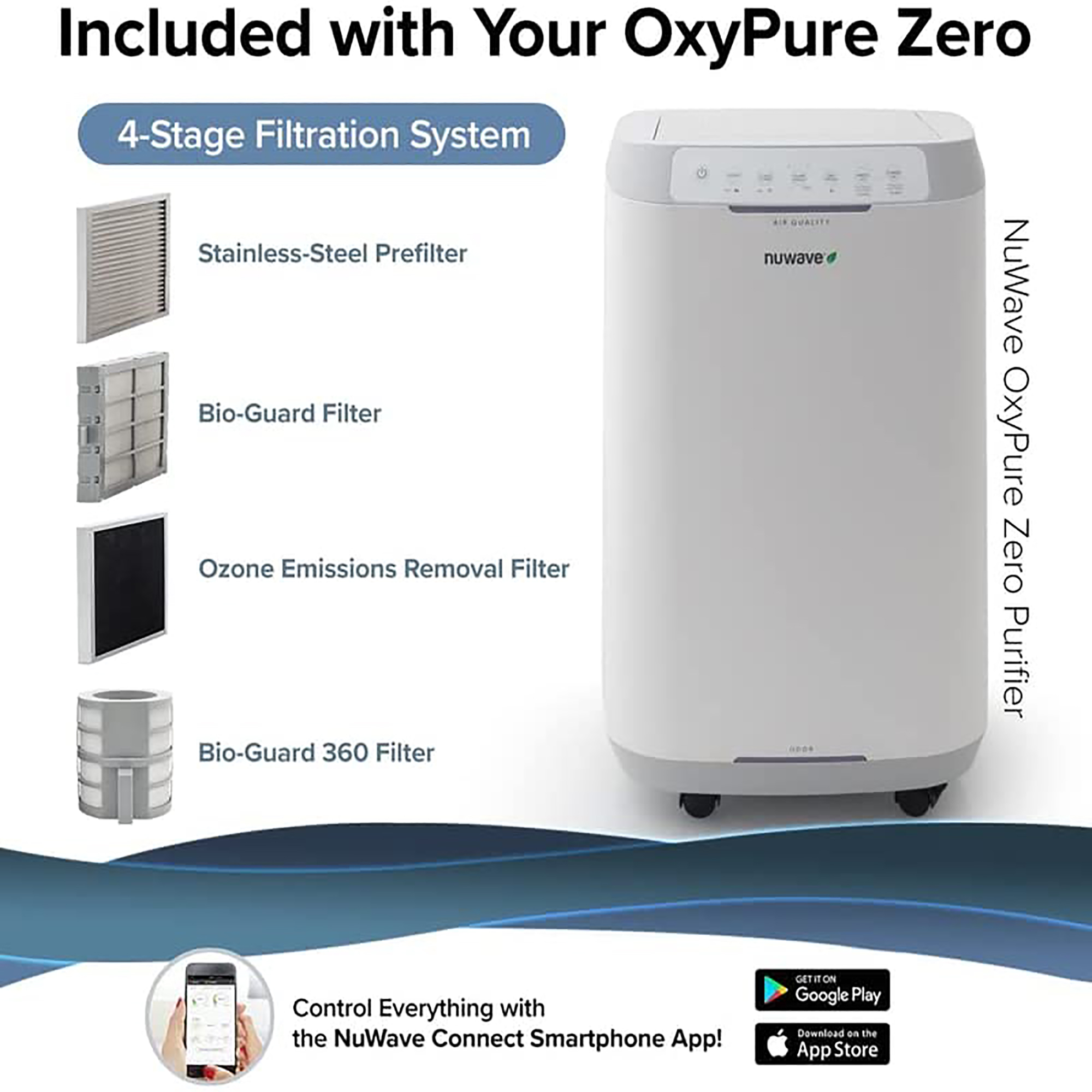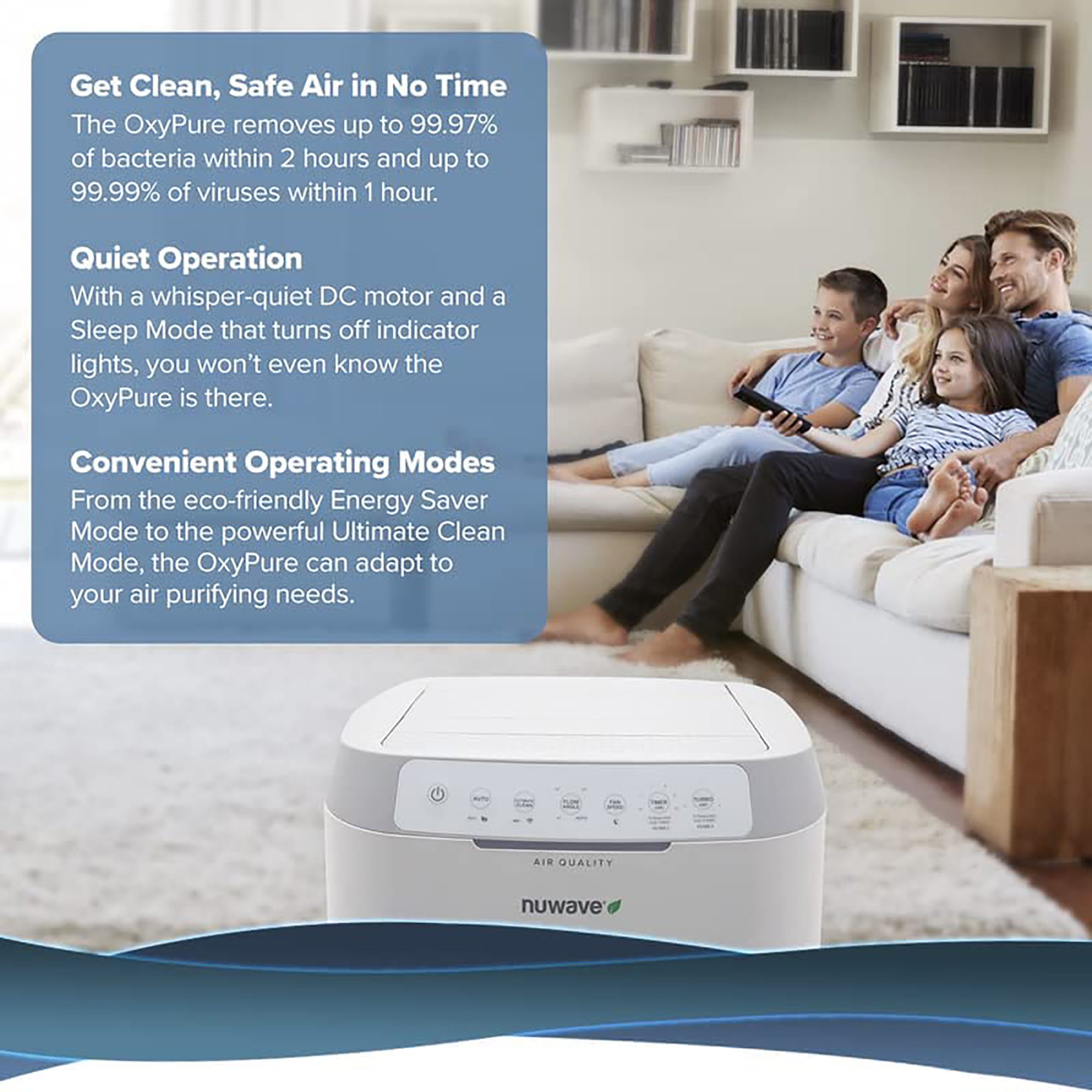 NUWAVE OxyPure Zero Bio-Guard Air Purifier. Never Purchase Replacement Filters Again. Cleans 1000 sq.ft.. Captures and Eliminates Dust. Pollen. Pet Dander. Lead. Formaldehyde. Gases. VOCs