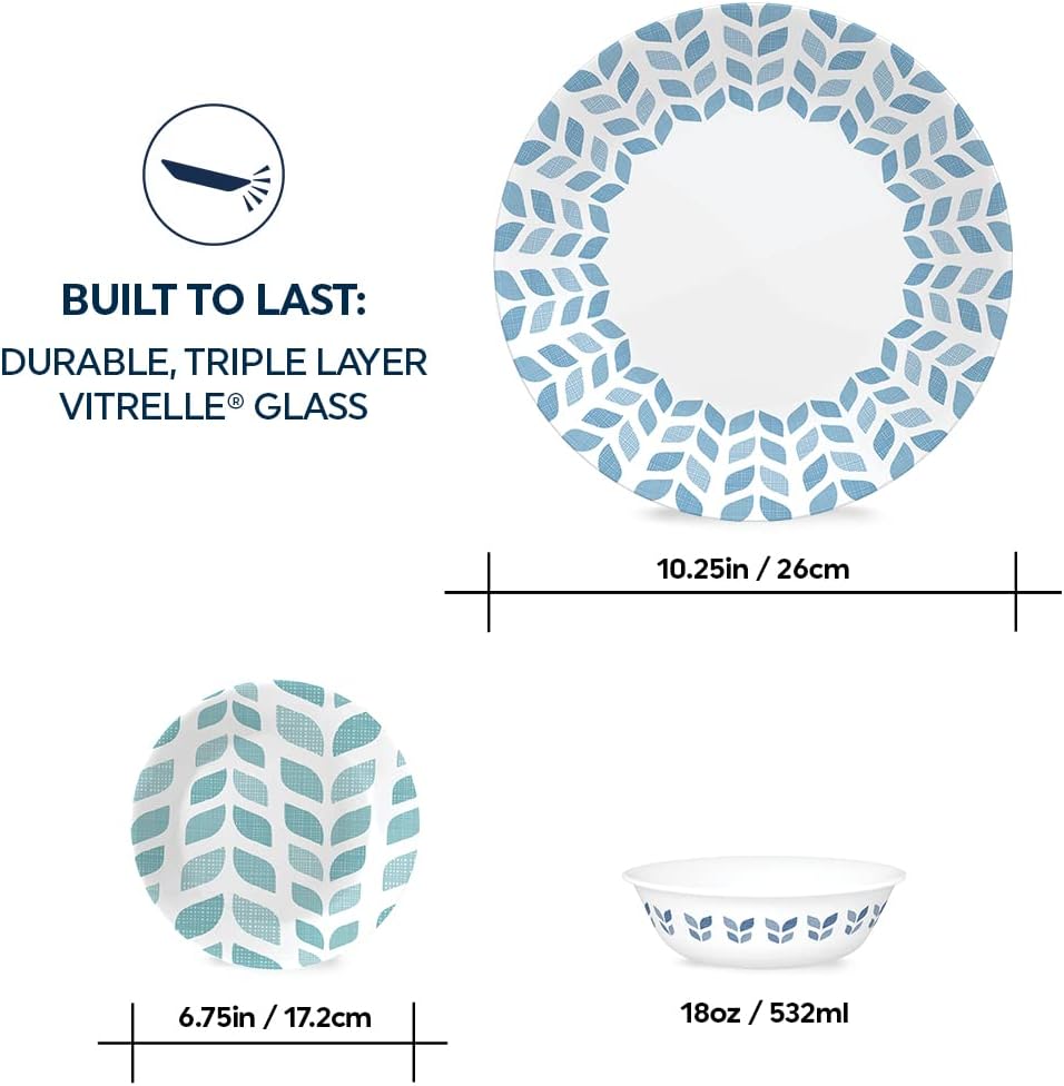 Corelle Global Collection Vitrelle 18-Piece Dinnerware Set. Triple Layer Recycled Glass. Lightweight Eco-Friendly Round Plates and Bowls Set. Northern Pines