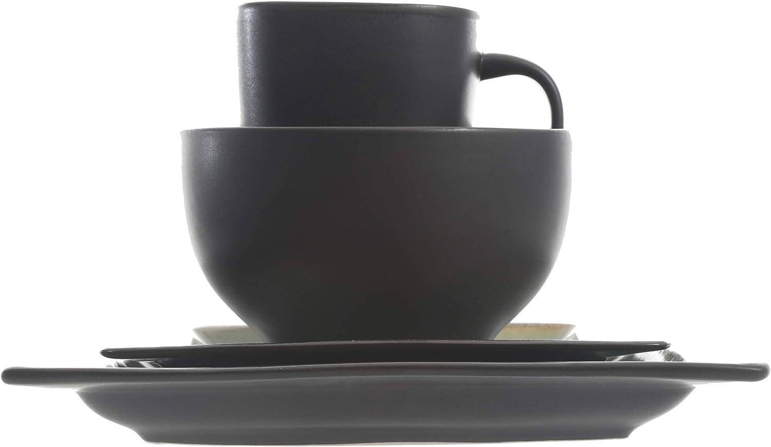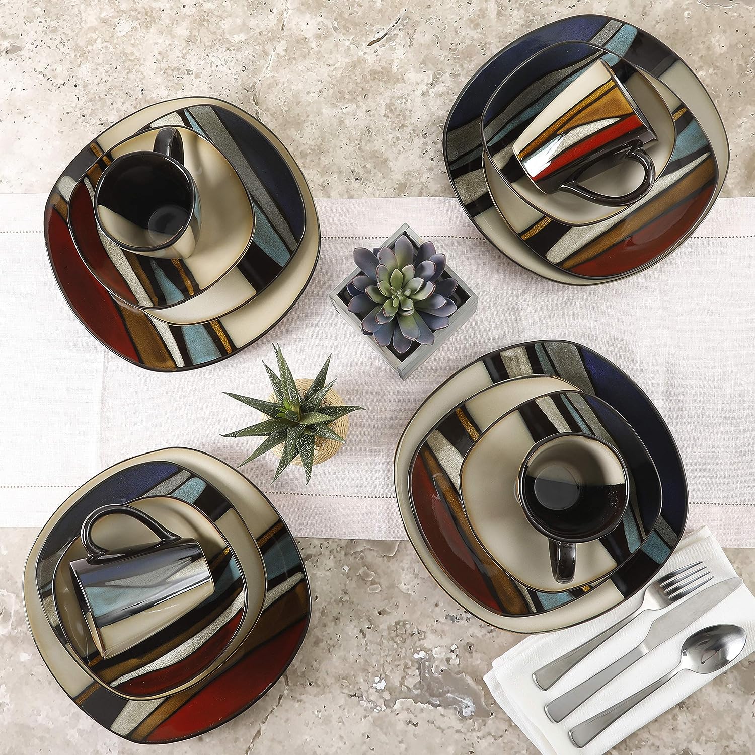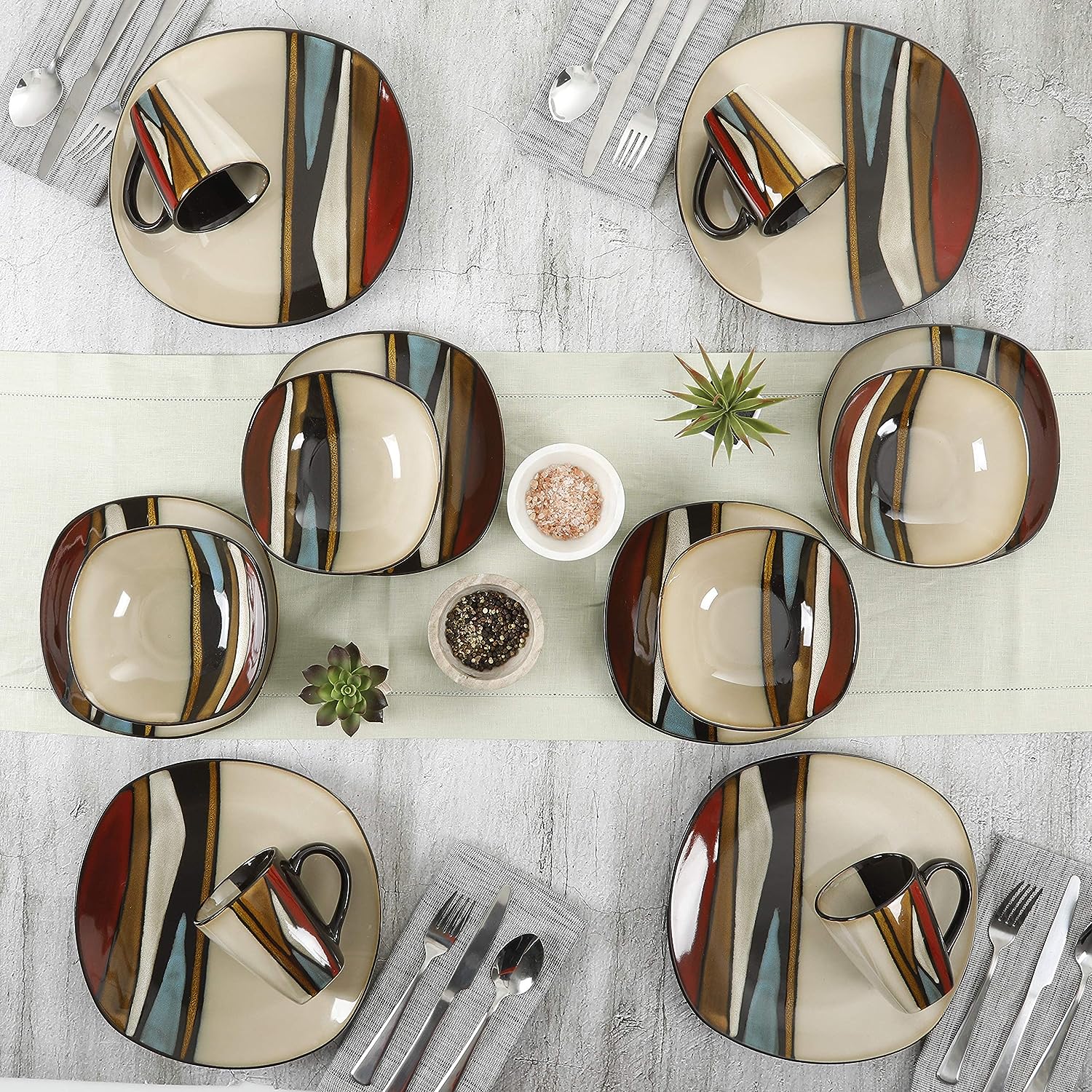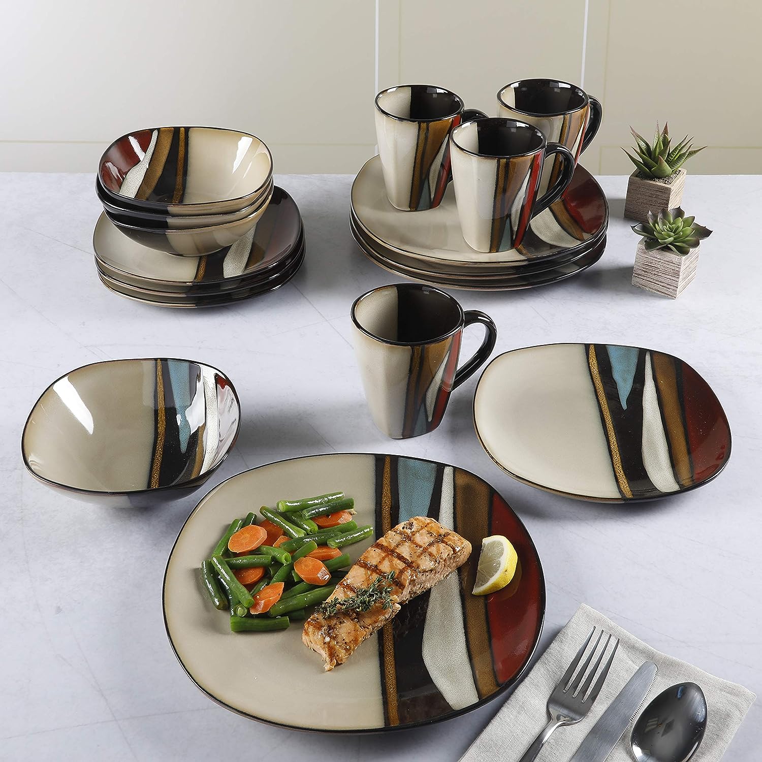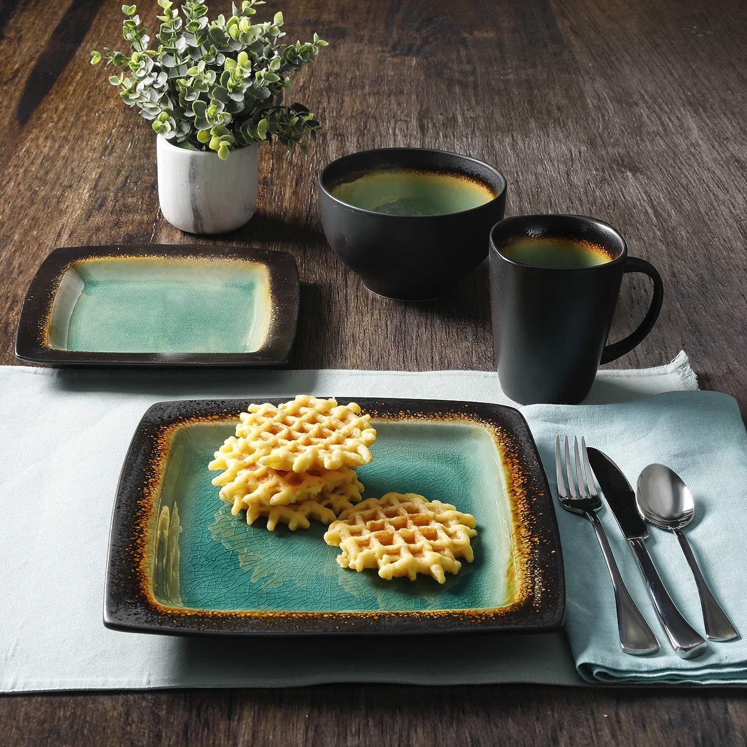 Gibson Elite Ocean Paradise Square Reactive Glaze Stoneware Dinnerware Set. Service for 4 (16pcs). Jade