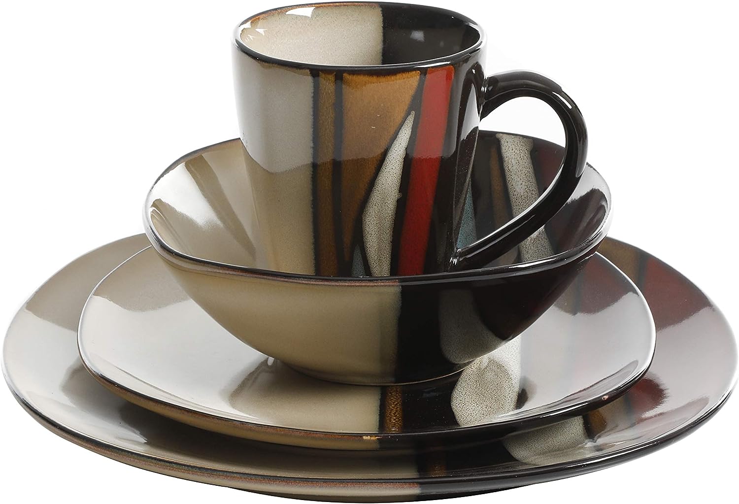 Gibson Elite Volterra Square Reactive Glaze Stoneware Dinnerware Set. Service for 4 (16pcs). Red and Grey