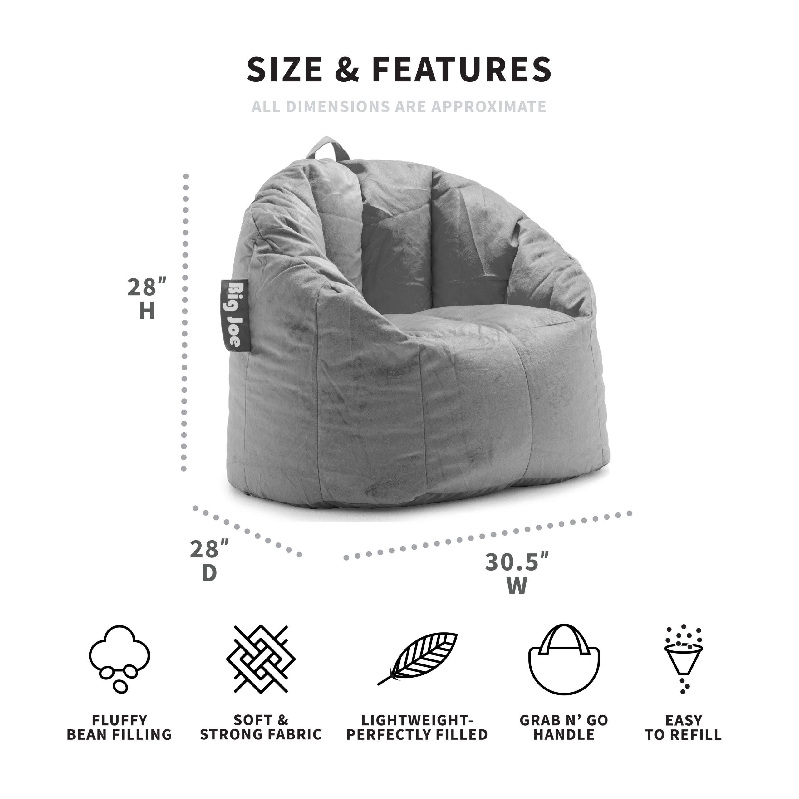 Big Joe Milano Bean Bag Chair. Plush 2.5ft. Gray