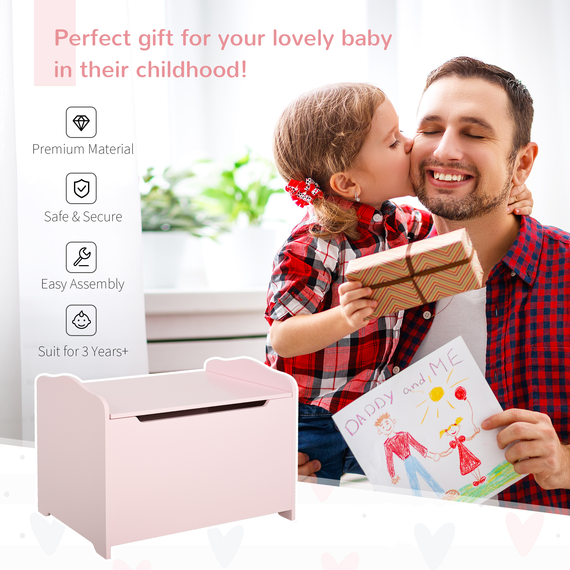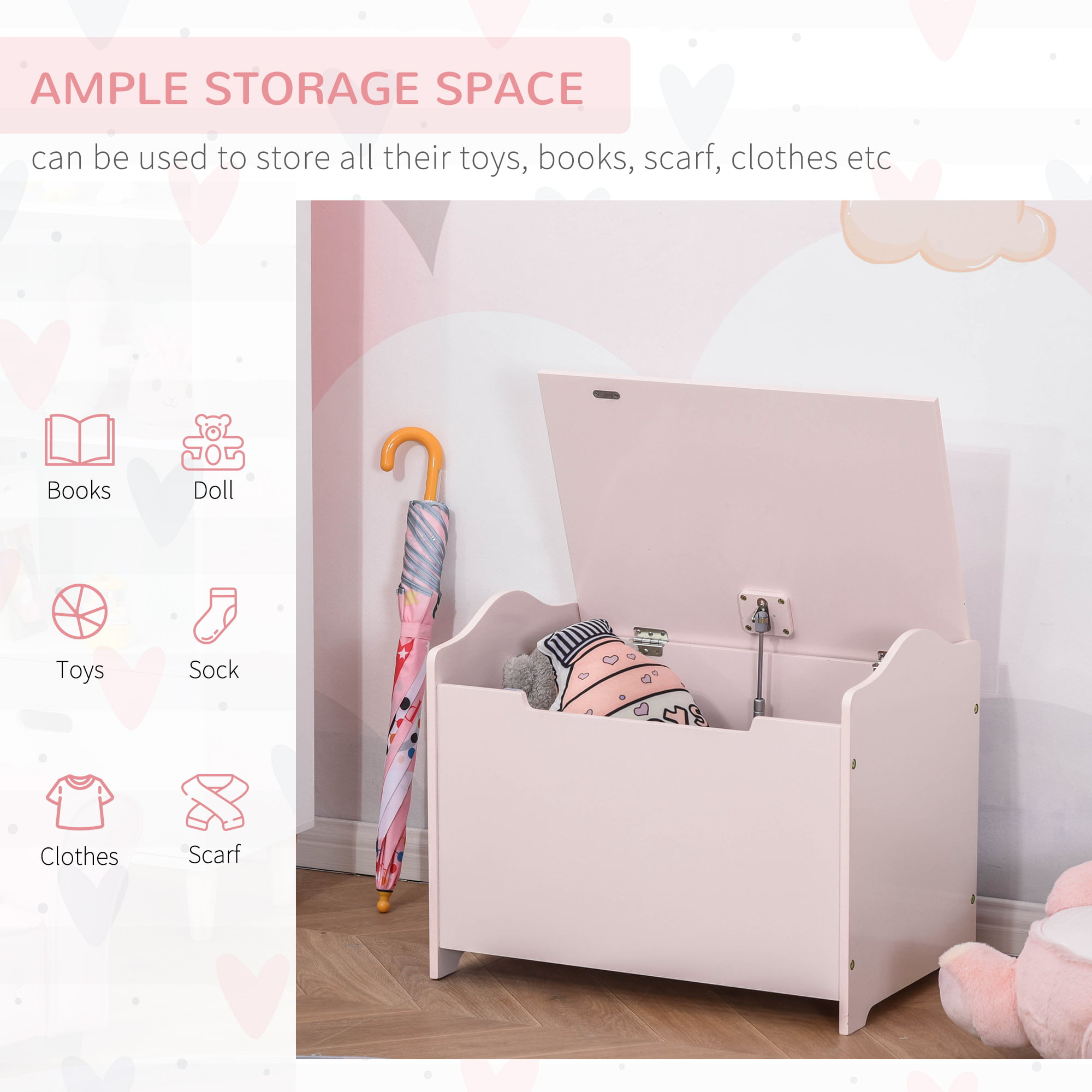 Qaba Kids Toy Chest Wooden Toy Storage Organizer Chest Box with Magnetic Hinge. Large Storage Space. & Groove Handle. Pink