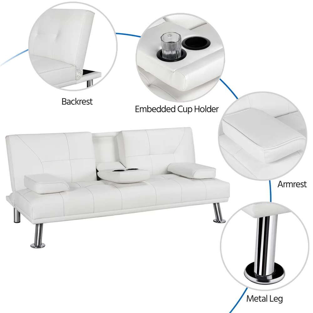 Easyfashion LuxuryGoods Modern Faux Leather Futon with Cupholders and Pillows. White