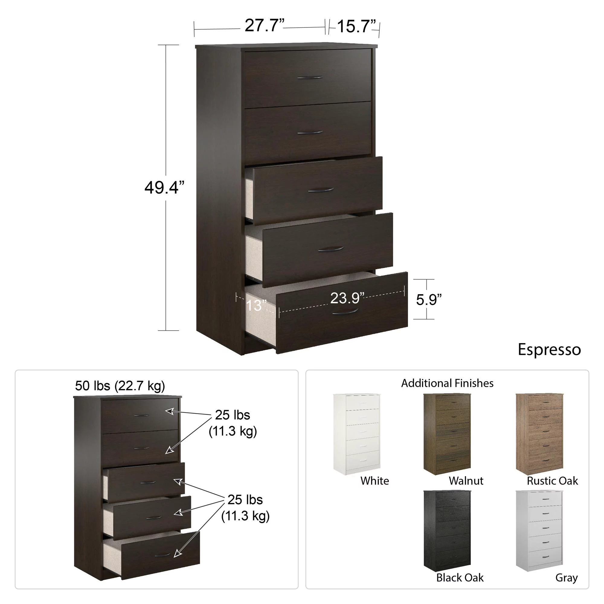 Mainstays Classic 5 Drawer Dresser. Walnut