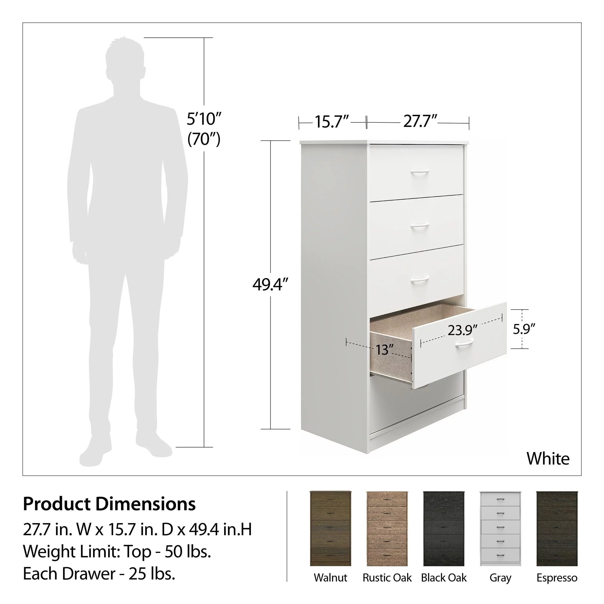 Mainstays Classic 5 Drawer Dresser. White