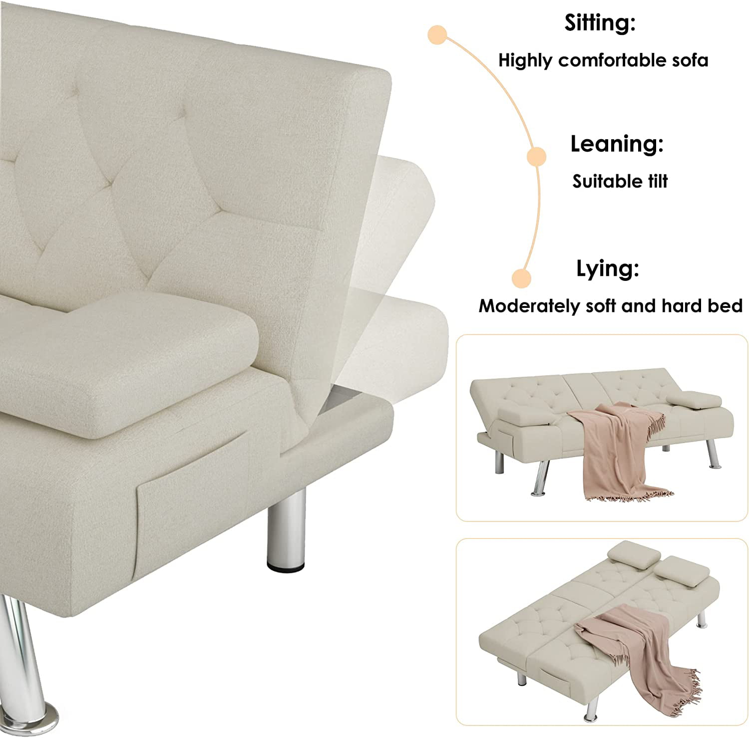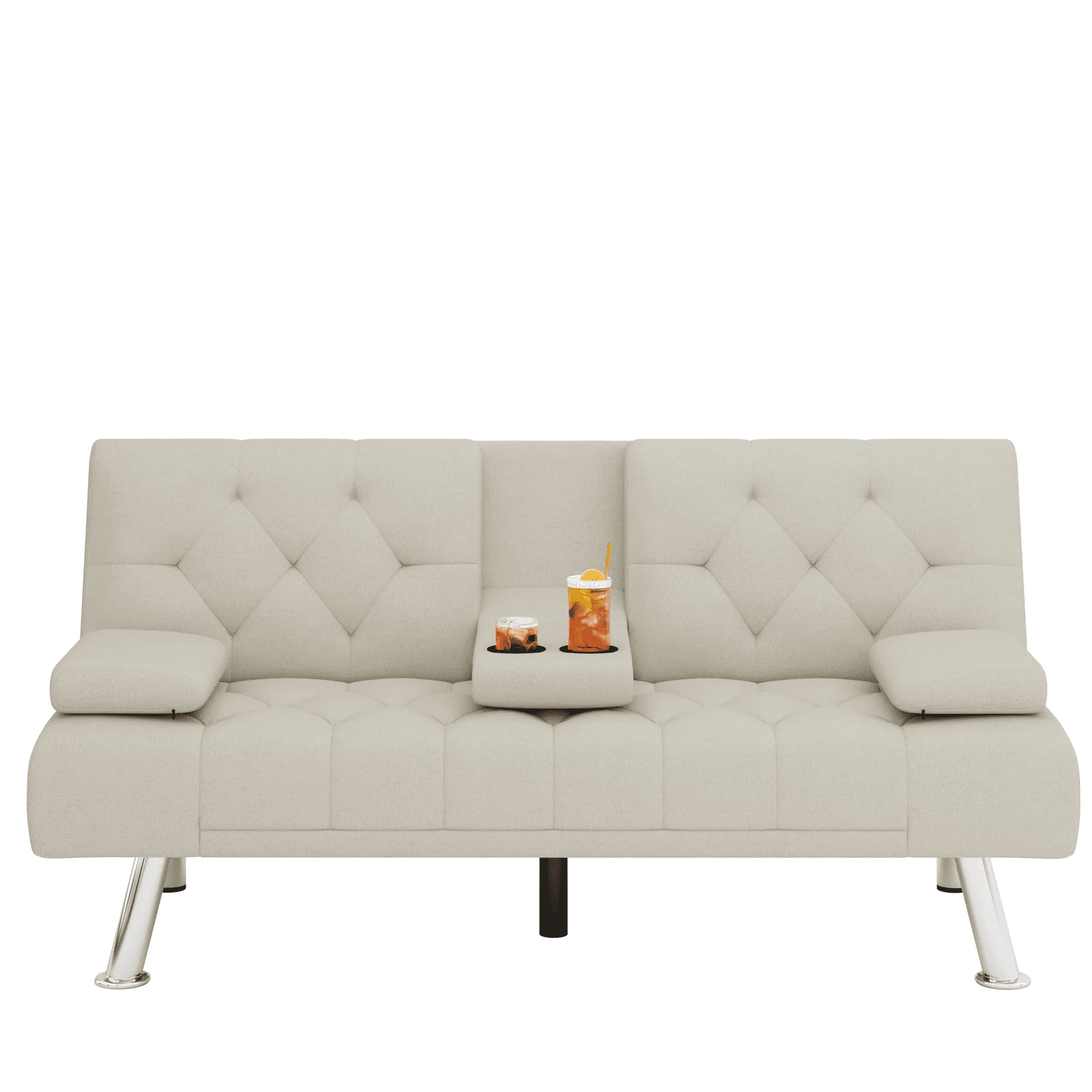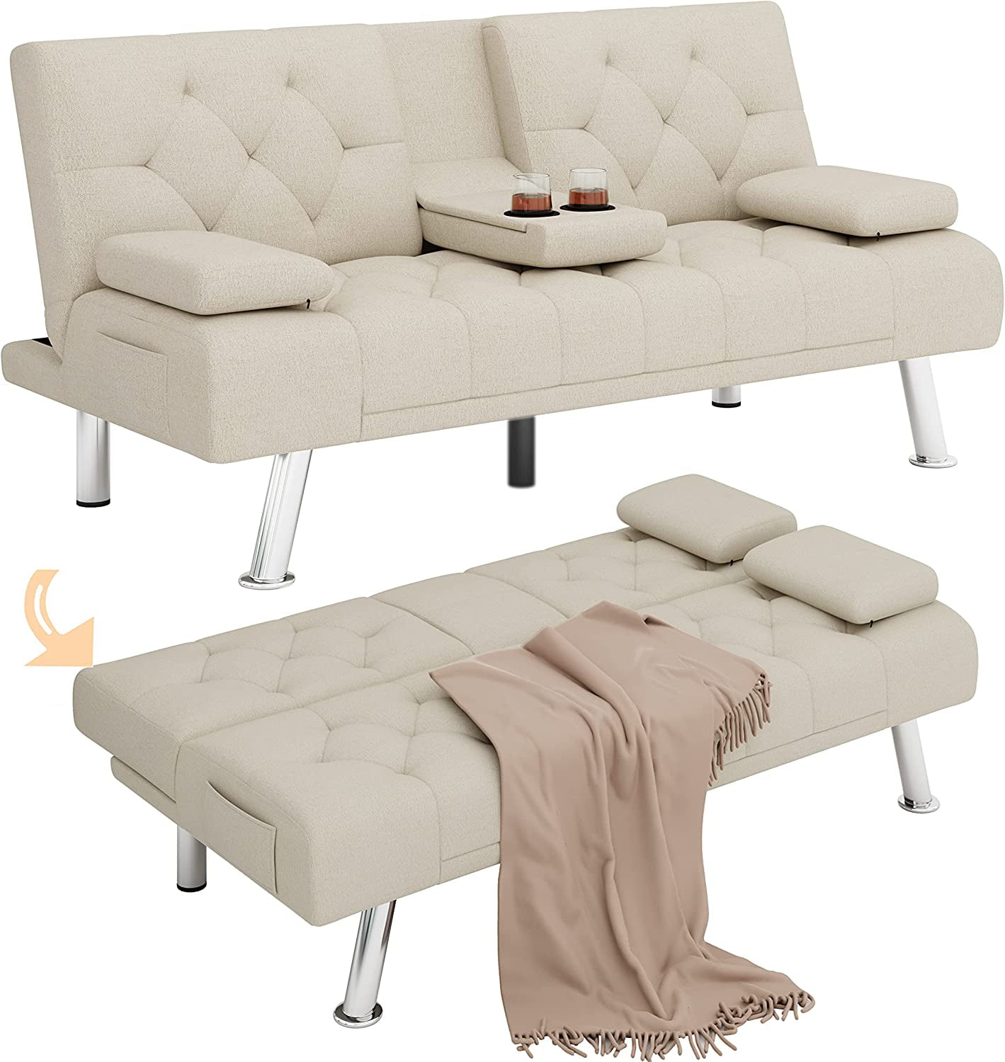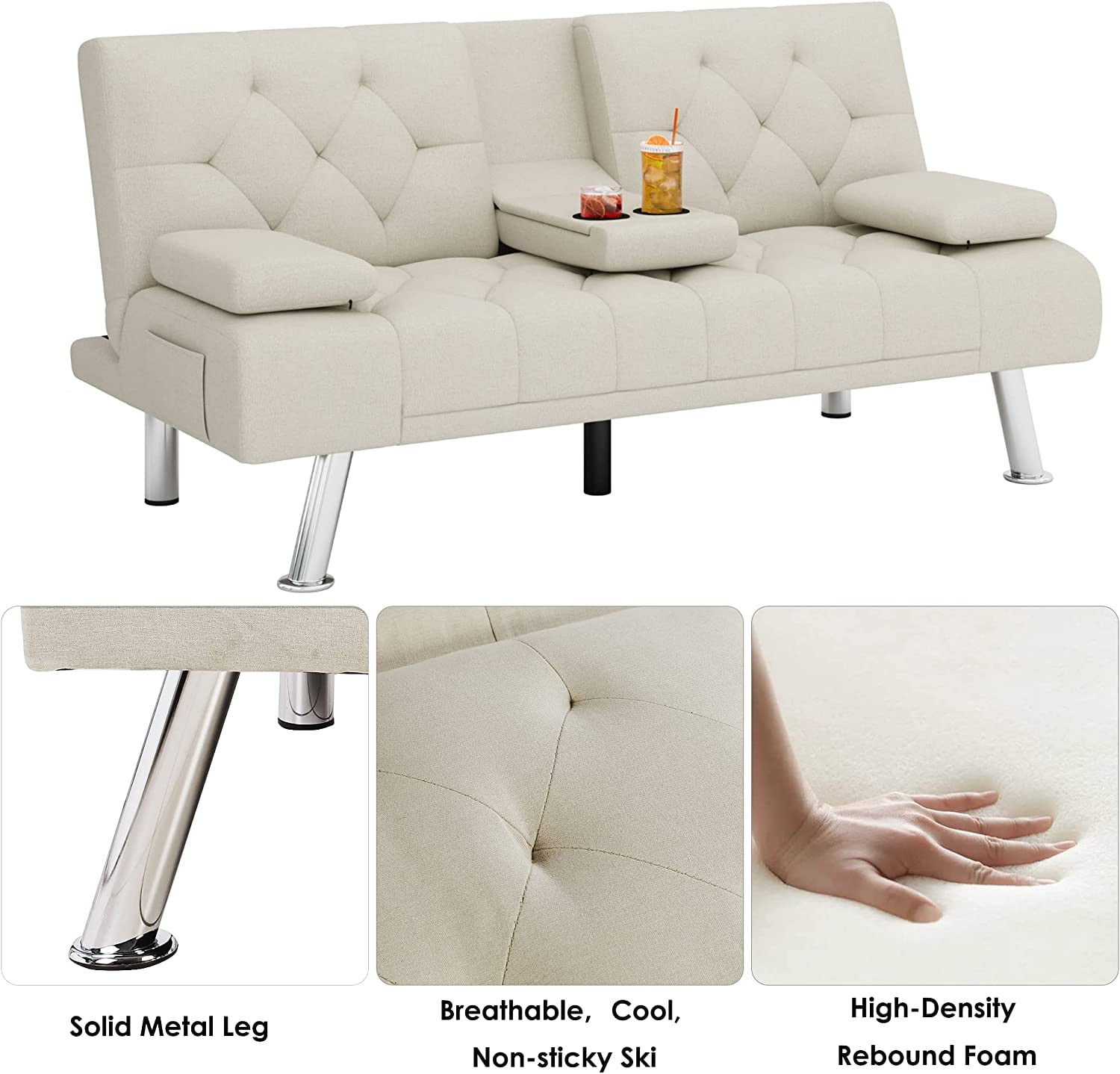 Homfa Upholstered Sofa Bed Couch. Convertible Futon Sleeper Sofa with Removable Armrests and 2 Cup Holders. Cream White