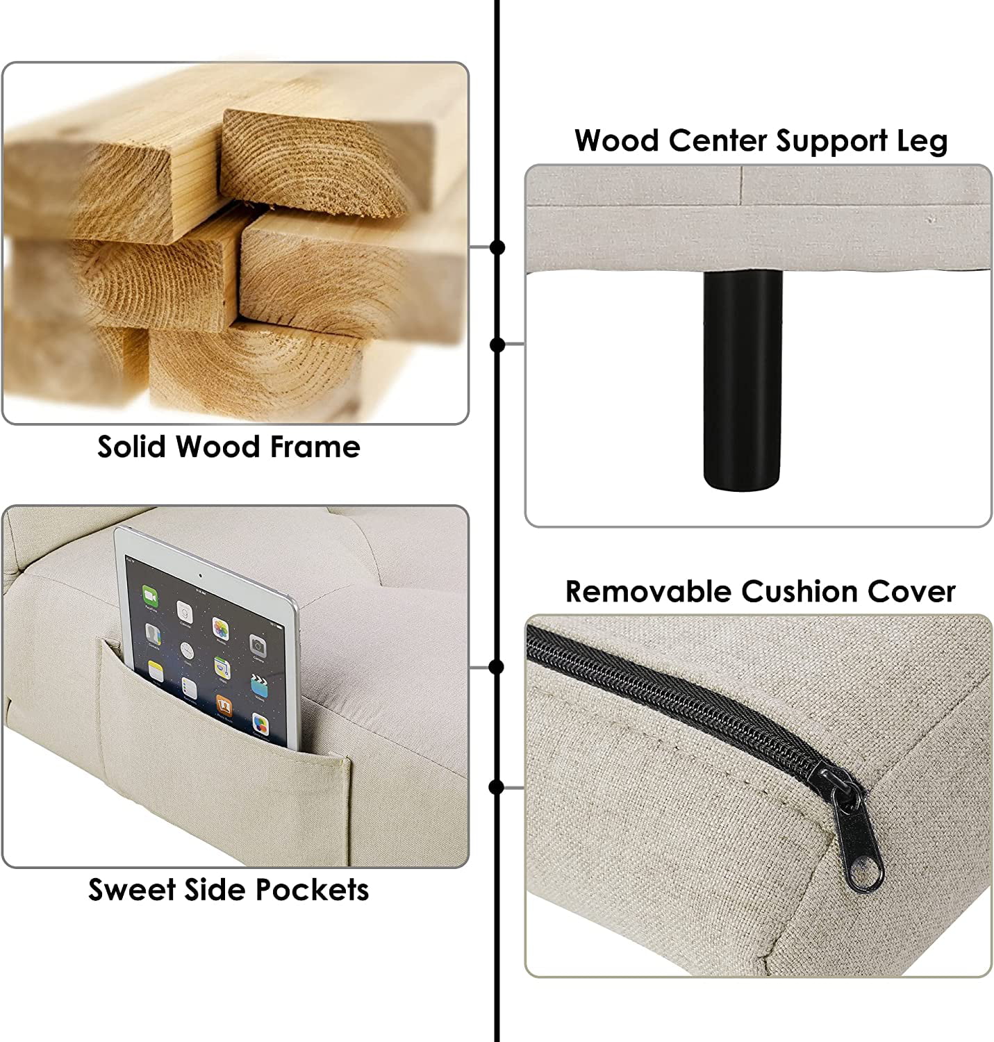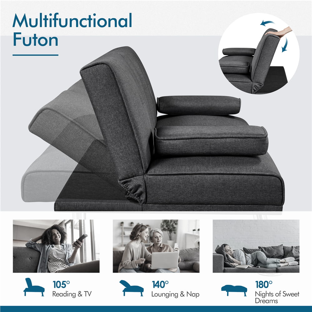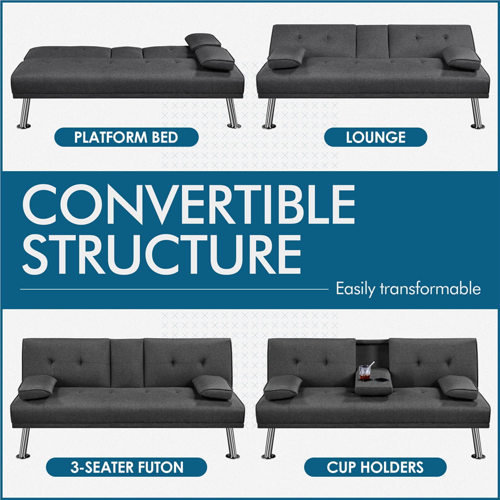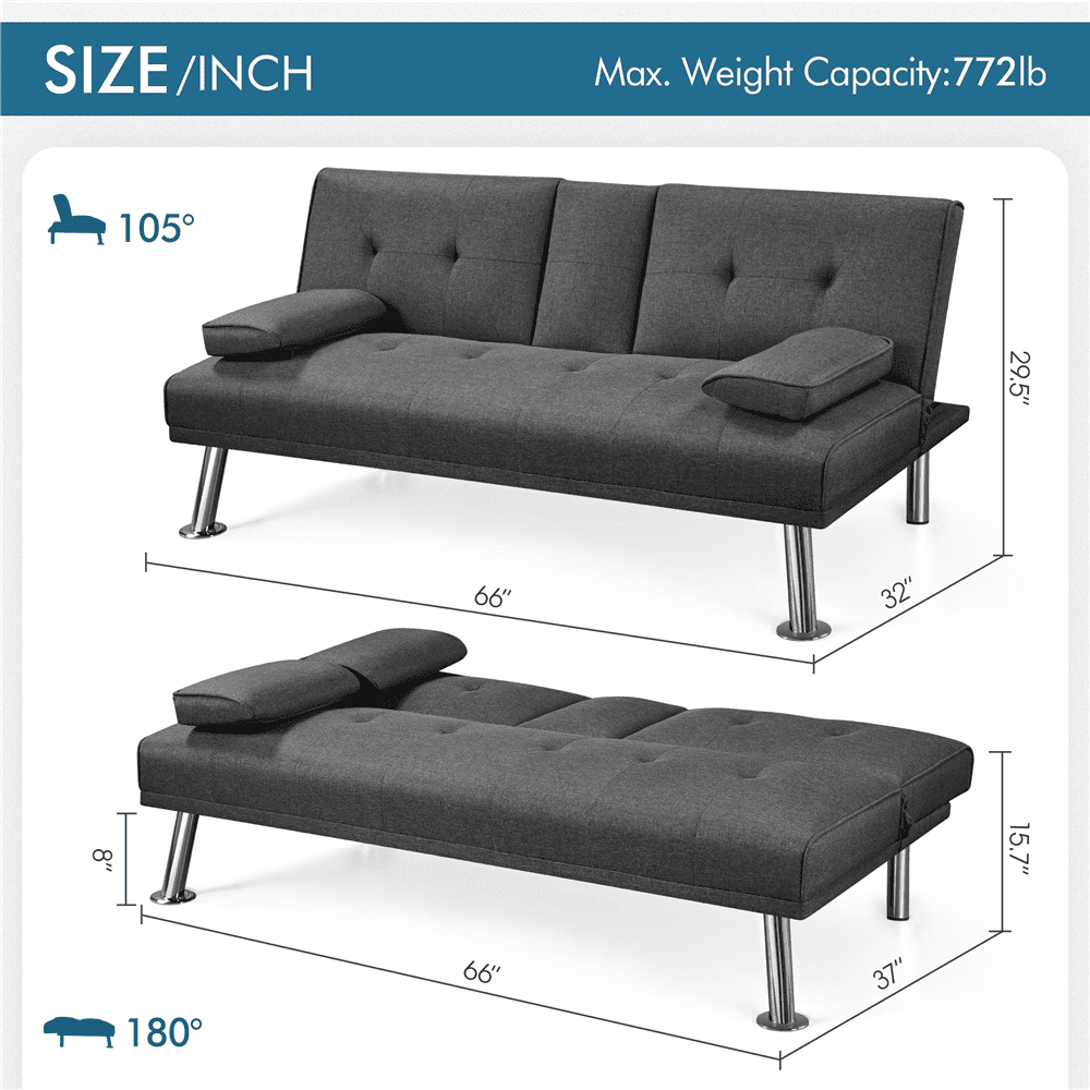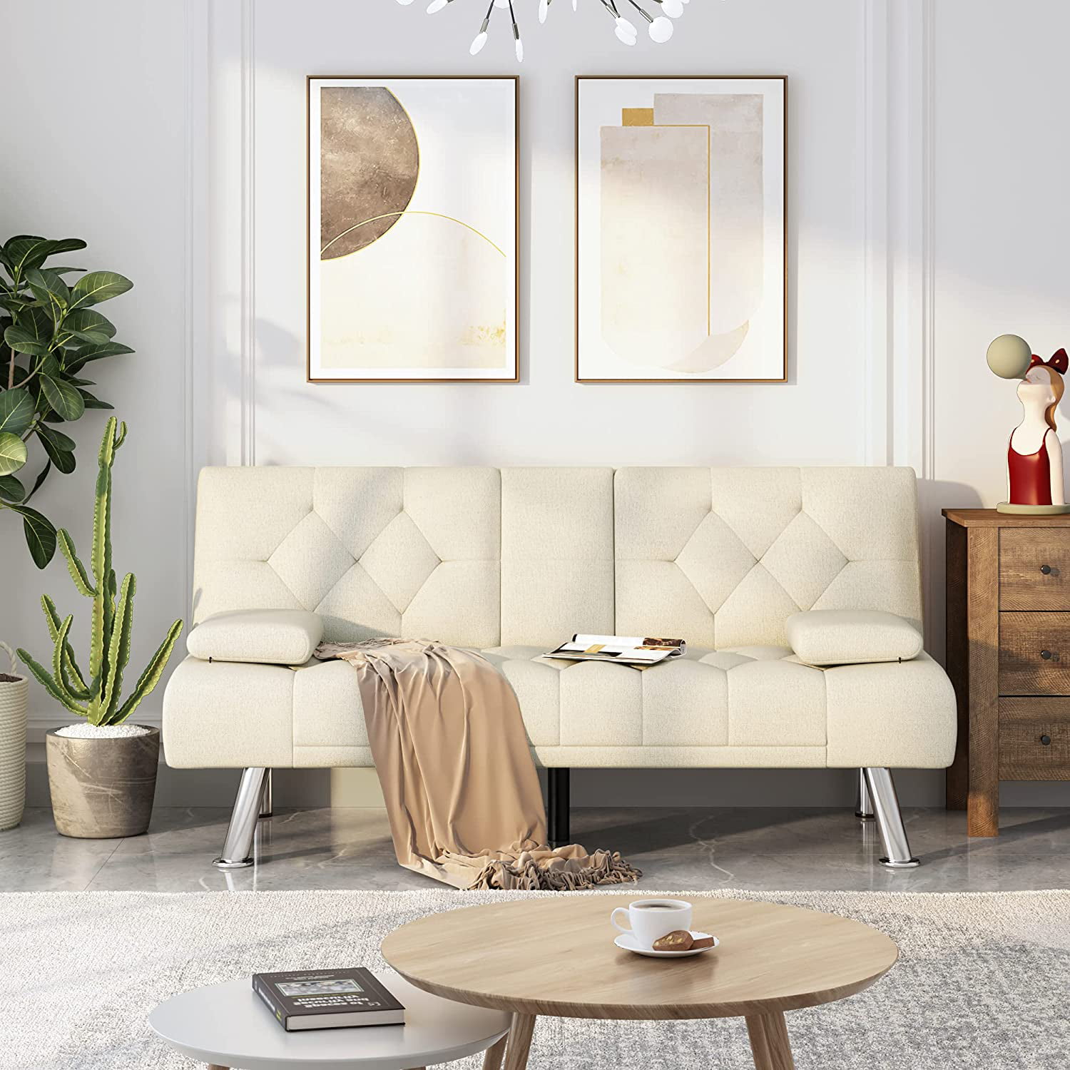 Homfa Upholstered Sofa Bed Couch. Convertible Futon Sleeper Sofa with Removable Armrests and 2 Cup Holders. Cream White