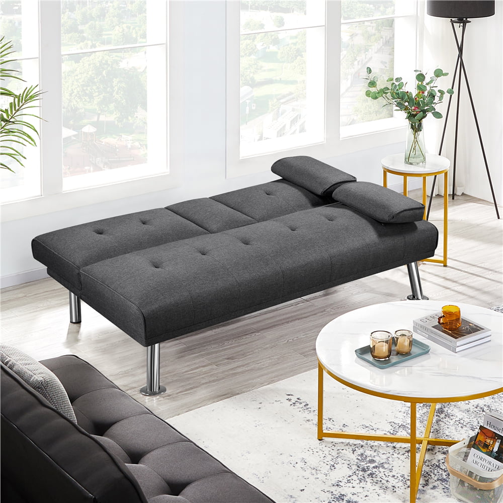 Easyfashion Modern Fabric Reclining Futon with Cupholders and Pillows. Gray