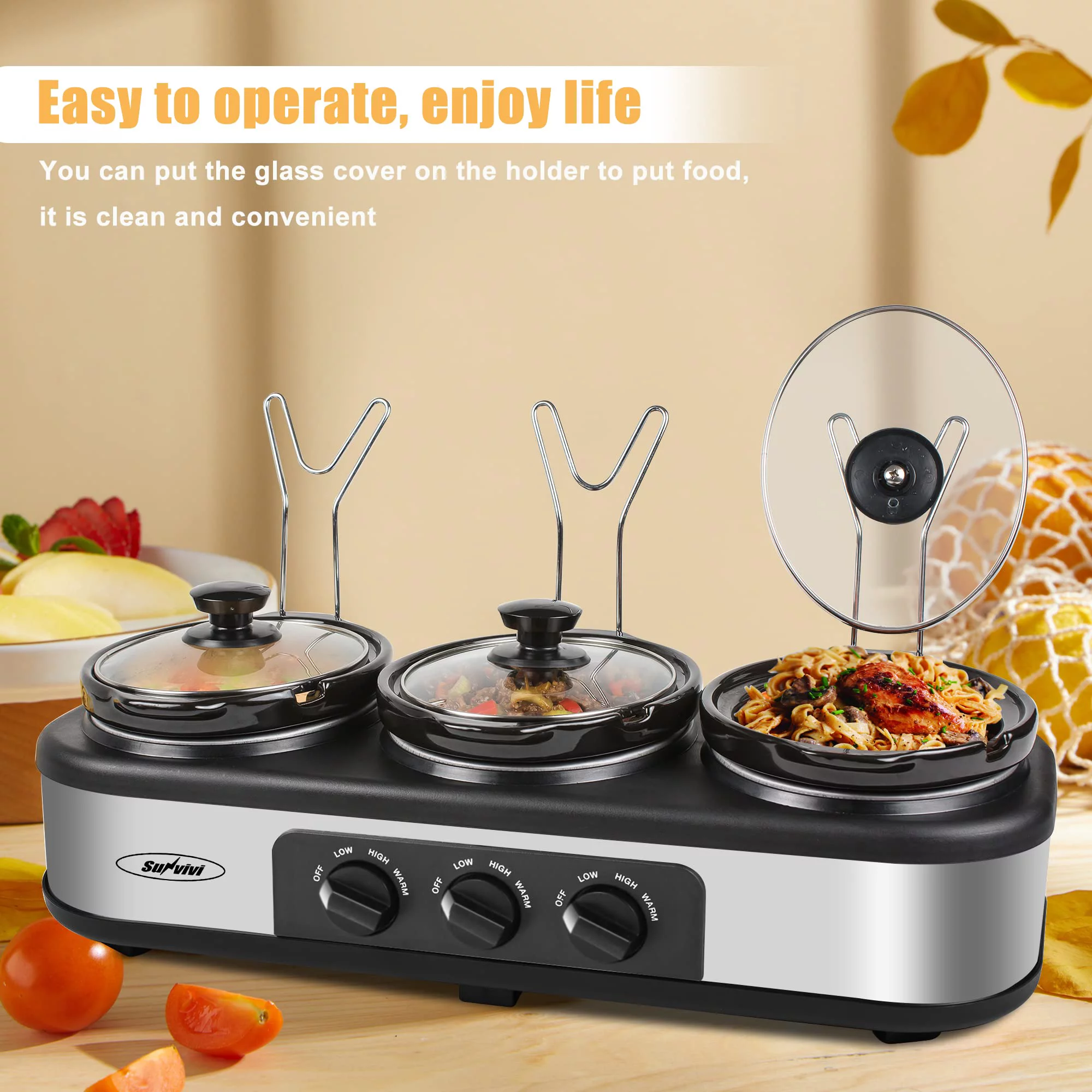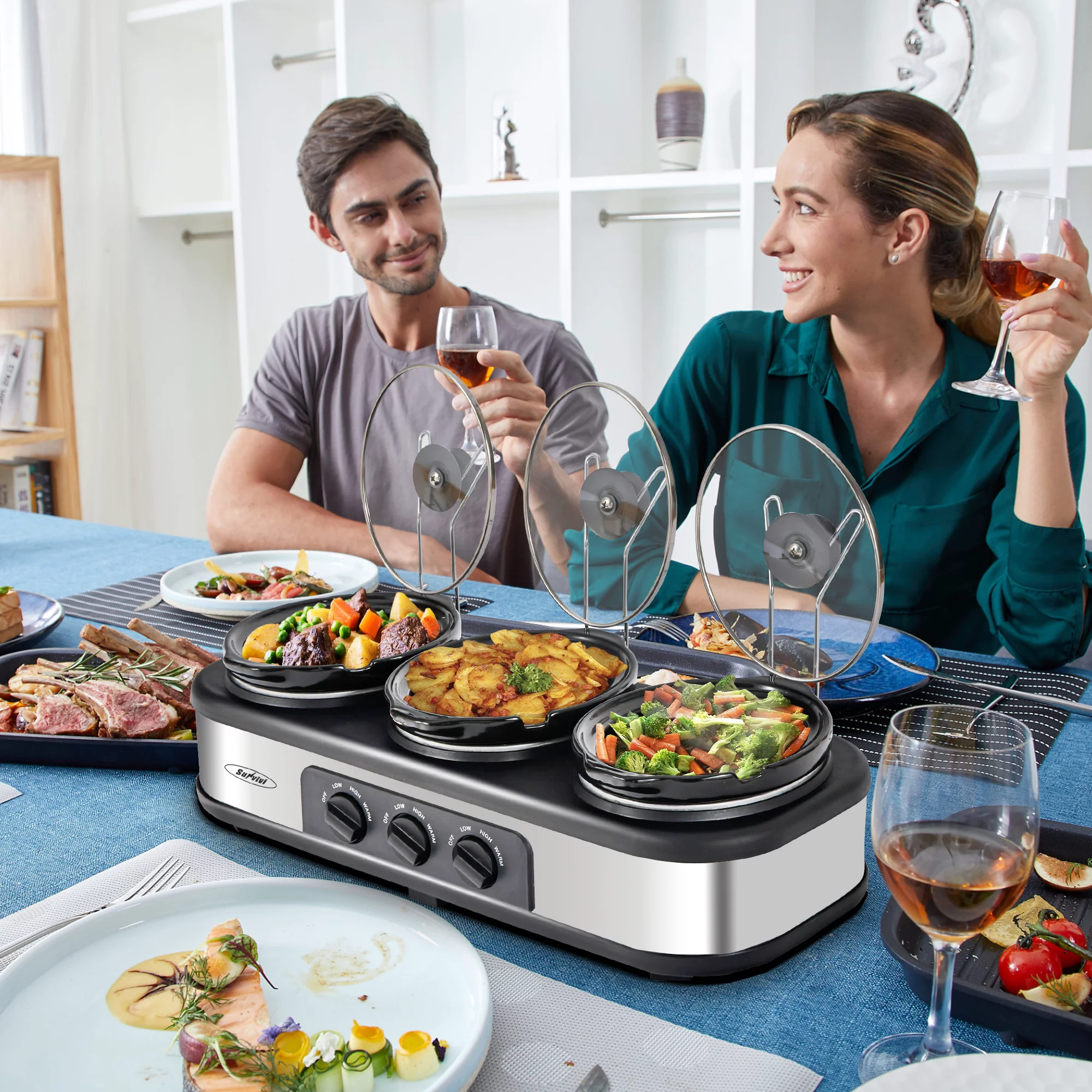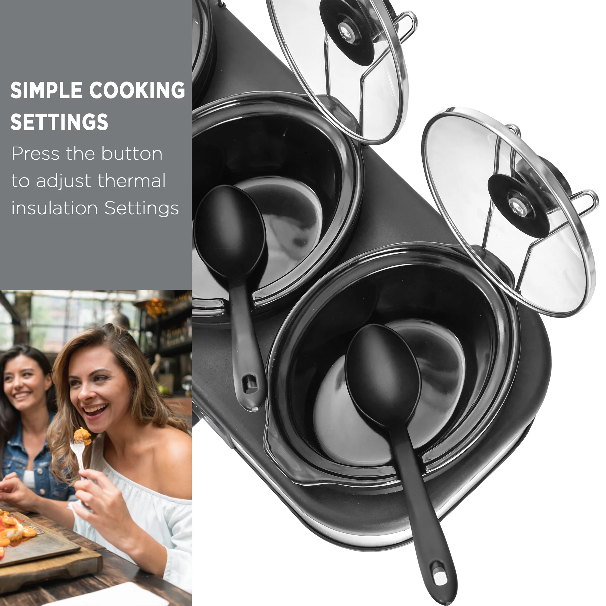 Royalcraft Triple Slow Cooker with 3 Spoons. 3 Pots 1.5 Quart Oval Crockpot Food Warmer Buffet Server