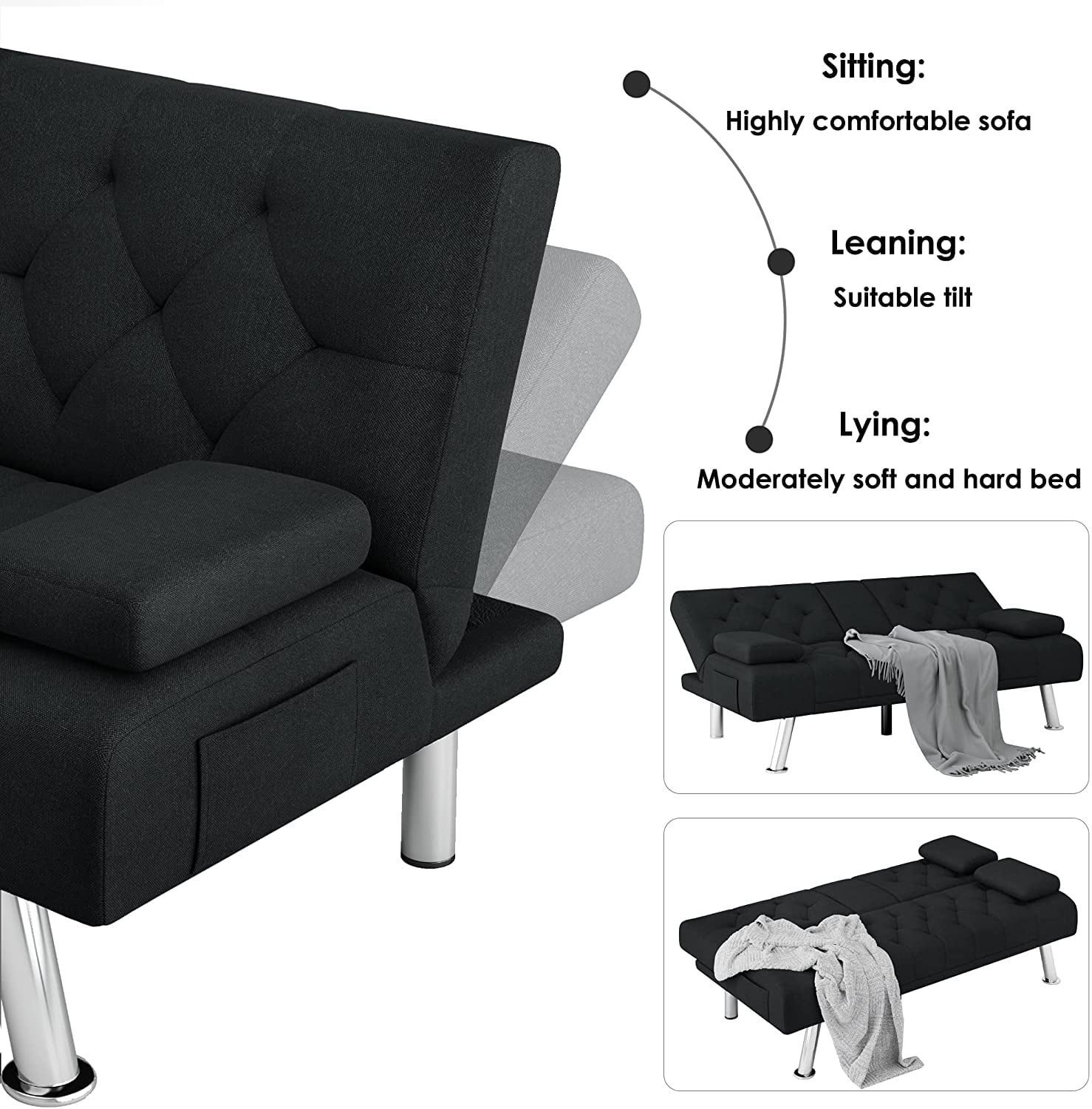 Homfa 66.3” Upholstered Sofa Bed Couch. Convertible Futon Folding Sleeper Sofa with Removable Armrests and 2 Cupholders for Living Room. Black