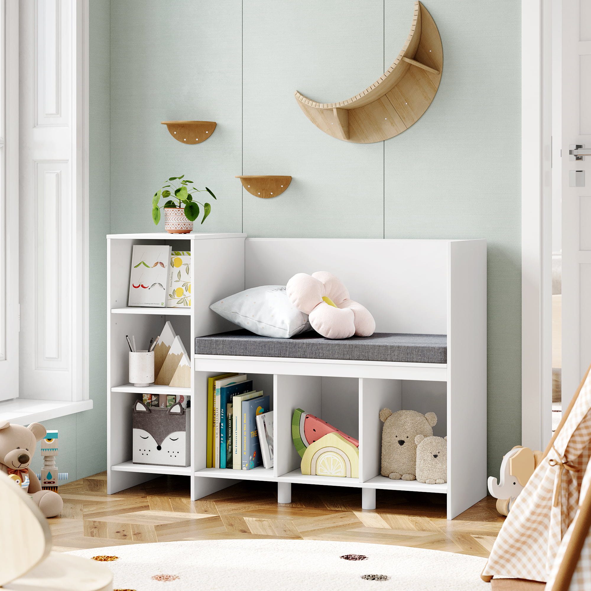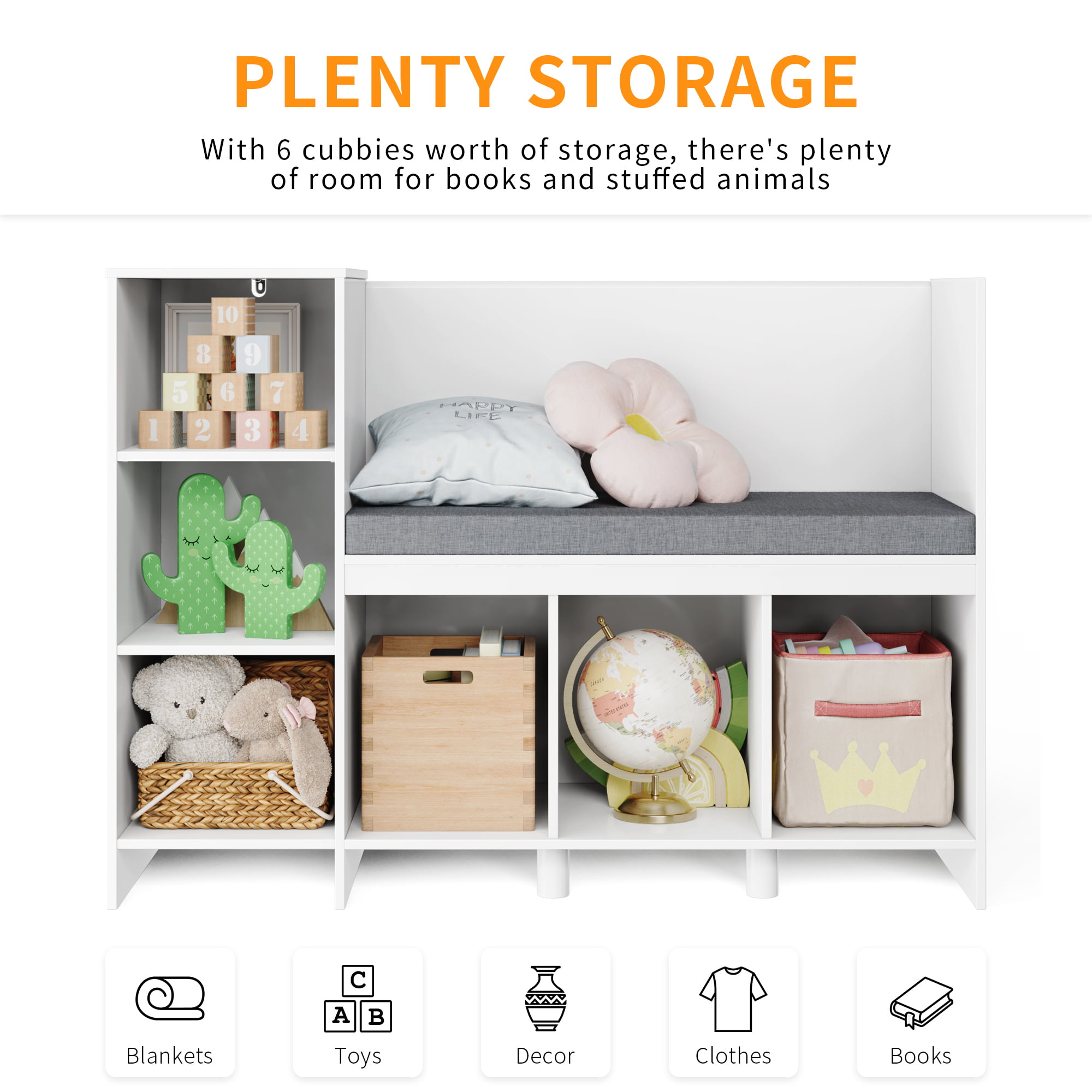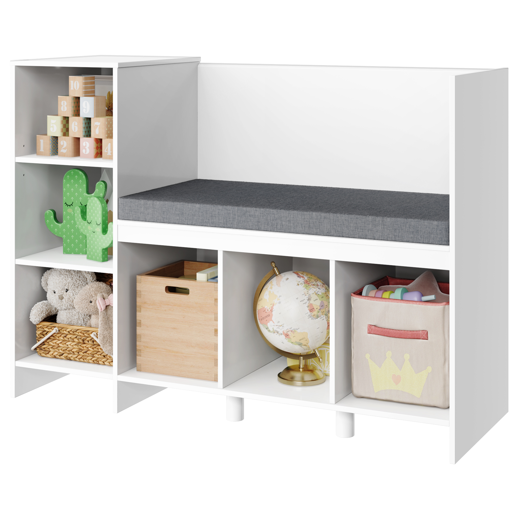 Homfa 6-Cubby Kids Bedroom Storage Organizer. Multi-Purpose Bookcase with Reading Nook. Storage Bench with Seat Cushion. White