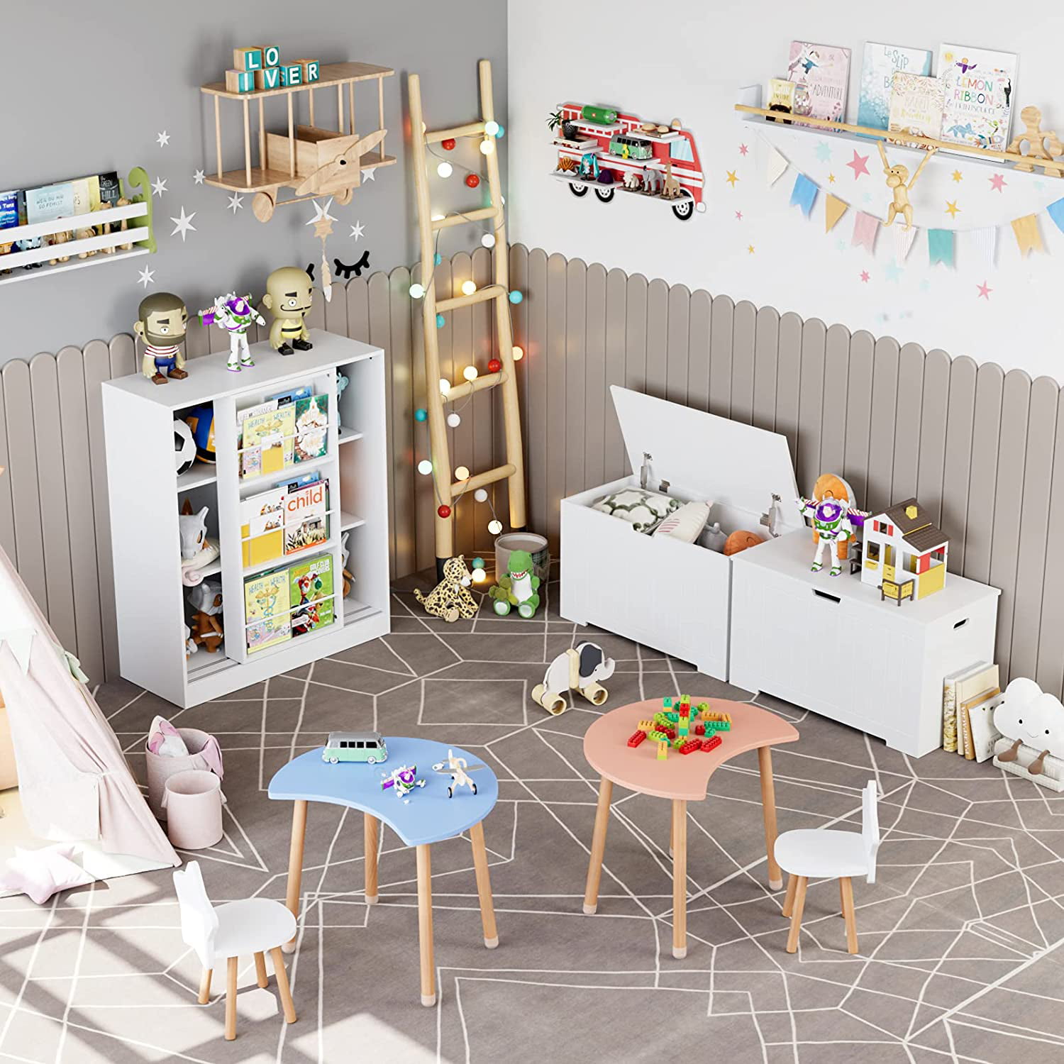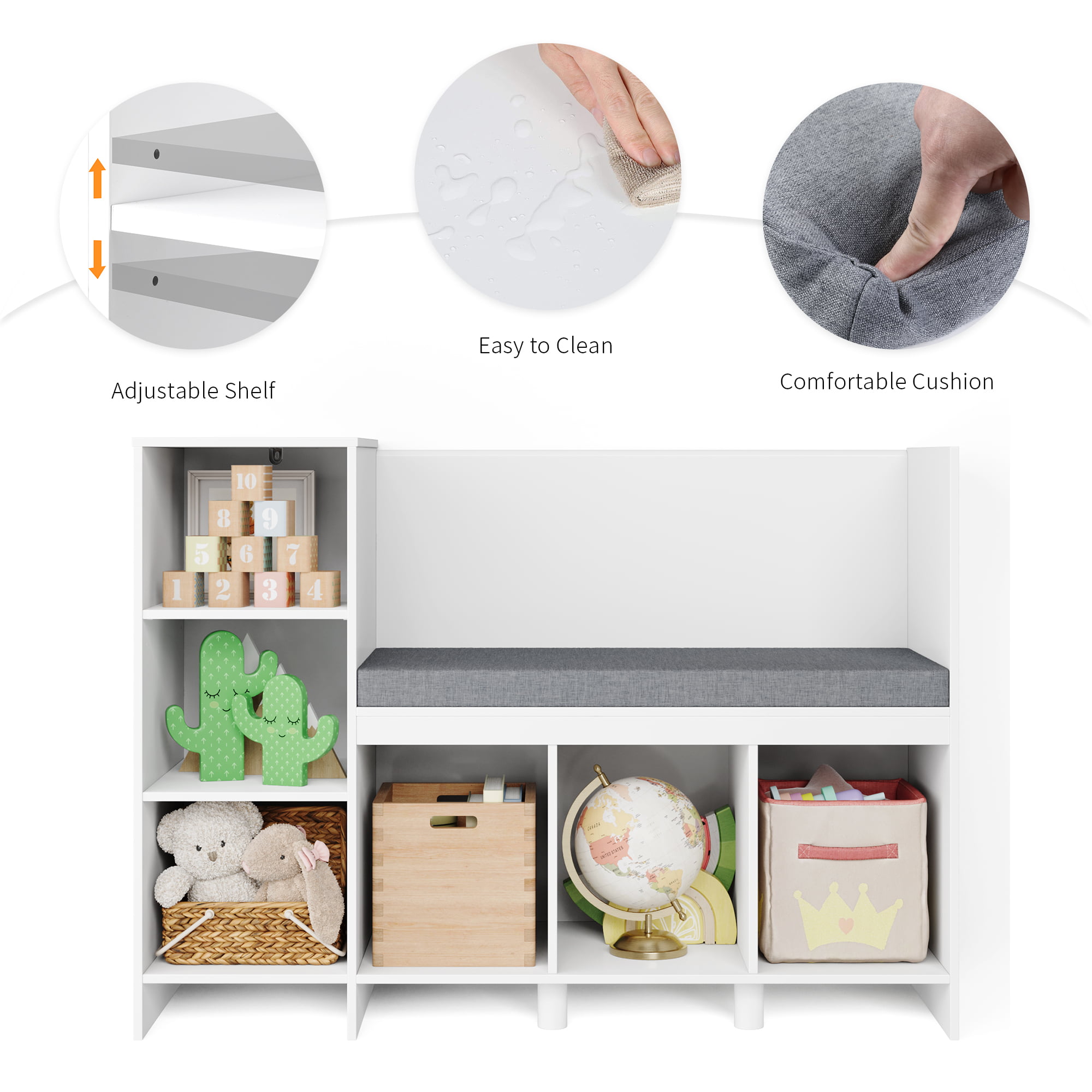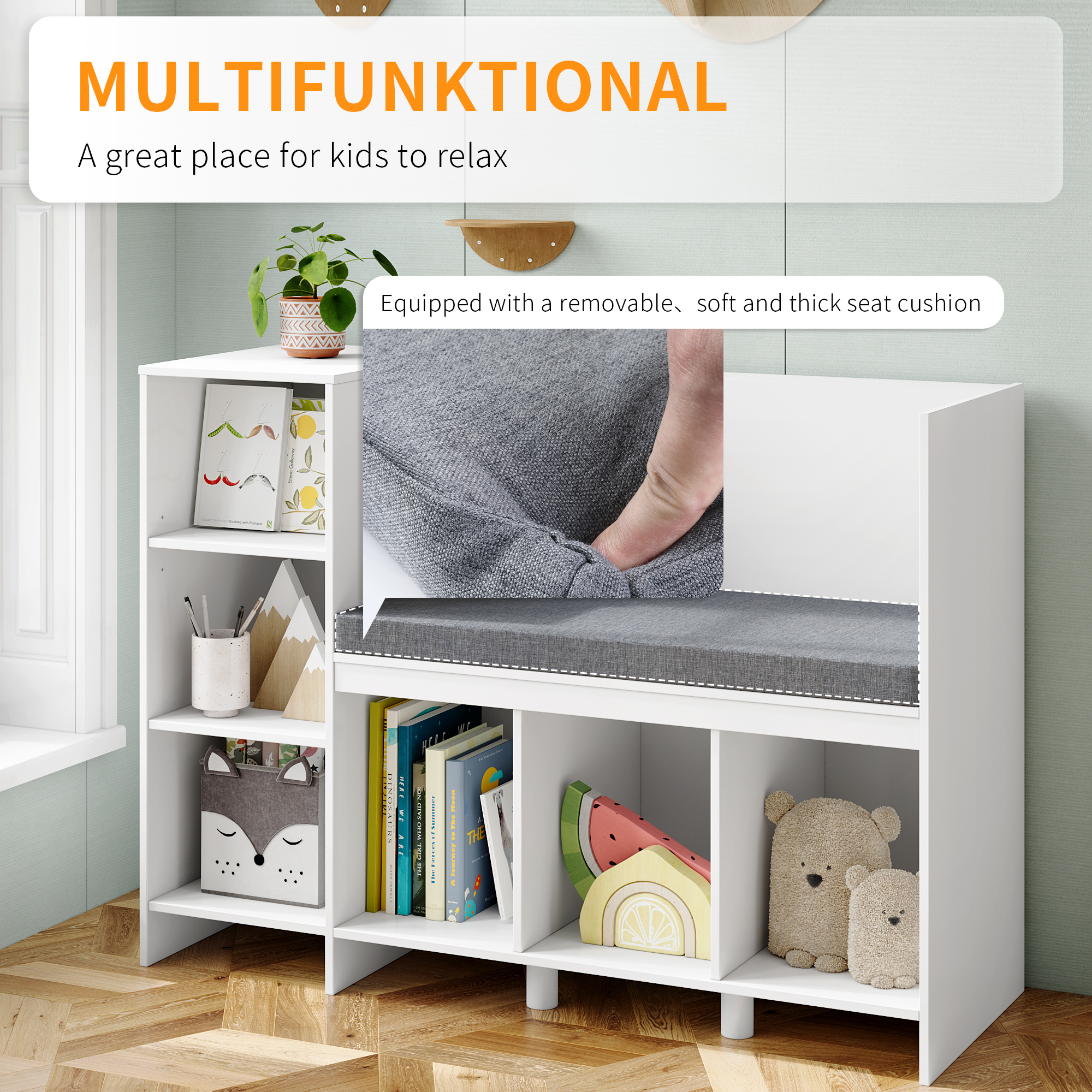 Homfa 6-Cubby Kids Bedroom Storage Organizer. Multi-Purpose Bookcase with Reading Nook. Storage Bench with Seat Cushion. White