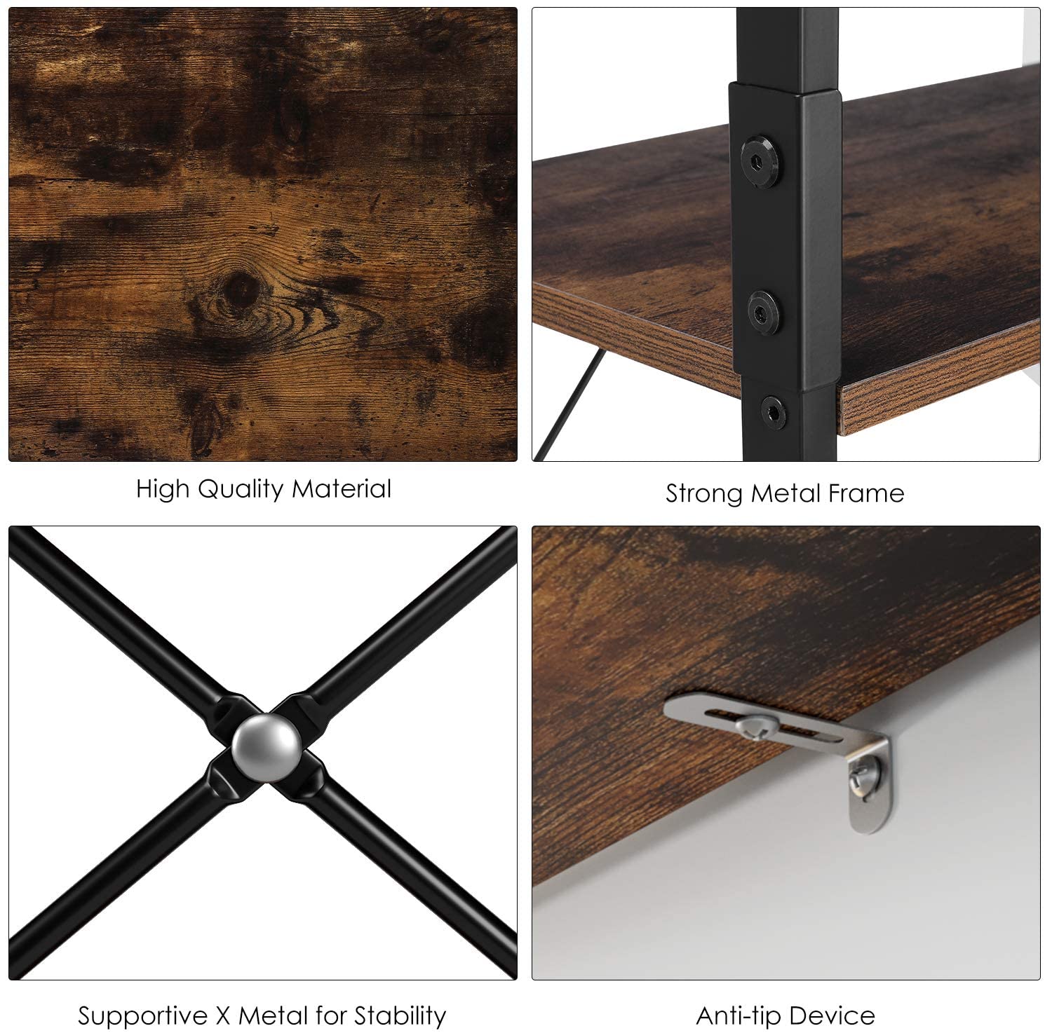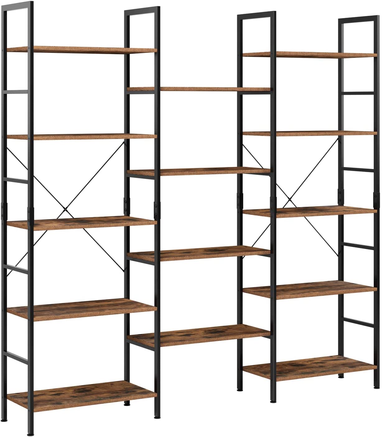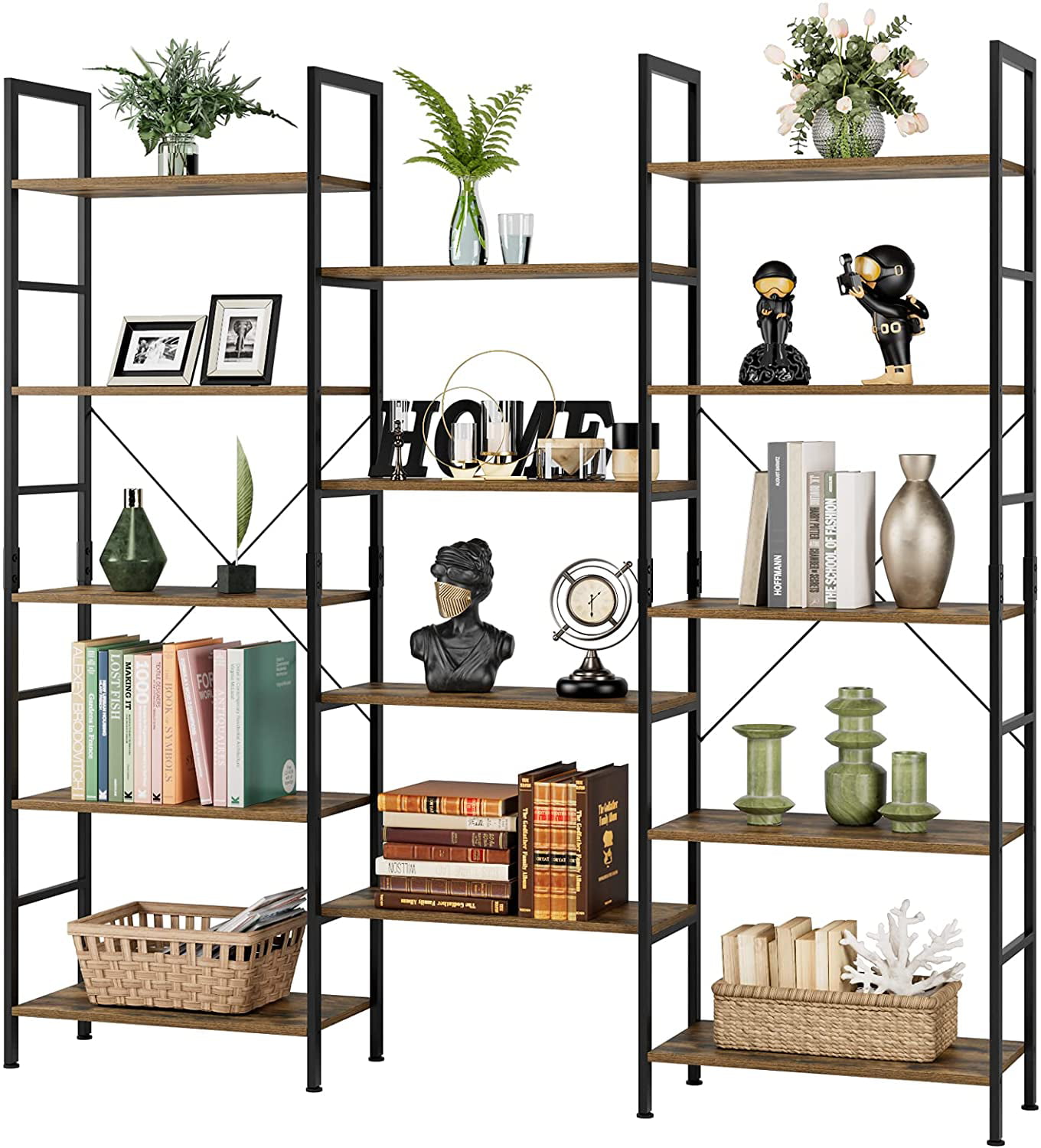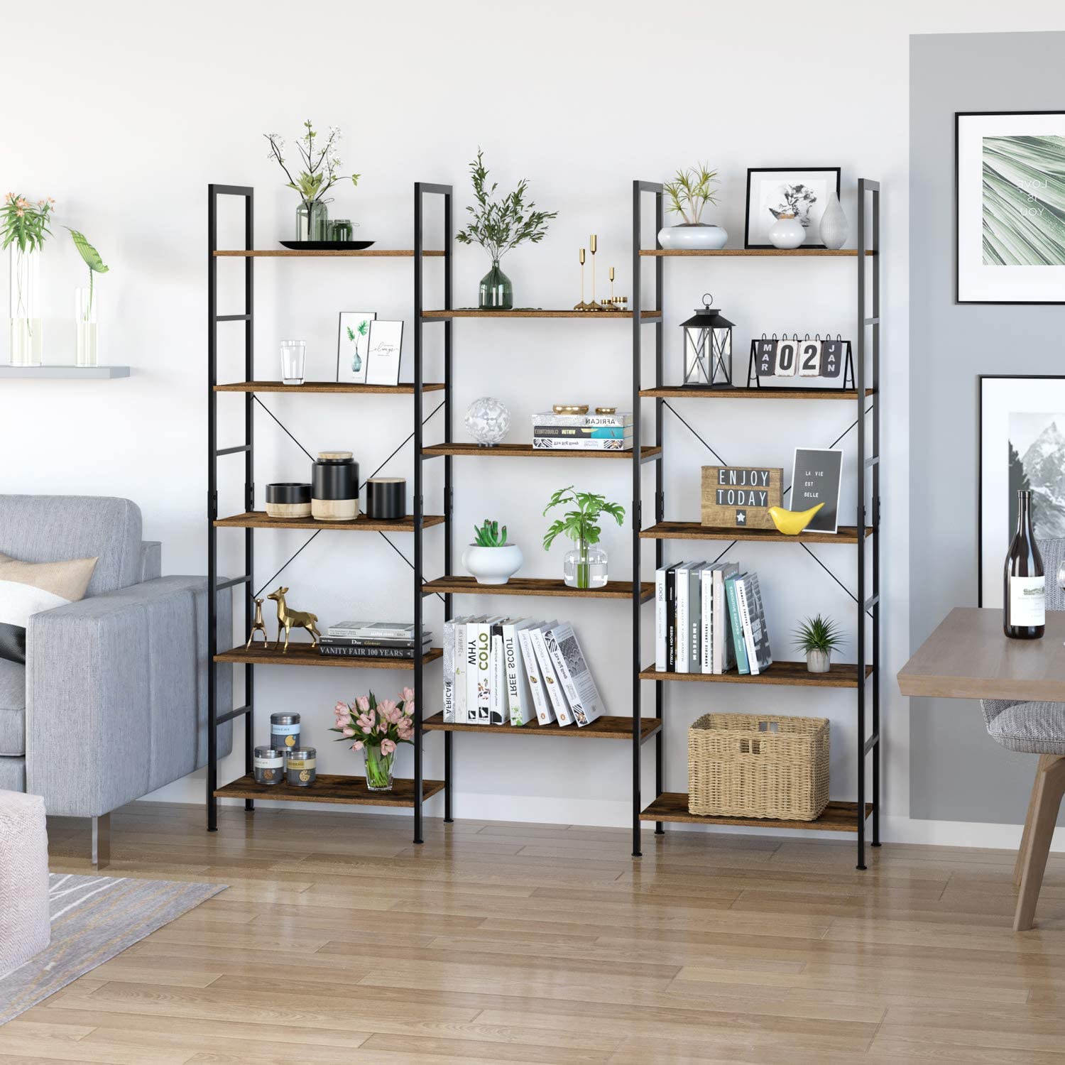 Homfa Triple Wide 5-Tier Display Bookcase. Large Industrial Wood Storage Shelf with Metal Frame for Living Room. Brown Finish