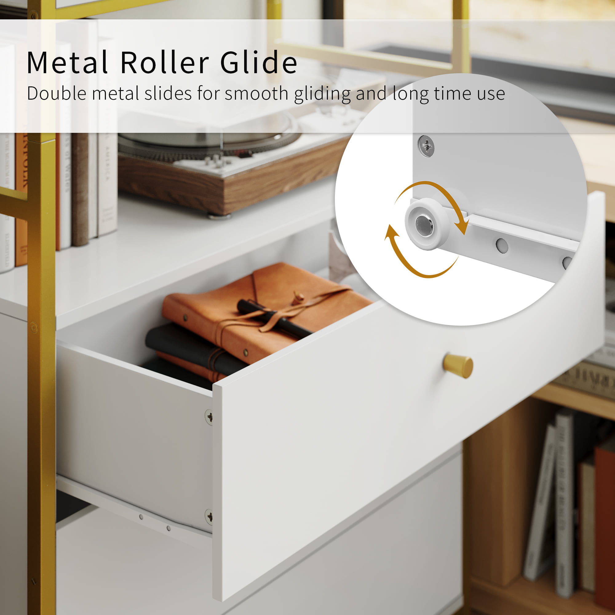 Homfa 4 Tier Gold Bookcase with 3 Drawers. Free Standing Bookshelf with Metal Frame for Office Study Room. White Finish
