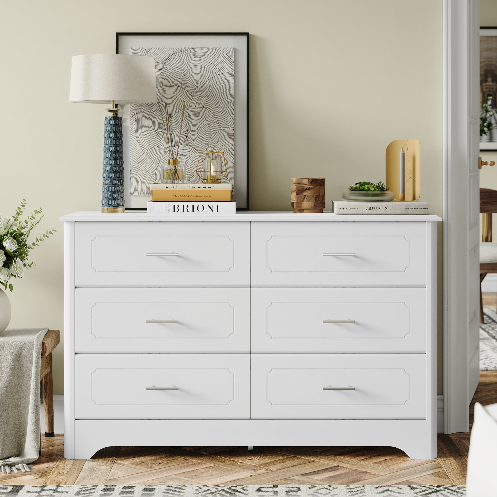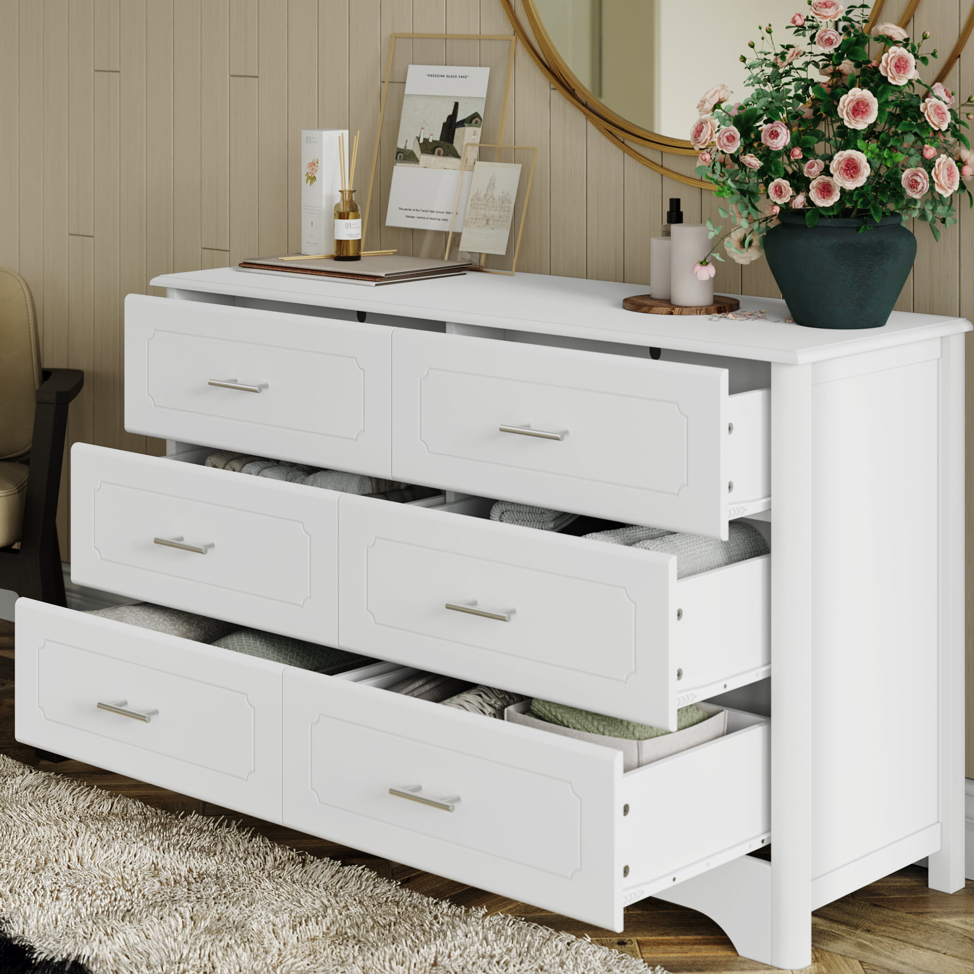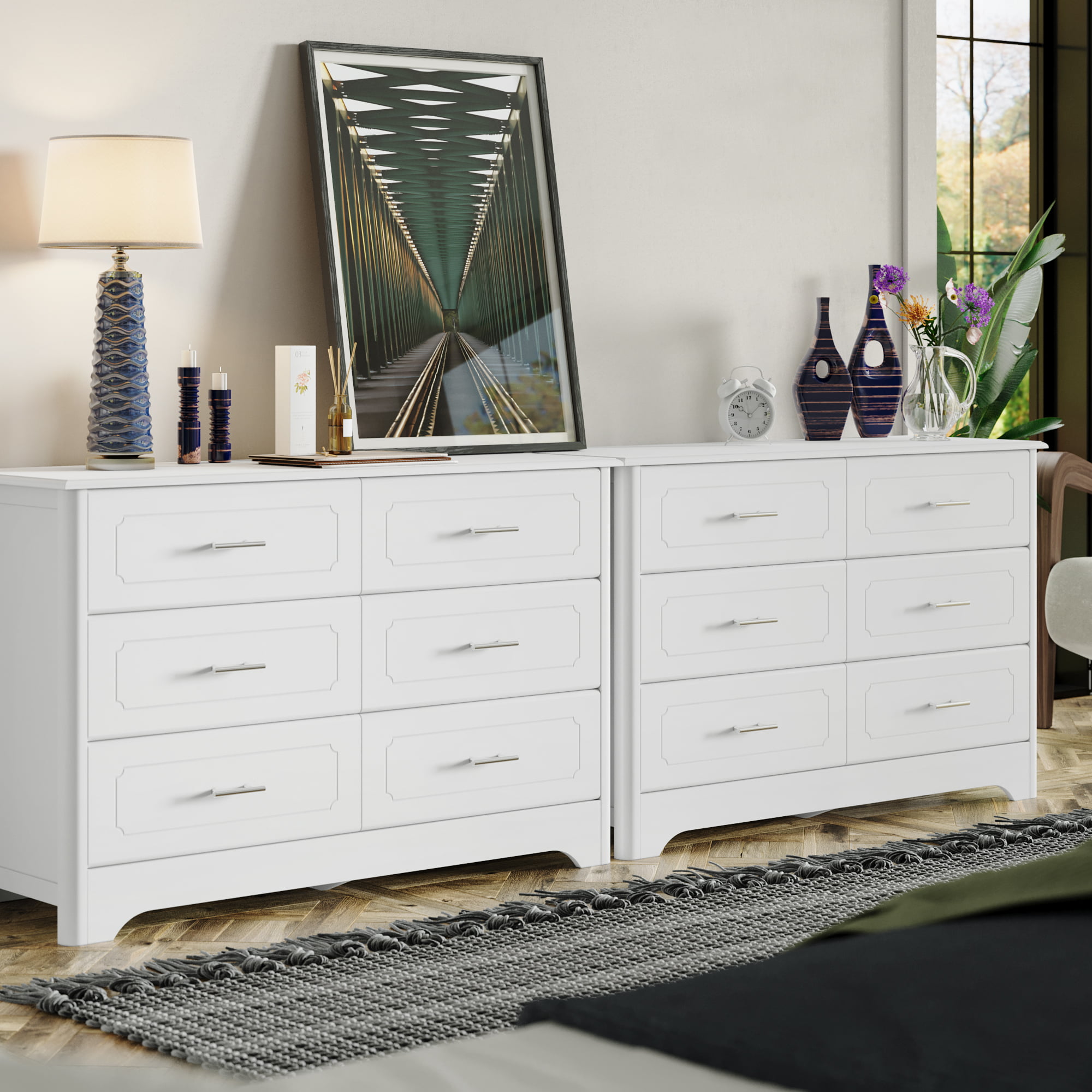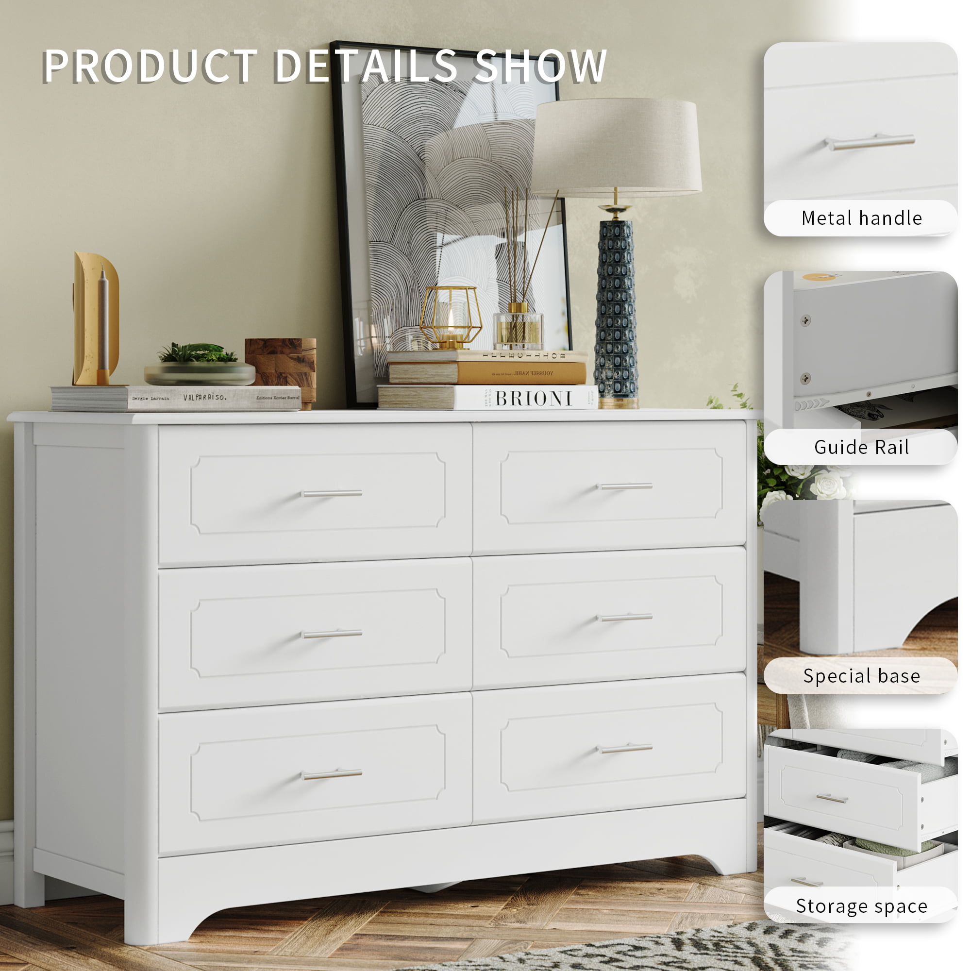 Homfa Double Dresser with 6 Drawer. White Horizontal Dresser Chest for Bedroom