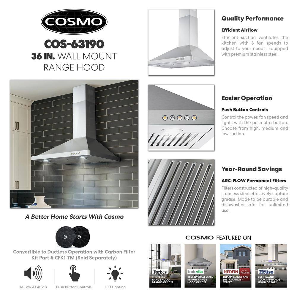 Cosmo COS-63190 36 in. Ducted Wall Mount Range Hood in Stainless Steel with LED Lighting and Permanent Filters