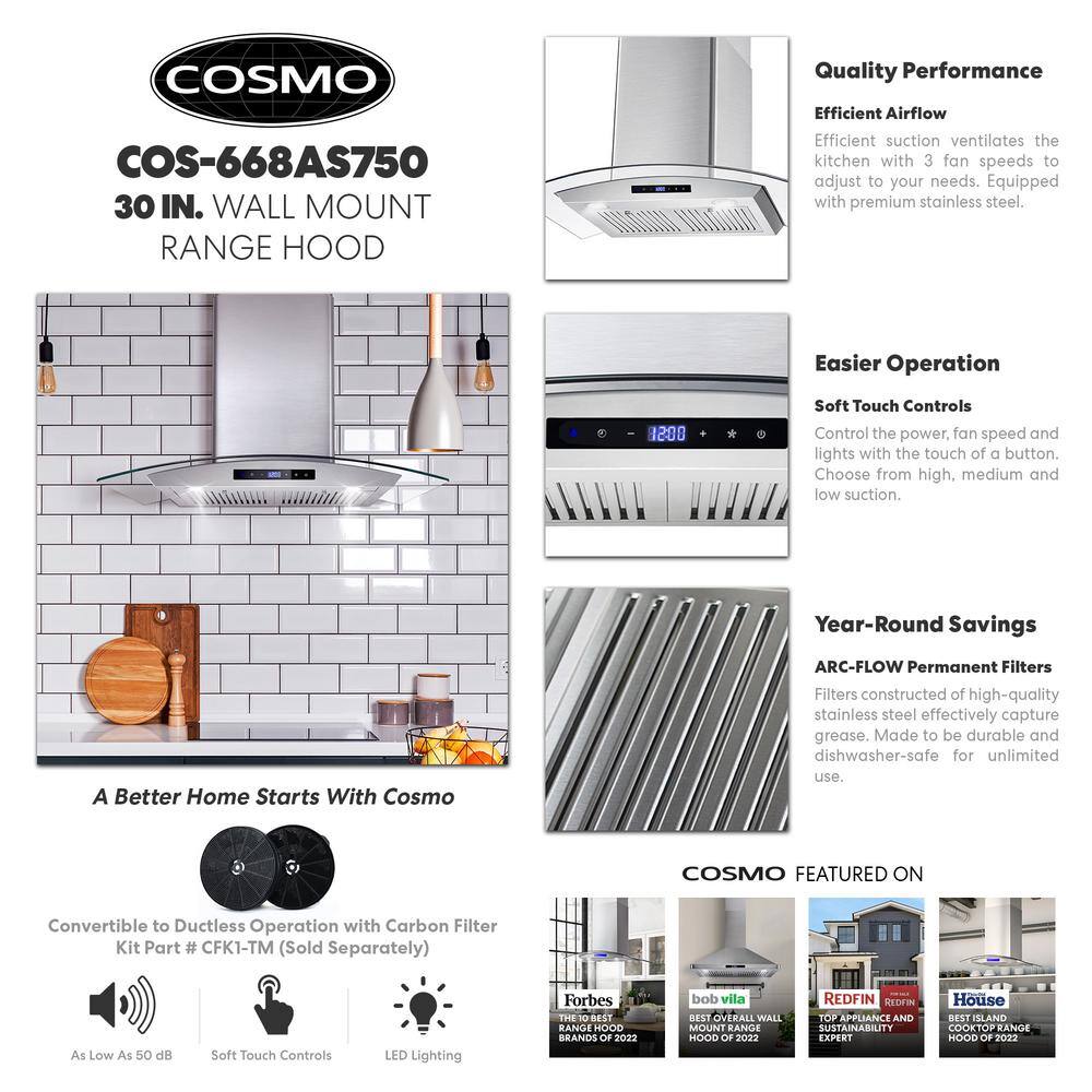 Cosmo COS-668AS750 30 in. Ducted Wall Mount Range Hood in Stainless Steel with Touch Controls. LED Lighting and Permanent Filters