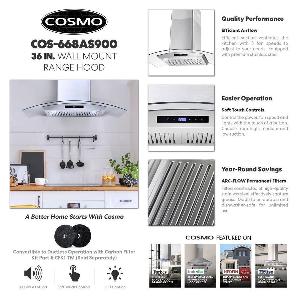 Cosmo COS-668AS900 36 in. Ducted Wall Mount Range Hood in Stainless Steel with Touch Controls. LED Lighting and Permanent Filters