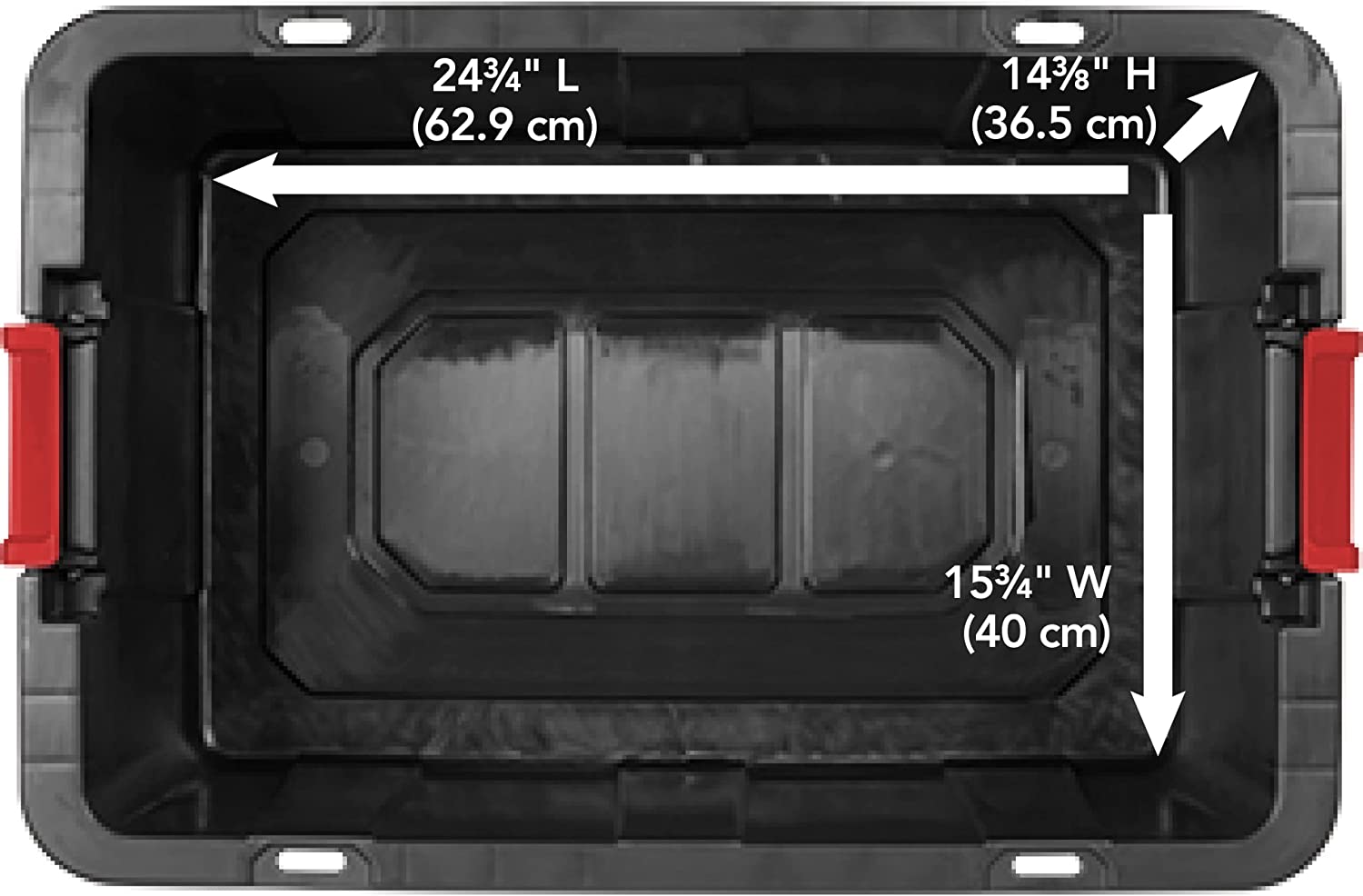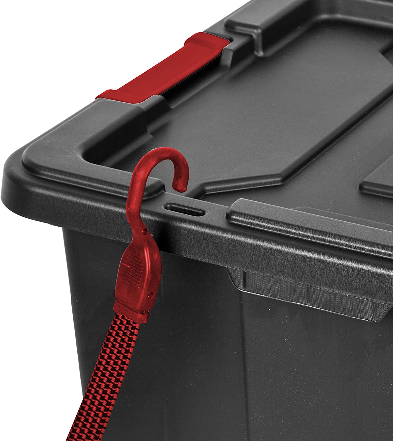 Sterilite 14669004 27 Gallon/102 Liter Industrial Tote. Black Lid & Base w/ Racer Red Latches. 4-Pack