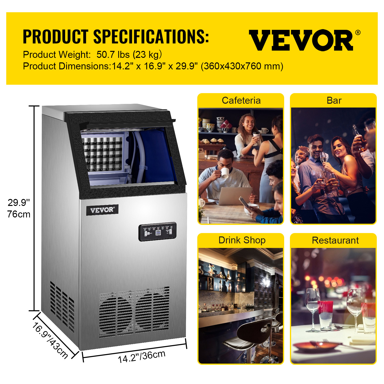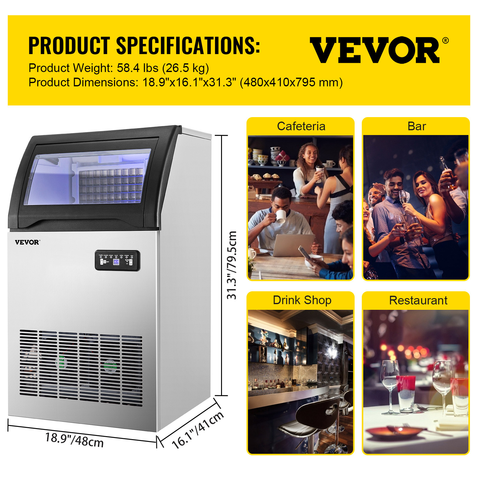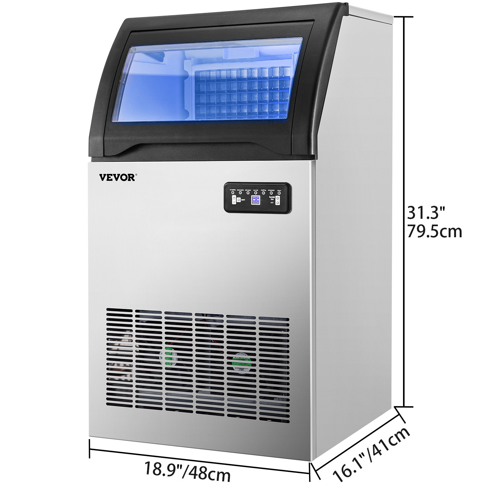 VEVORbrand 110V Commercial Ice Maker 155lbs/24h.530W Commercial Ice Machine with 33lbs Storage Capacity. Stainless Steel Construction Ice Cube Making Machine. includes Water Filter and Connection Hose