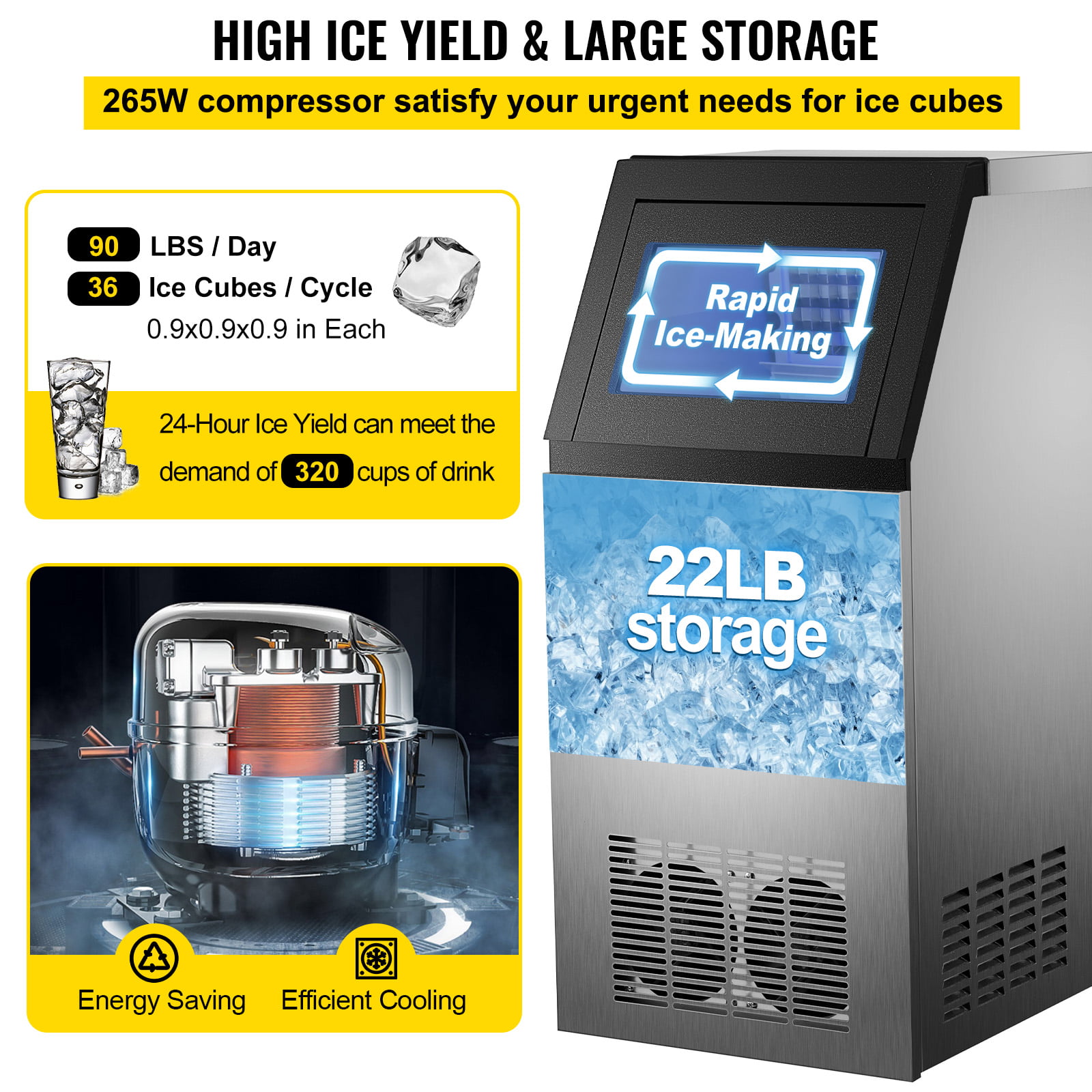 VEVOR 110V Commercial Ice Maker 90lbs/24h with 22 lbs Storage 4×9 Cubes Commercial Ice Machine 110V Automatic Ice Machine