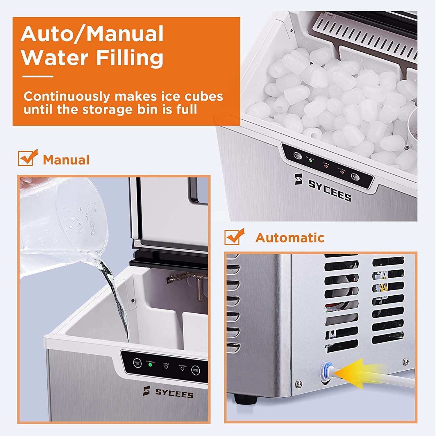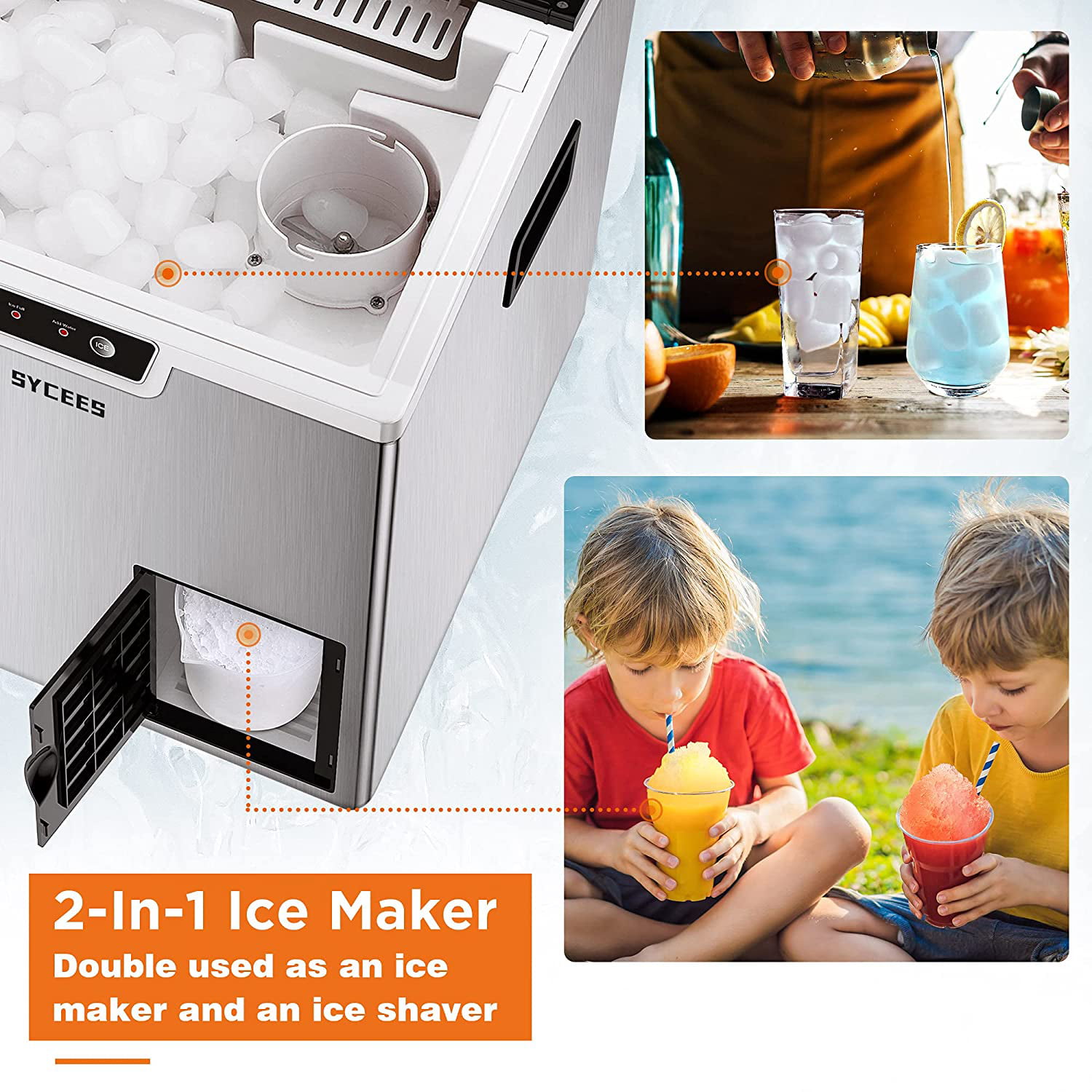 Sycees 2-in-1 Countertop Ice Maker Machine & Ice Shaver. 44lbs Stainless Steel