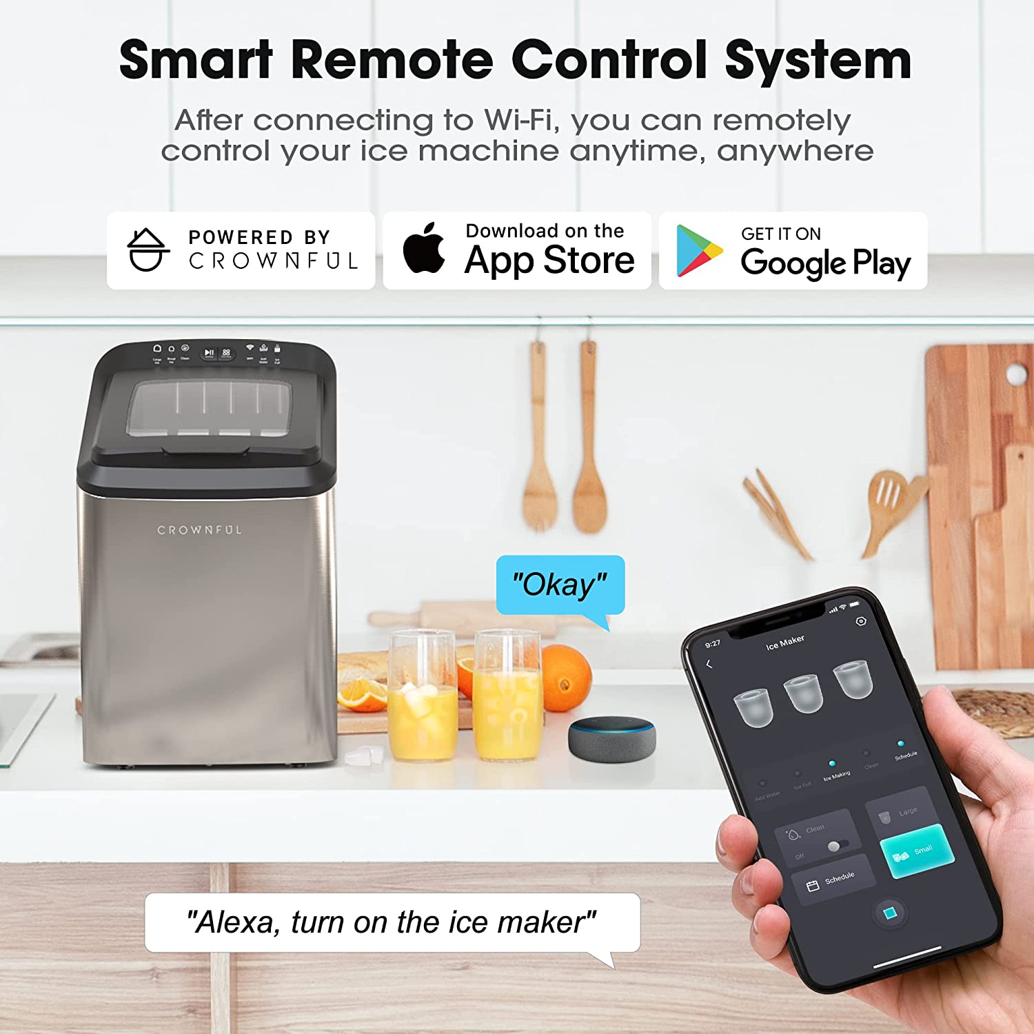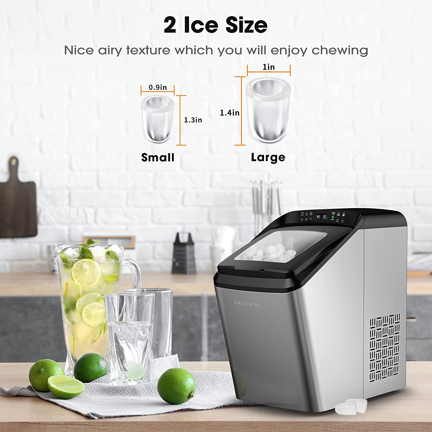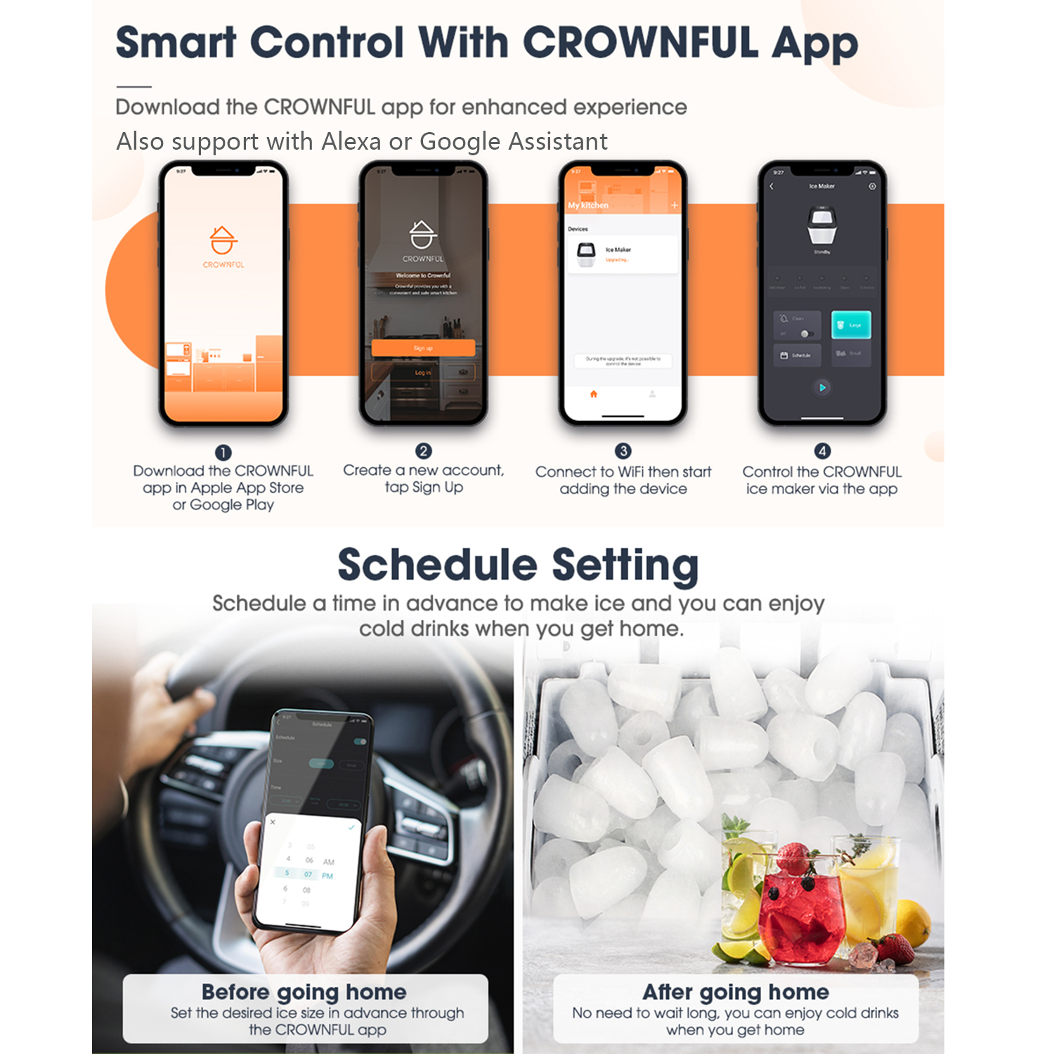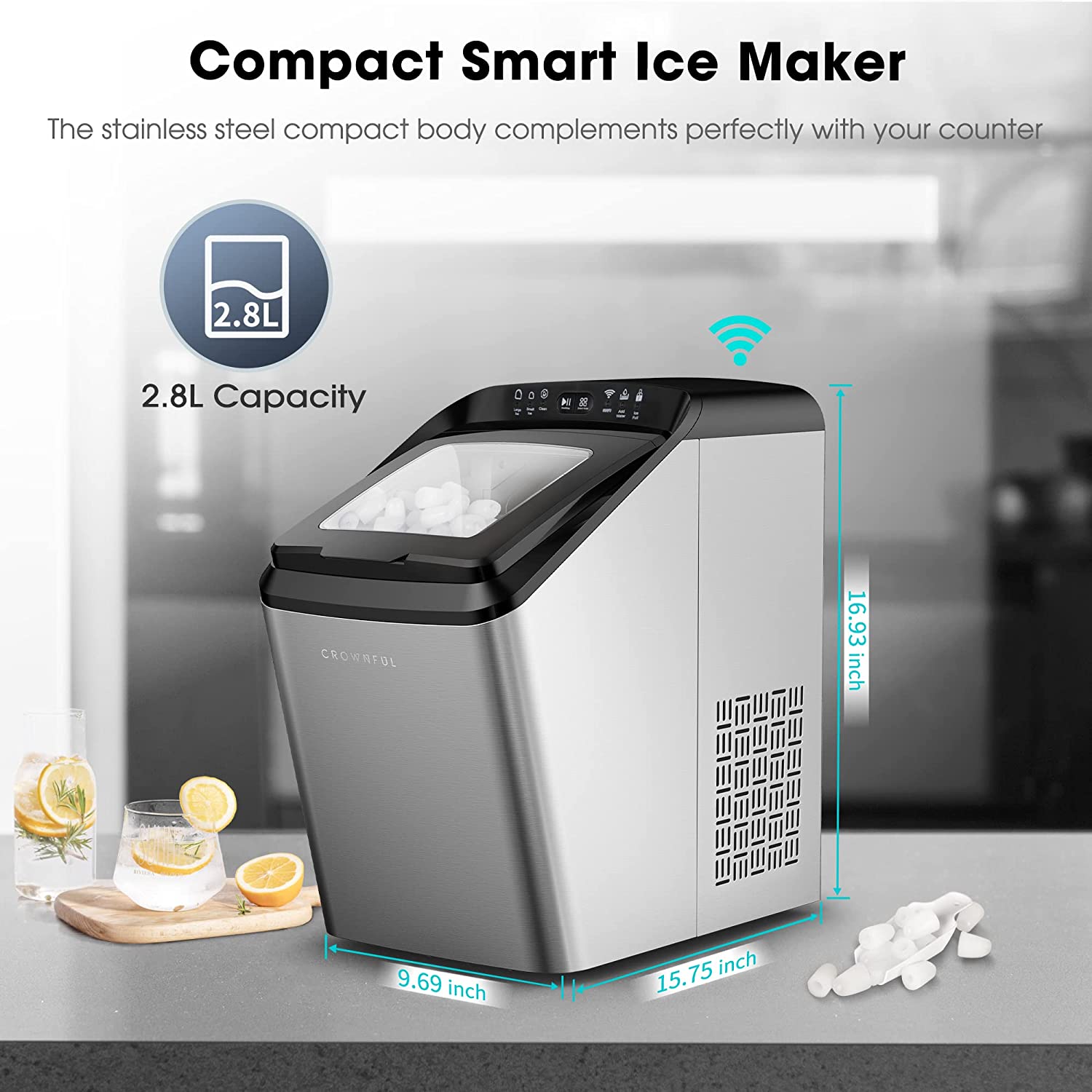 CROWNFUL Smart Ice Maker Countertop. with App Remote Control Ice Machine. 33 lbs/24H. 2 Size (S/L) Ice. Self-Cleaning