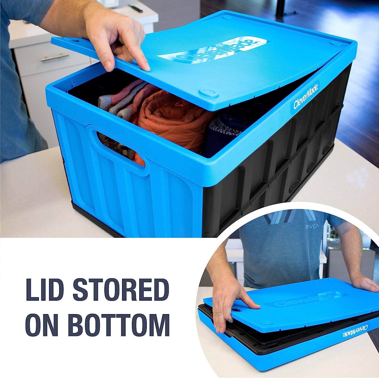 CleverMade 62L Collapsible Storage Bins with Lids - Folding Plastic Stackable Utility Crates. Solid Wall CleverCrates. 3 Pack. Neptune Blue