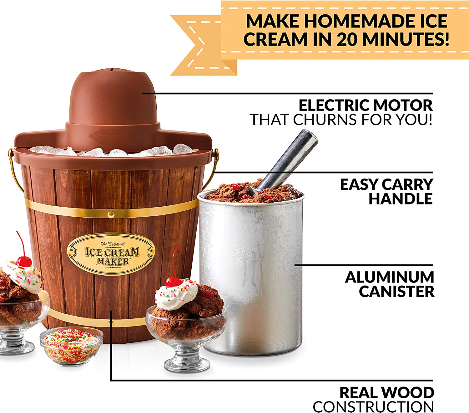 Nostalgia Electric Ice Cream Maker - Old Fashioned Soft Serve Ice Cream Machine Makes Frozen Yogurt or Gelato in Minutes - Fun Kitchen Appliance - Vintage Wooden Style - Dark Wood - 4 Quart