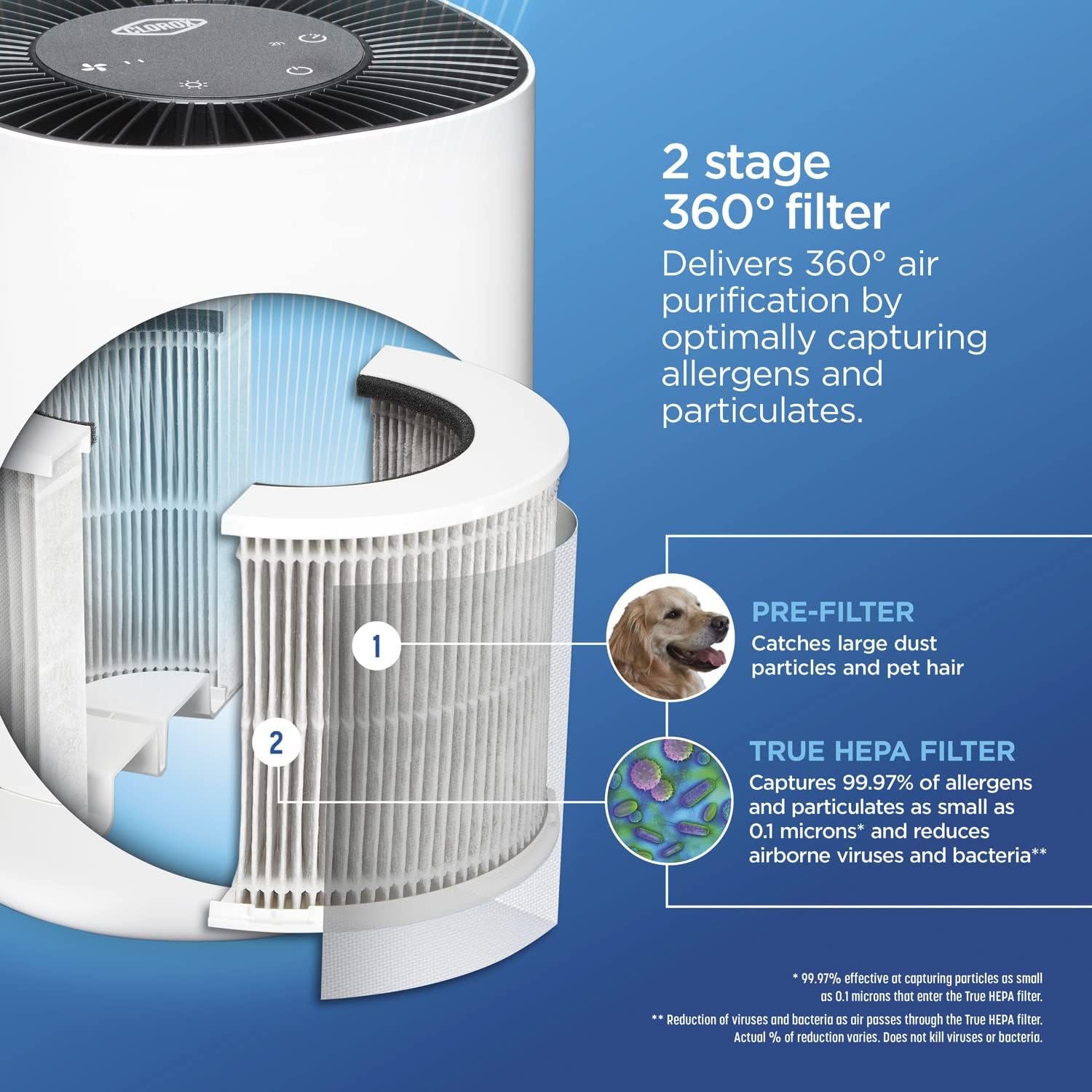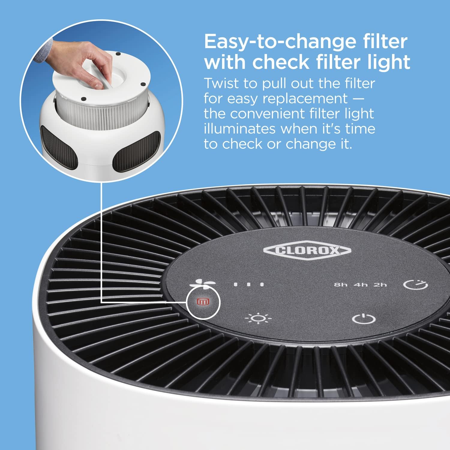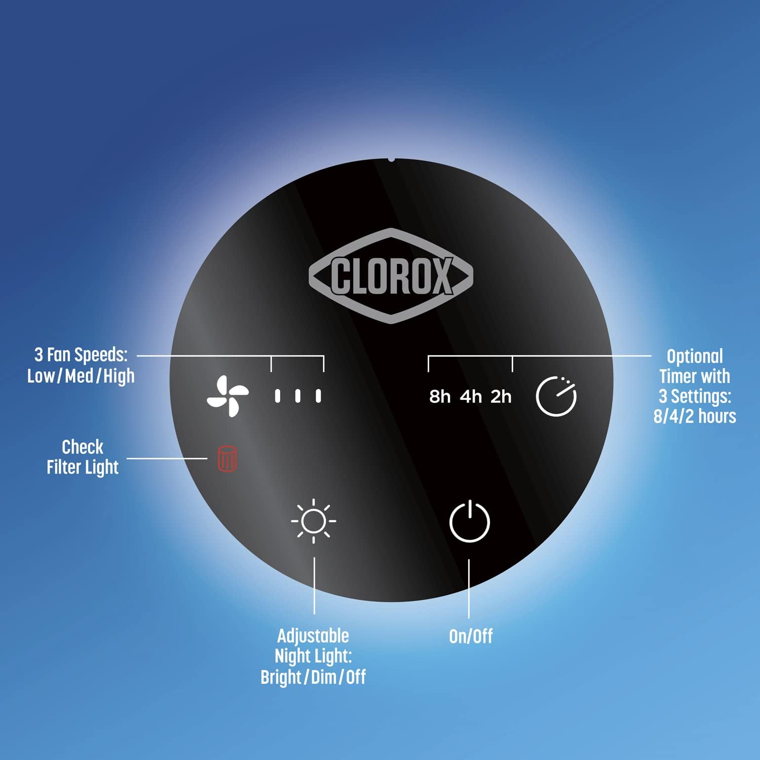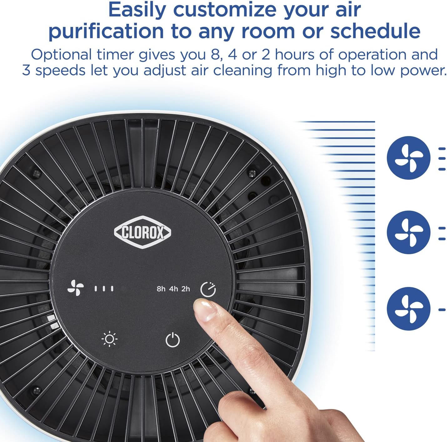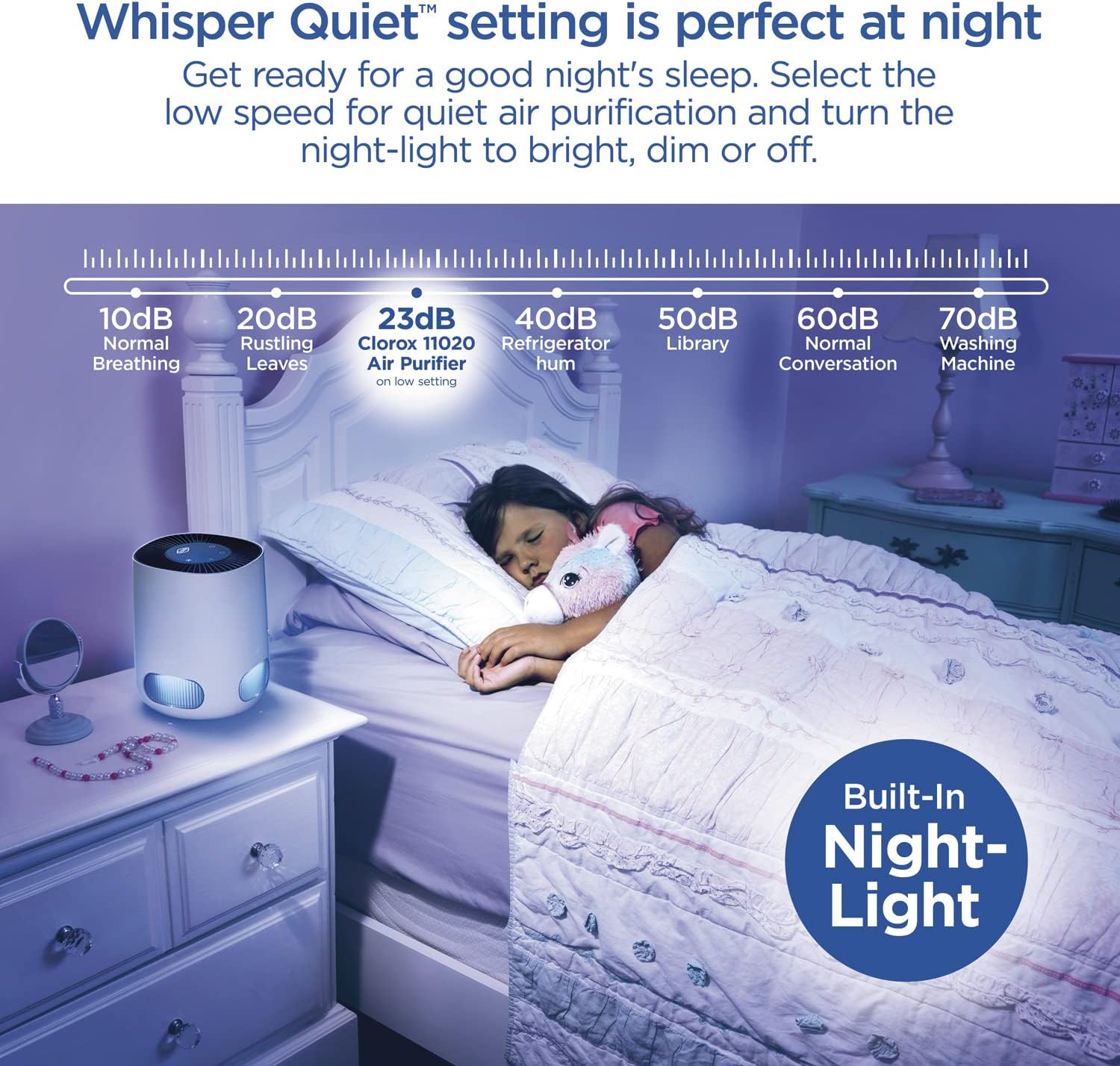 Clorox Air Purifiers for Home. True HEPA Filter. Small Rooms Up to 200 Sq Ft. Removes 99.9% of Mold. Viruses. Wildfire Smoke. Allergens. Pet Allergies. Dust. AUTO Mode. Whisper Quiet