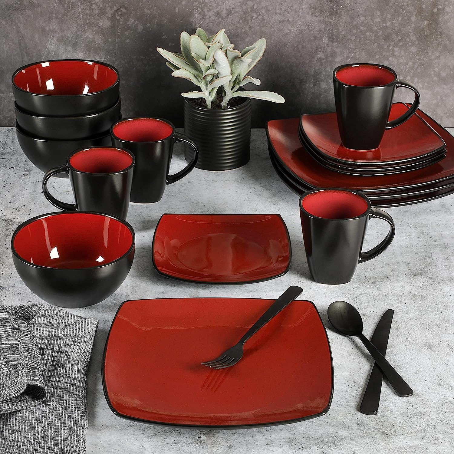 Gibson Soho Lounge 16-Piece Square Reactive Glaze Dinnerware Set. Red