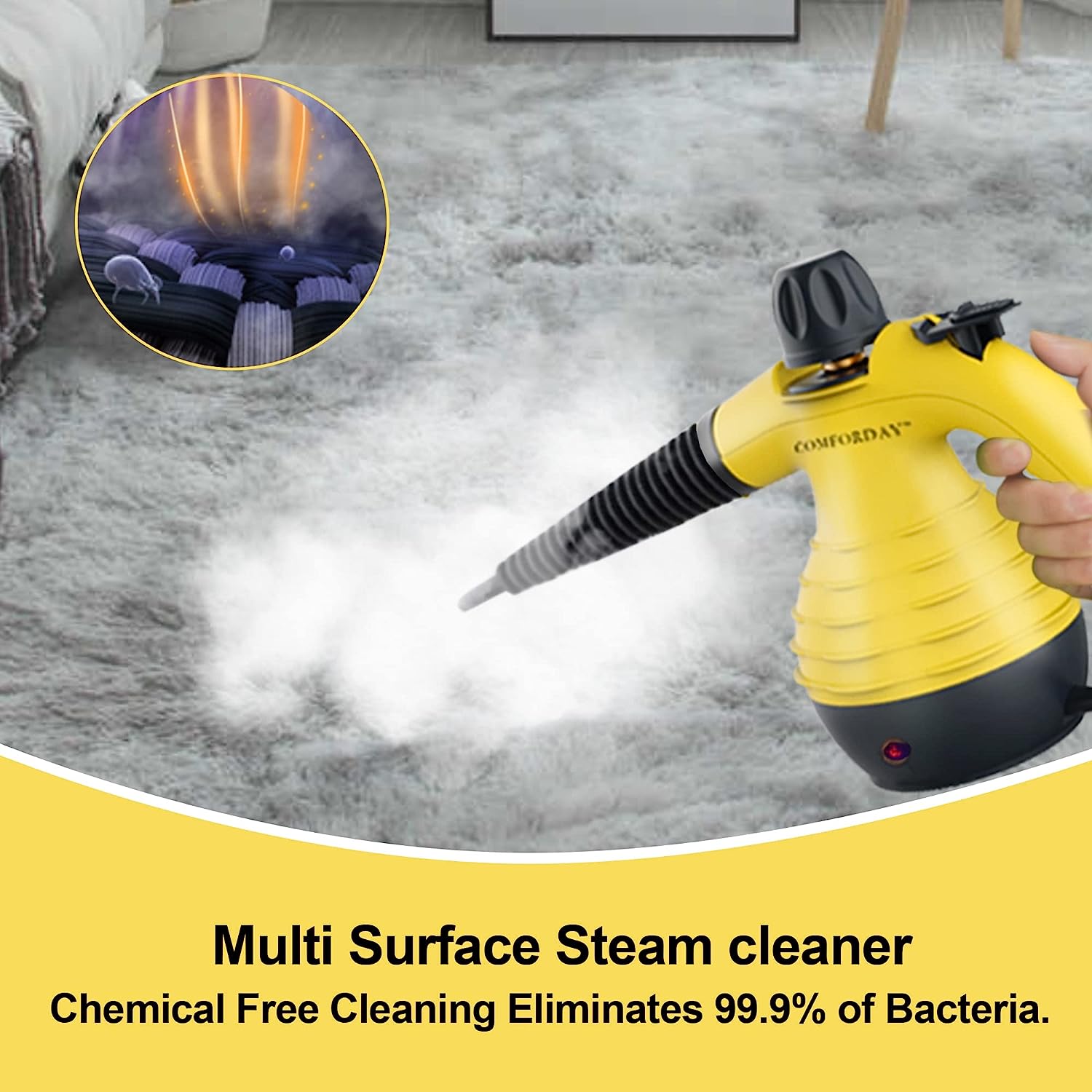 Comforday Multi-Purpose Handheld Pressurized Steam Cleaner with 9-Piece Accessories. Perfect for Stain Removal. Curtains. Car Seats. Floor. Window Cleaning (Yellow)