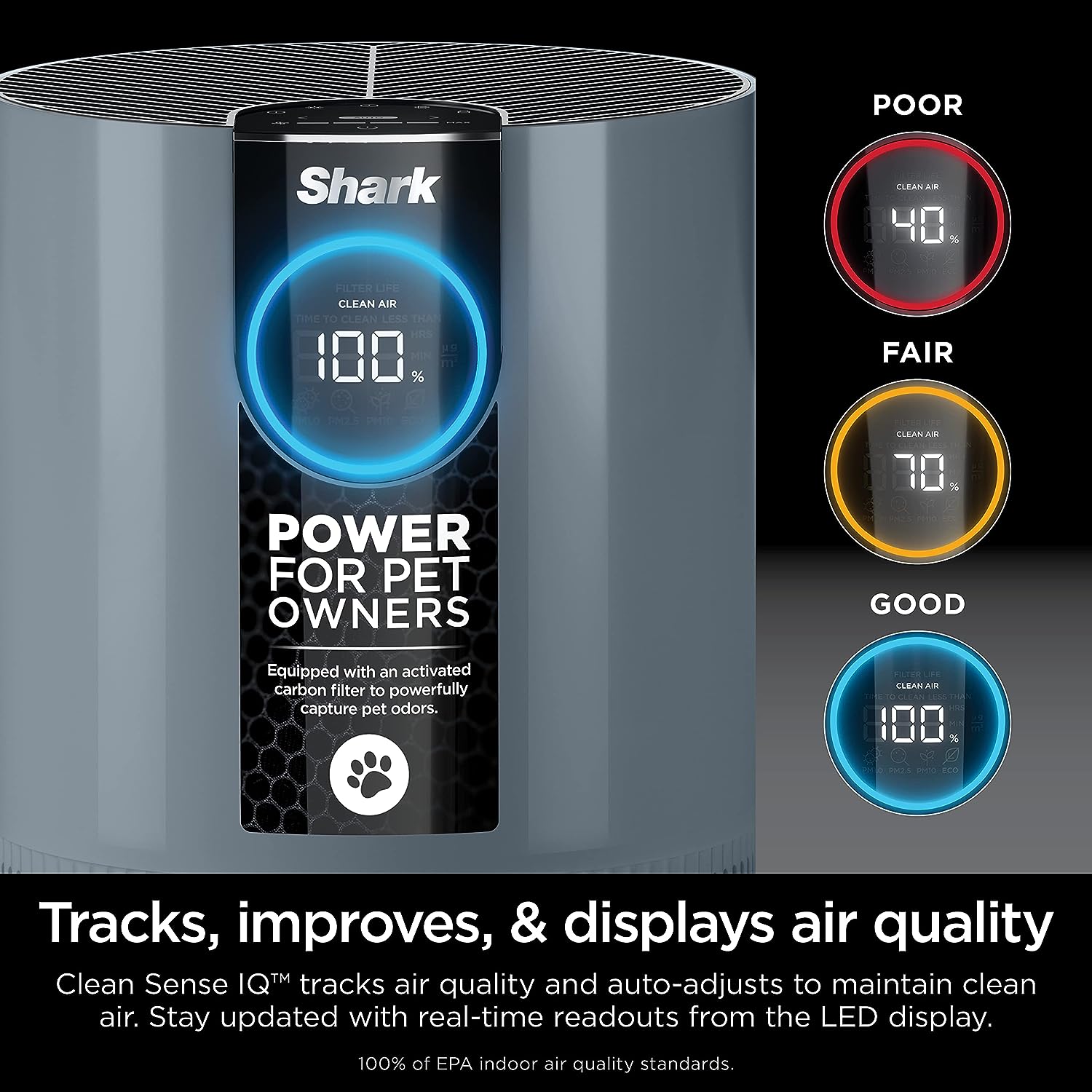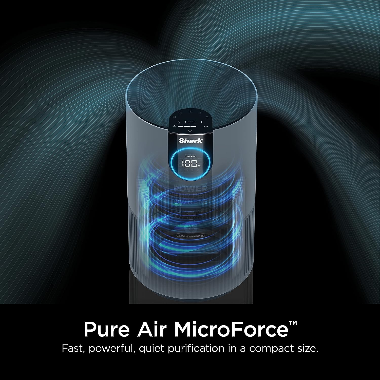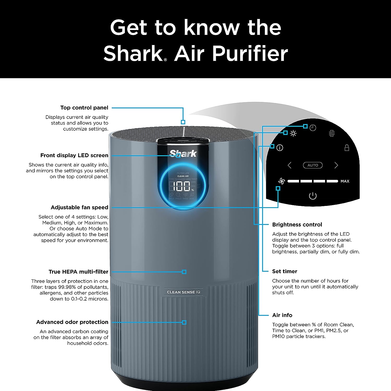 Shark HP102PETBL Clean Sense Air Purifier for Home. Allergies. Pet Hair. HEPA Filter. 500 Sq Ft Small Room. Bedroom. Captures 99.98% of Particles. Pet Dander. Fur. Allergens & Odor. Portable. Midnight. Blue