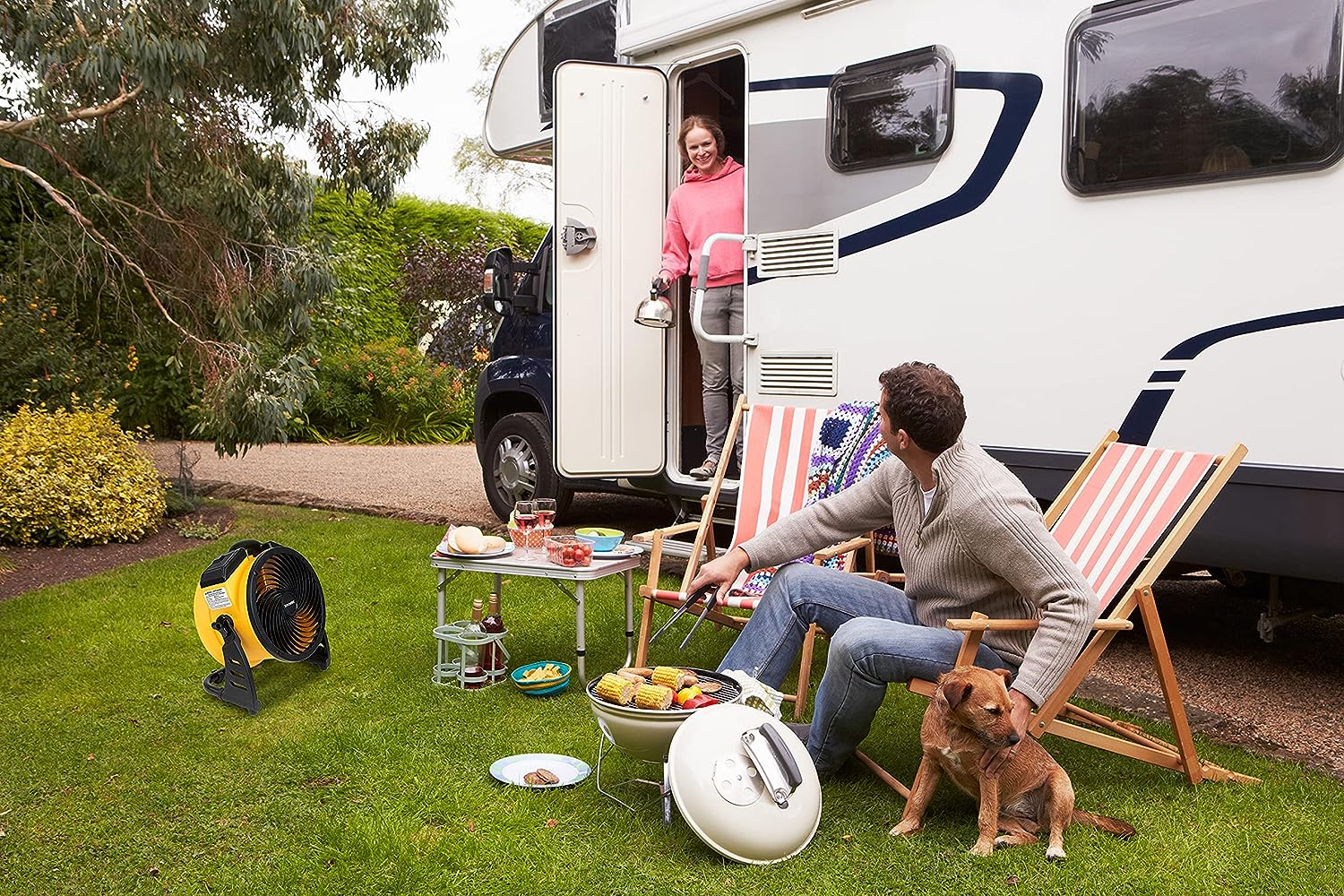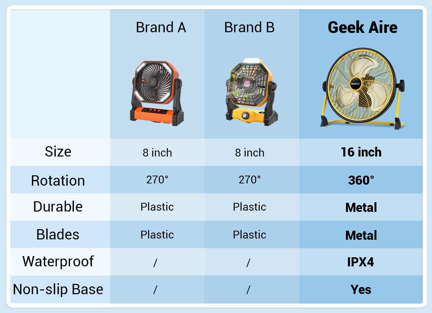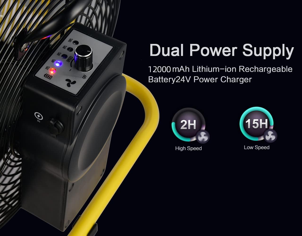 Geek Aire Rechargeable Outdoor High Velocity Camping Floor Fan. 16 Portable Battery Operated Fan with Metal Blade for Garage Barn Gym Camp. Cordless Industrial Fan. Camping Gear Accessories
