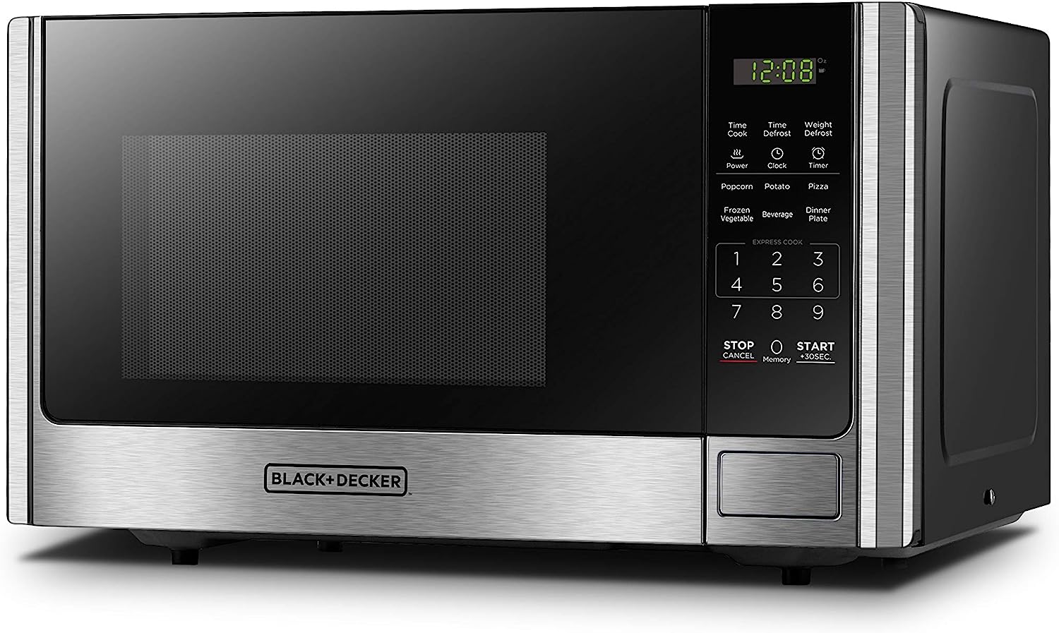 BLACK+DECKER Digital Microwave Oven with Turntable Push-Button Door. Child Safety Lock. Stainless Steel. 0.9 Cu Ft