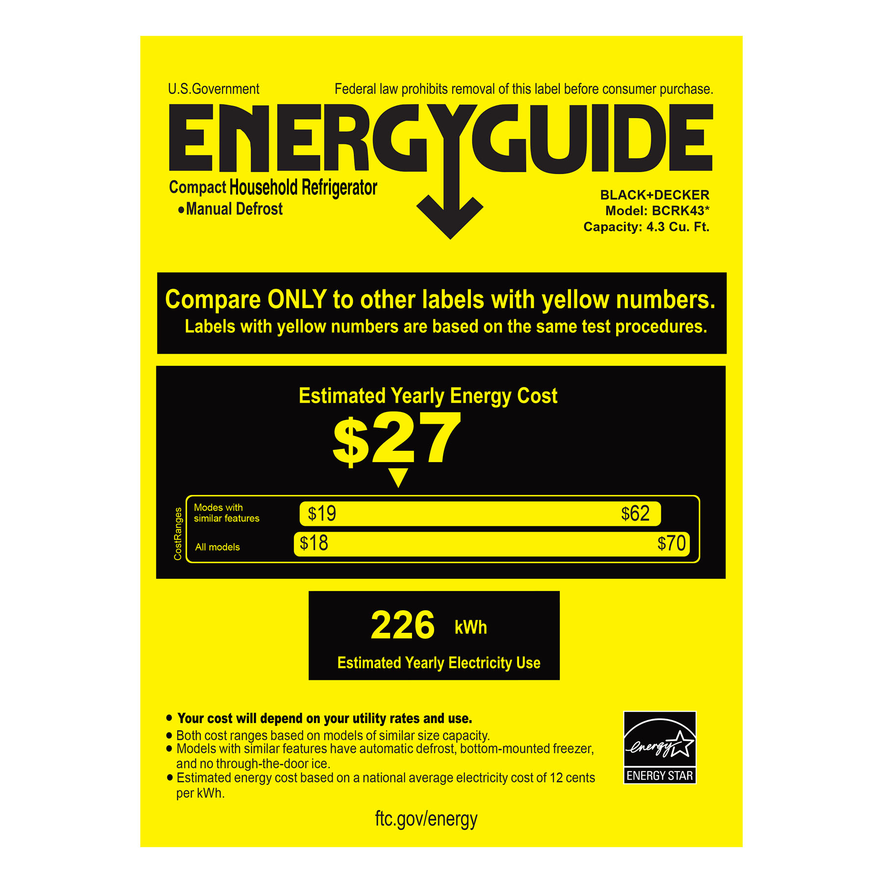 BLACK+DECKER BCRK25B 2.5 cu. ft. Energy Star Refrigerator with Freezer. Black
