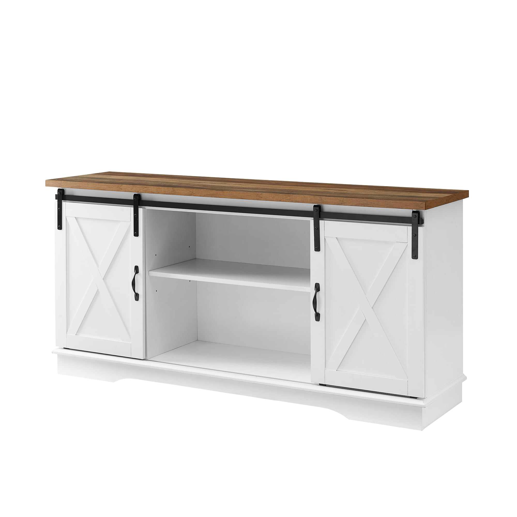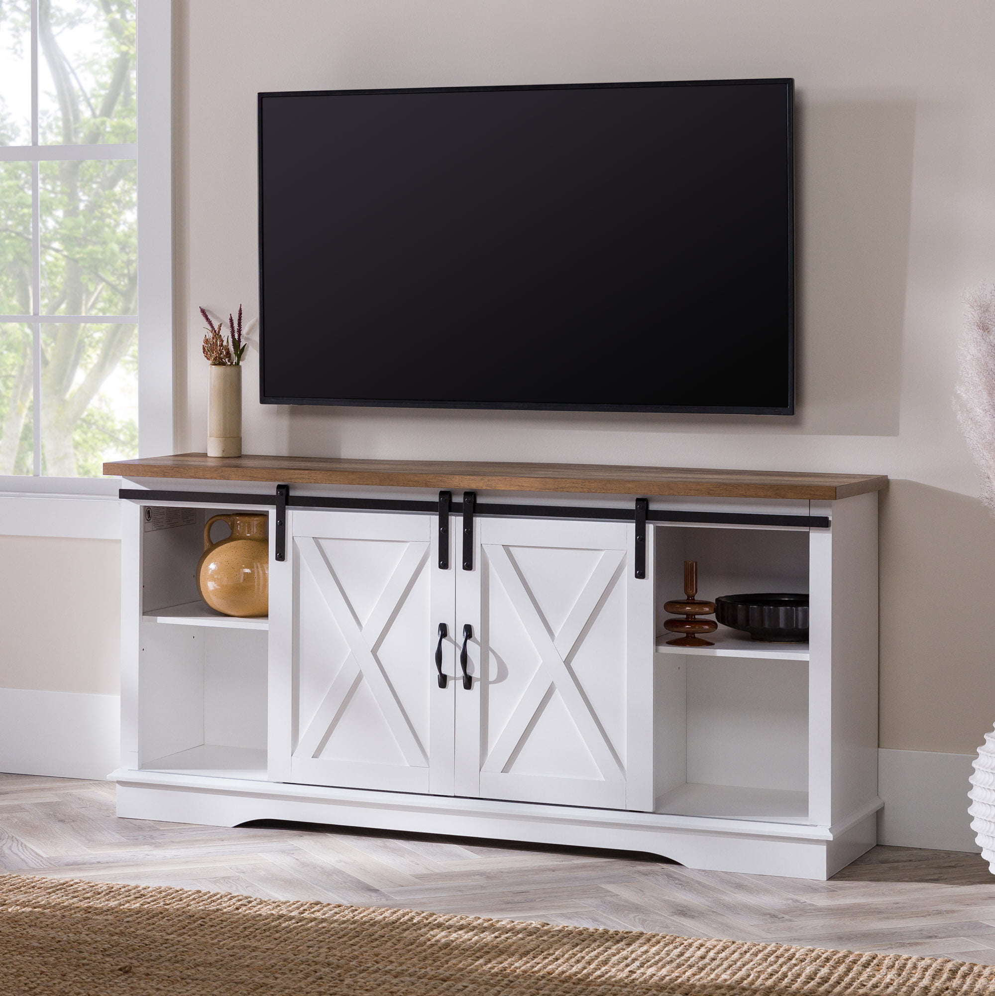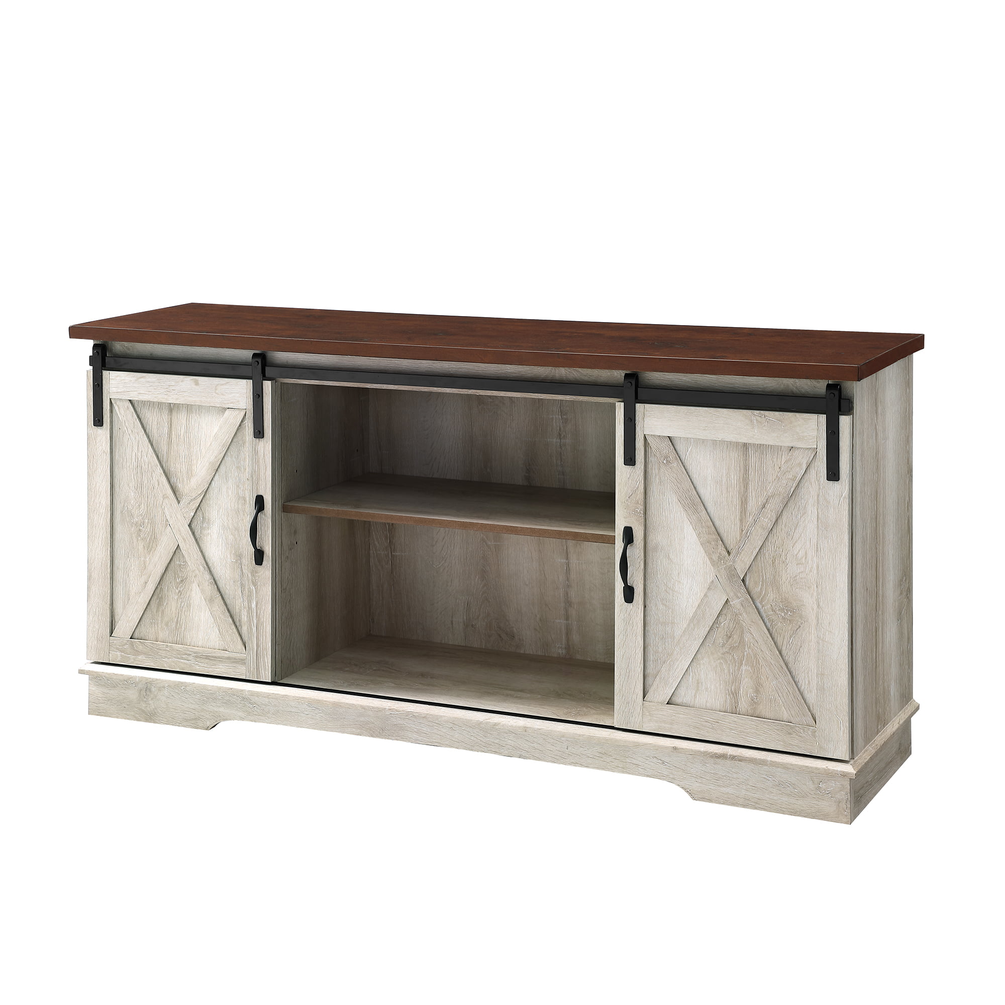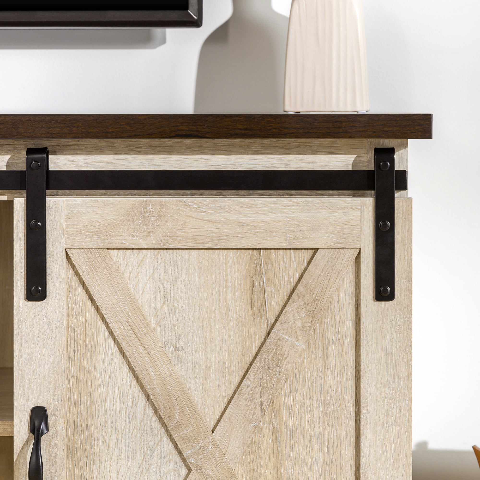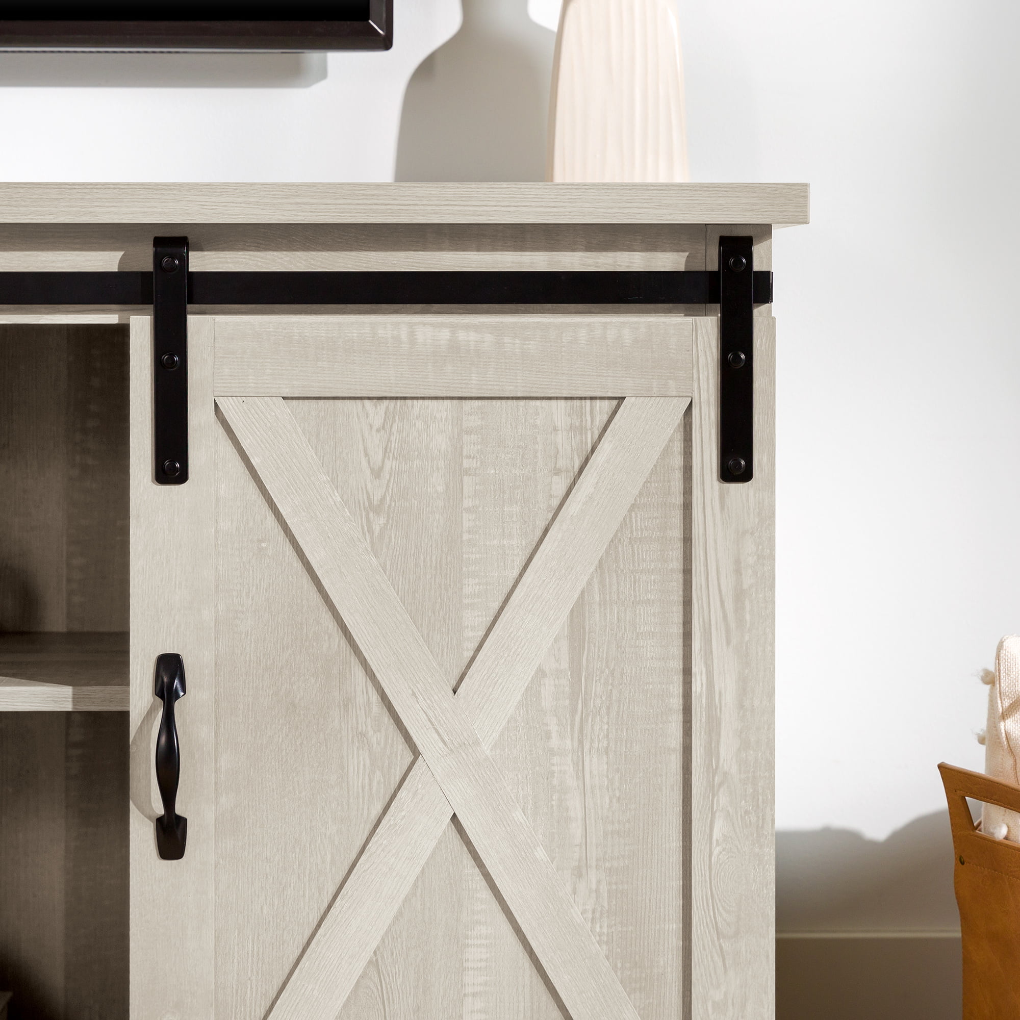 Woven Paths Sliding Farmhouse Barn Door TV Stand for TVs up to 65″. White Oak/Brown