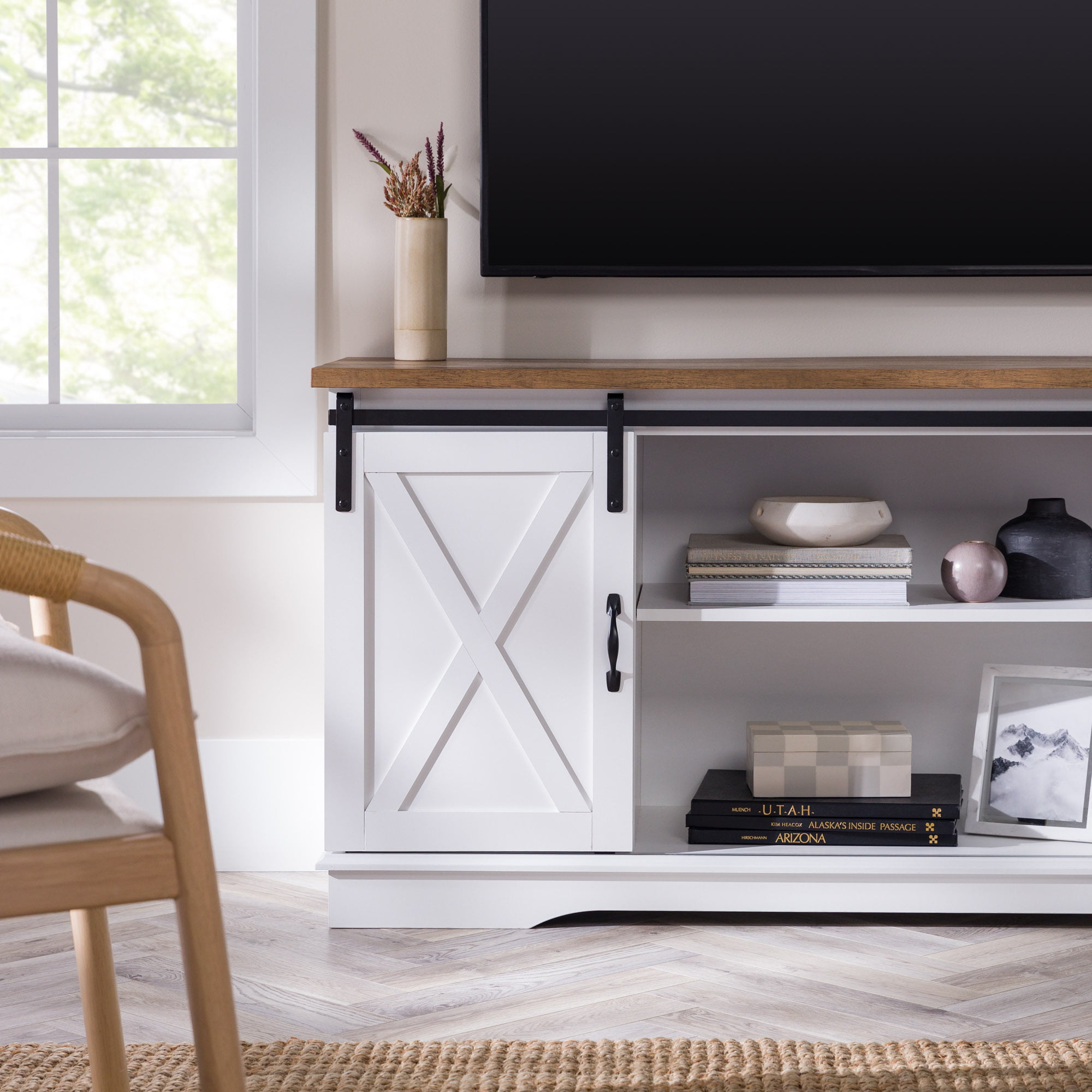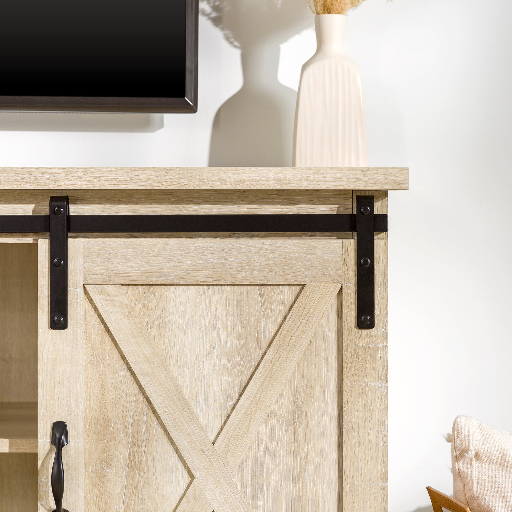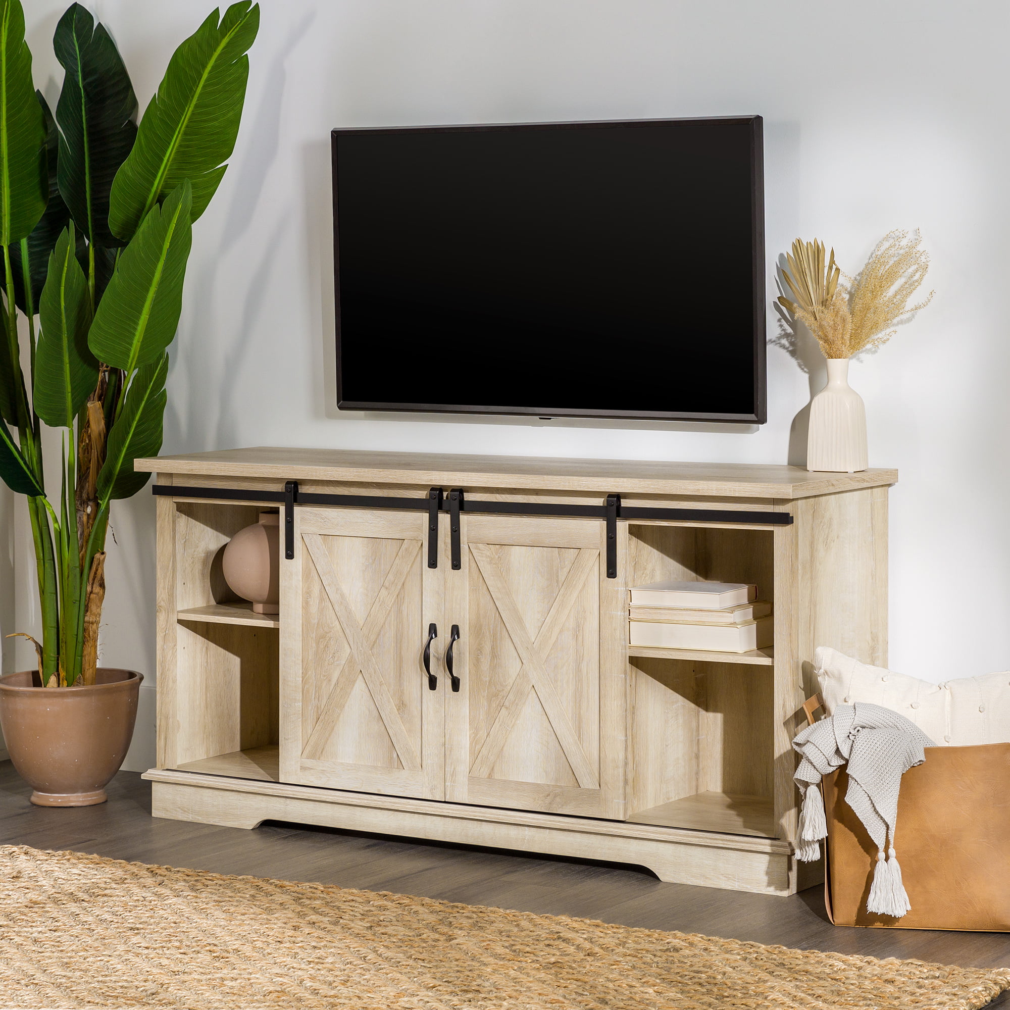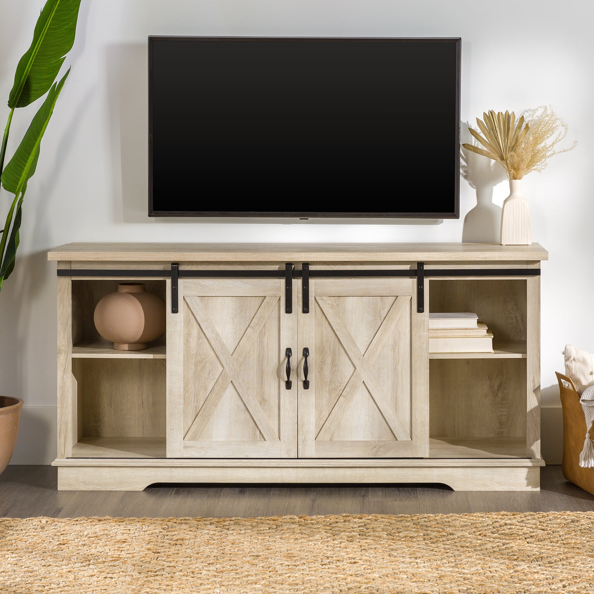 Woven Paths Sliding Farmhouse Barn Door TV Stand for TVs up to 65″. White Oak/Brown