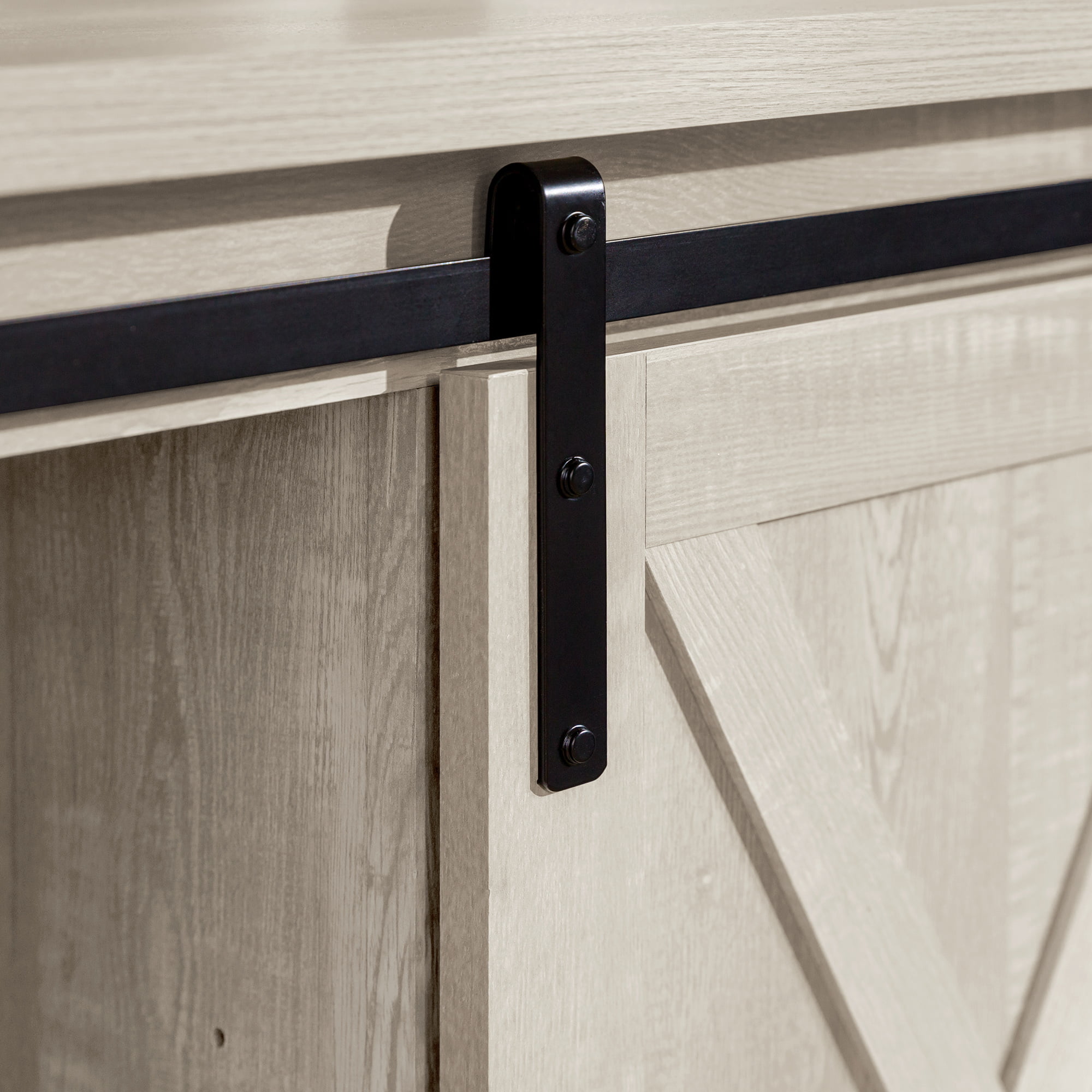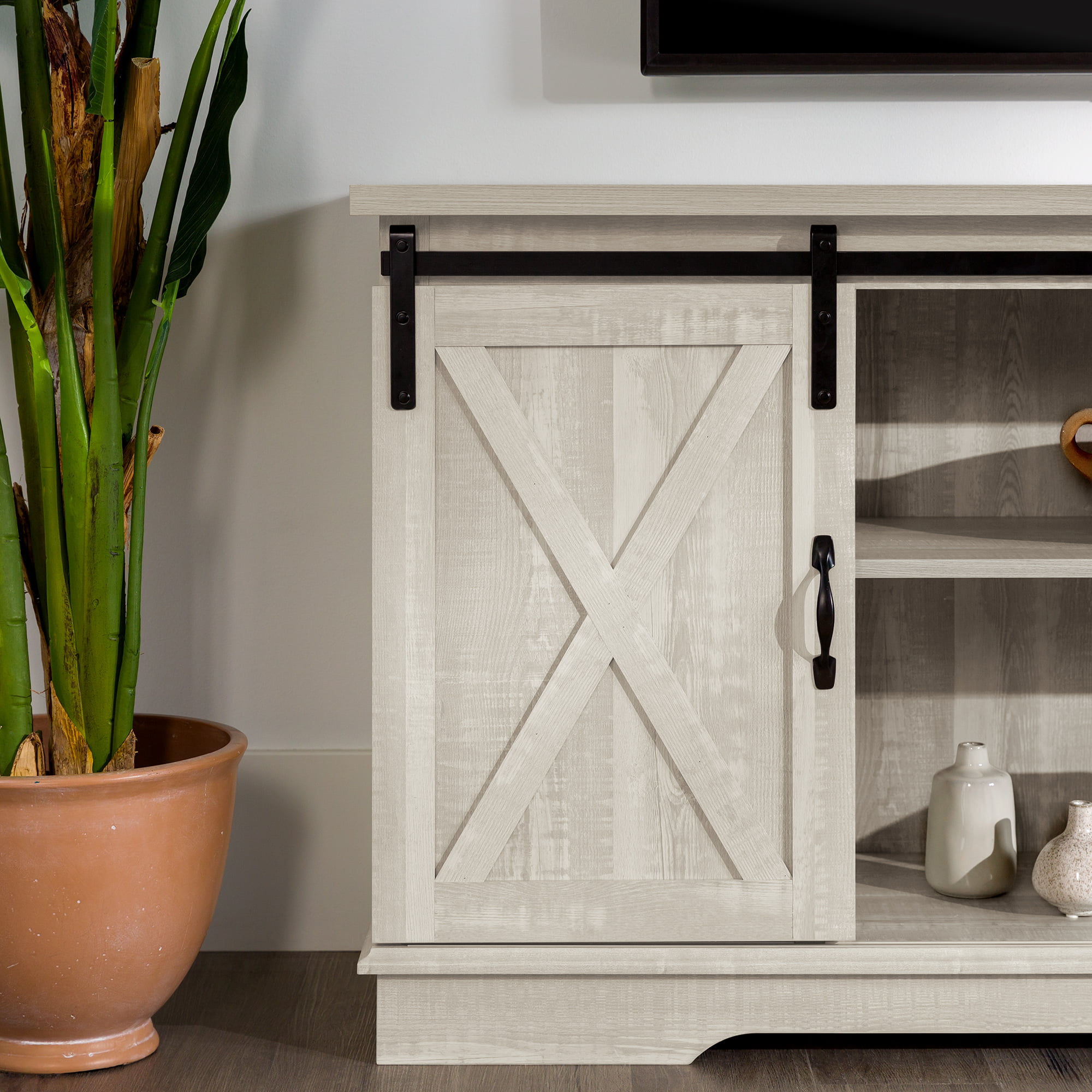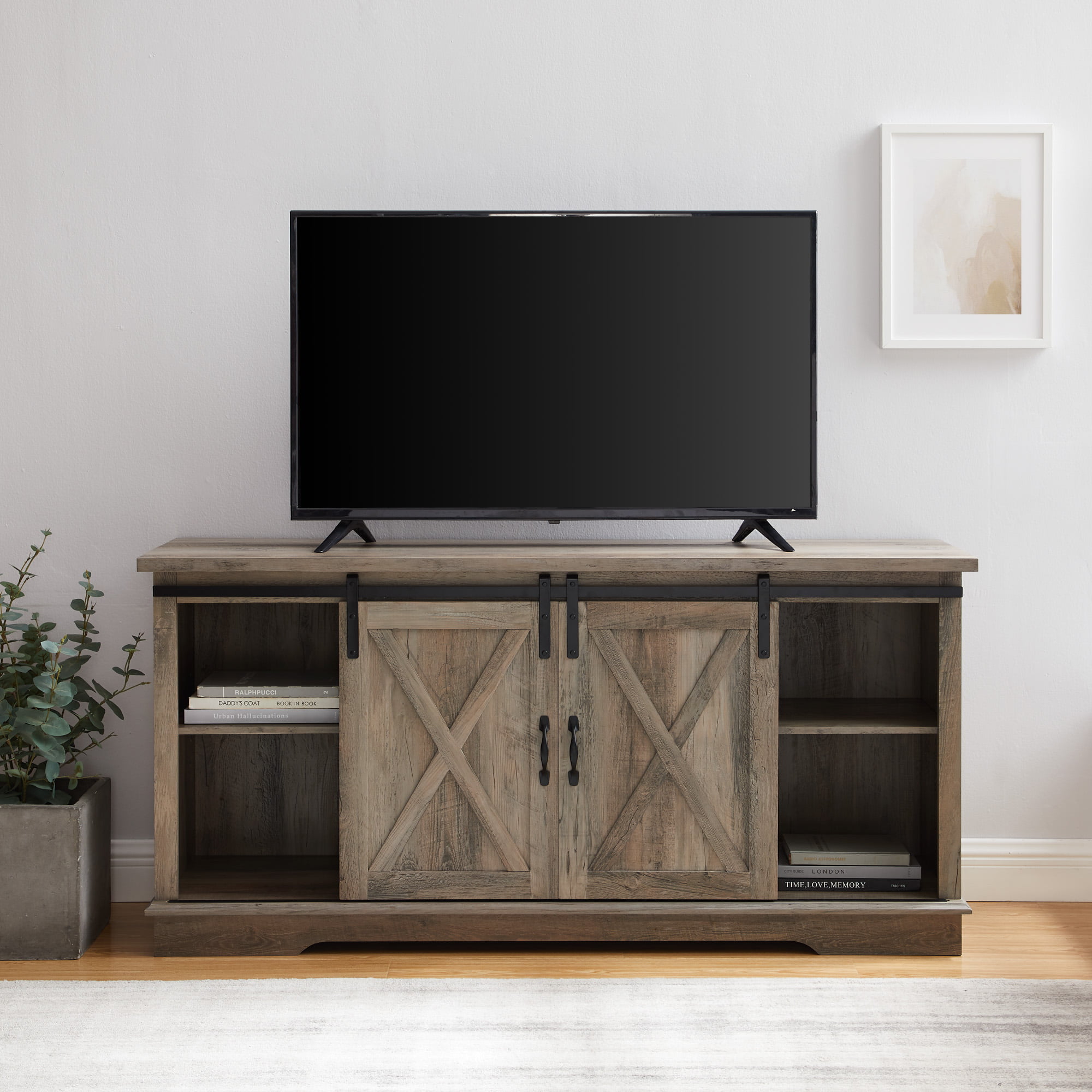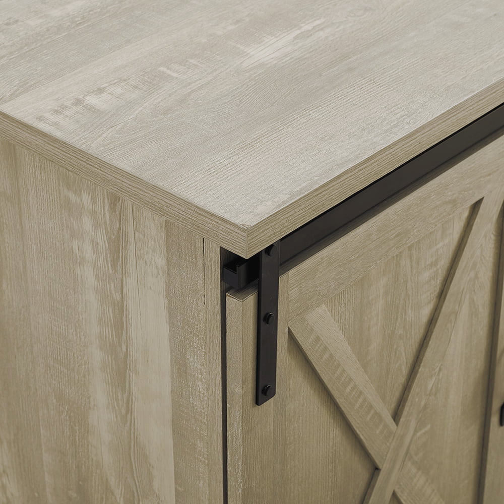 Woven Paths Sliding Farmhouse Barn Door TV Stand for TVs up to 65″. Grey Wash