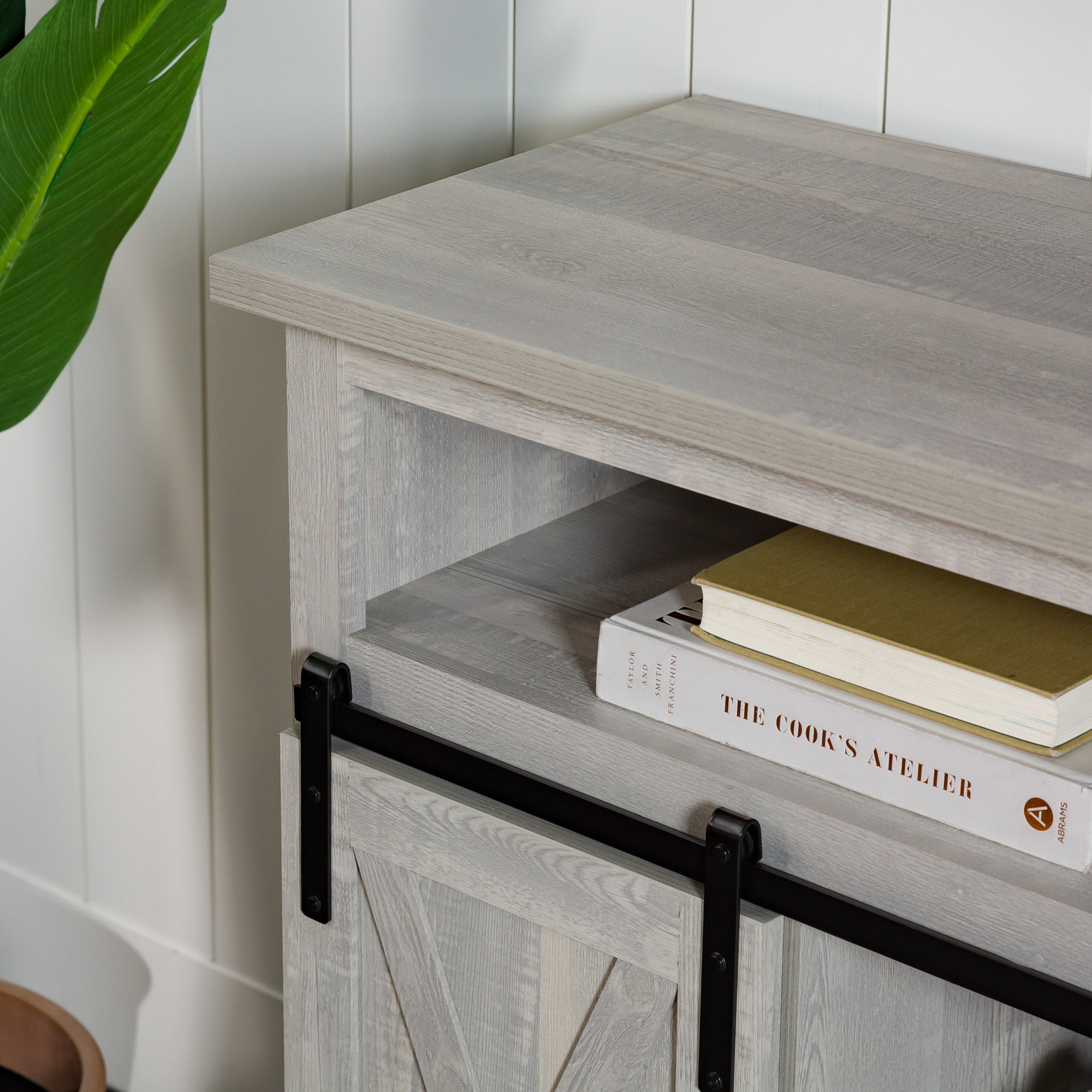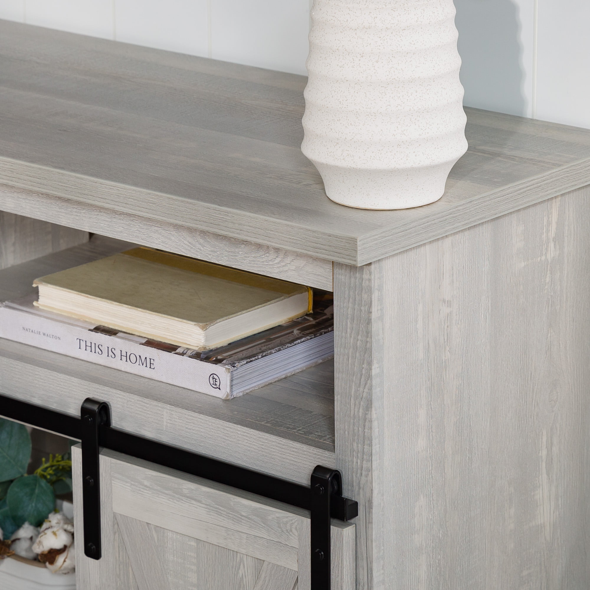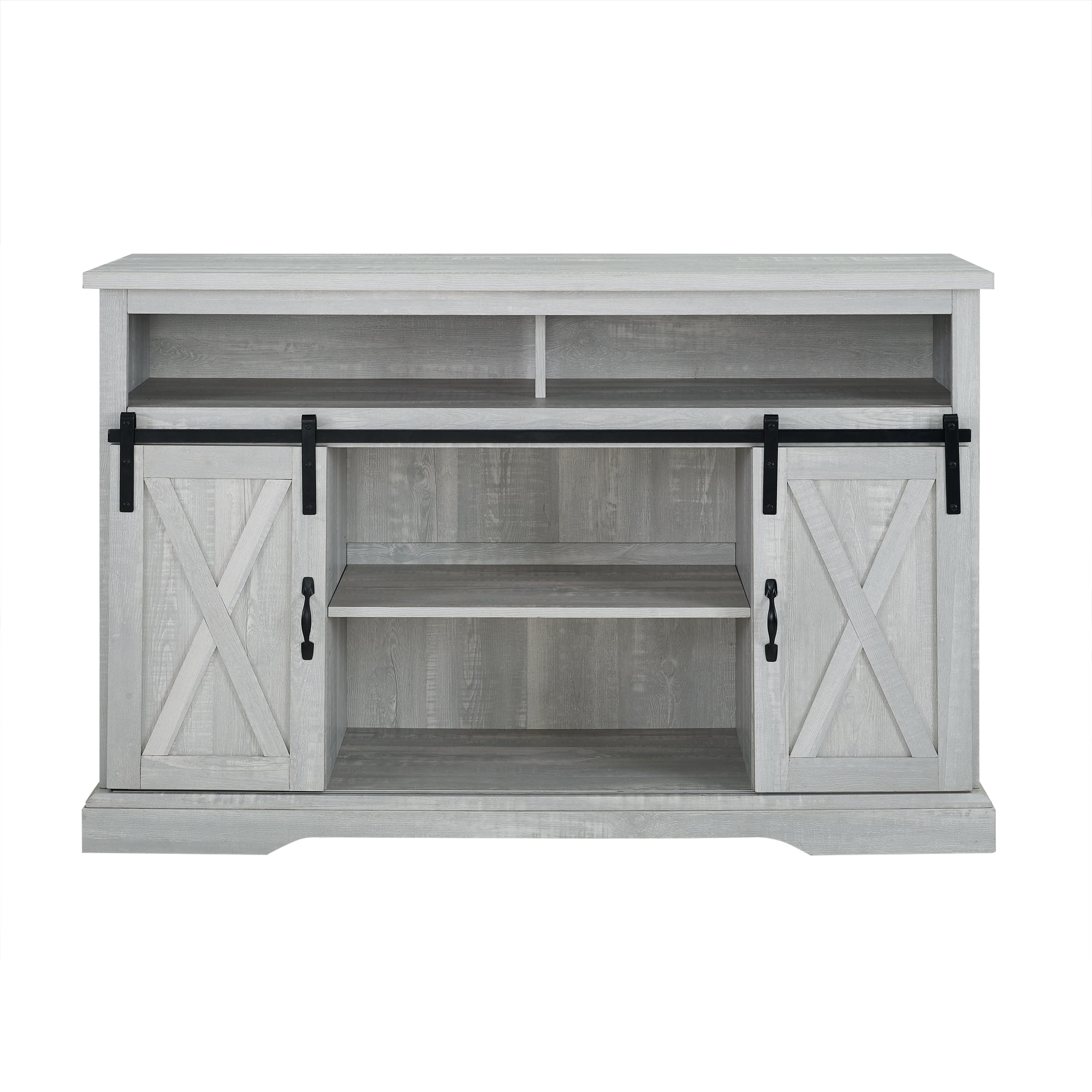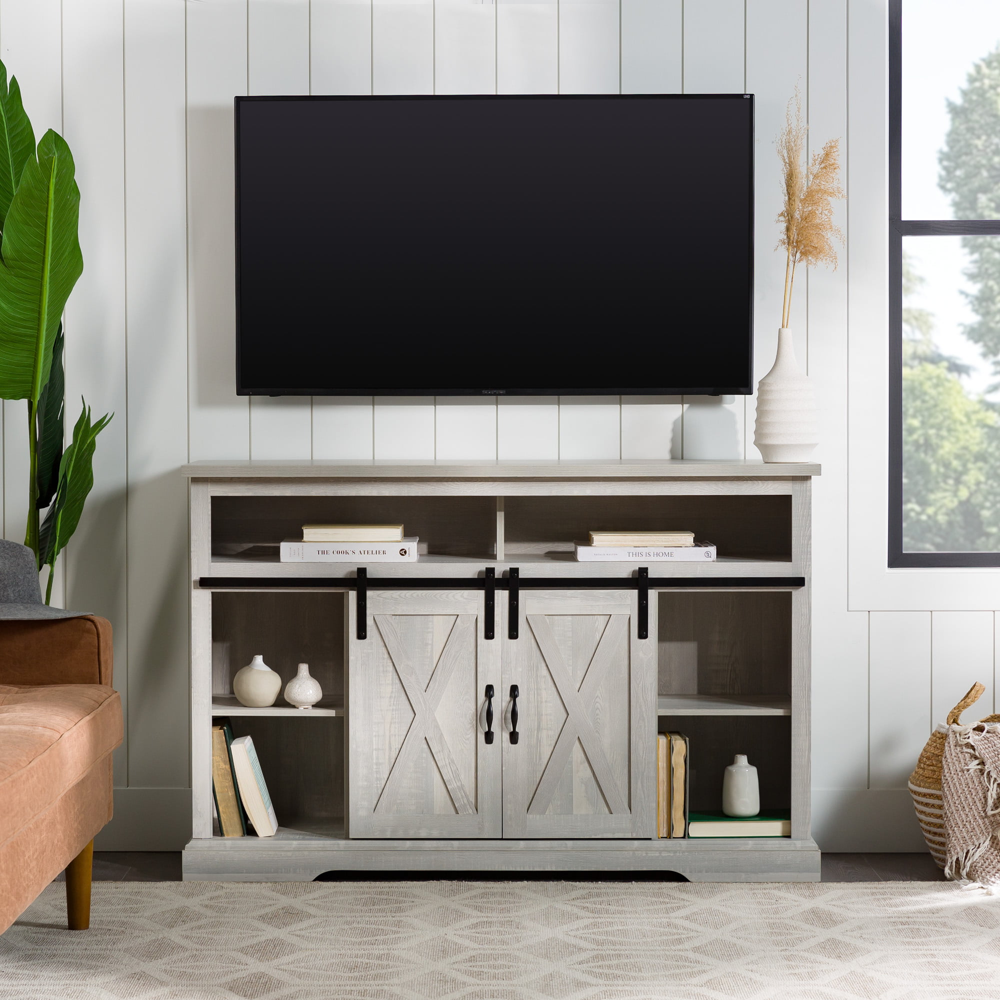 Woven Paths Farmhouse Barn Door TV Stand for TVs up to 58″. Stone Grey