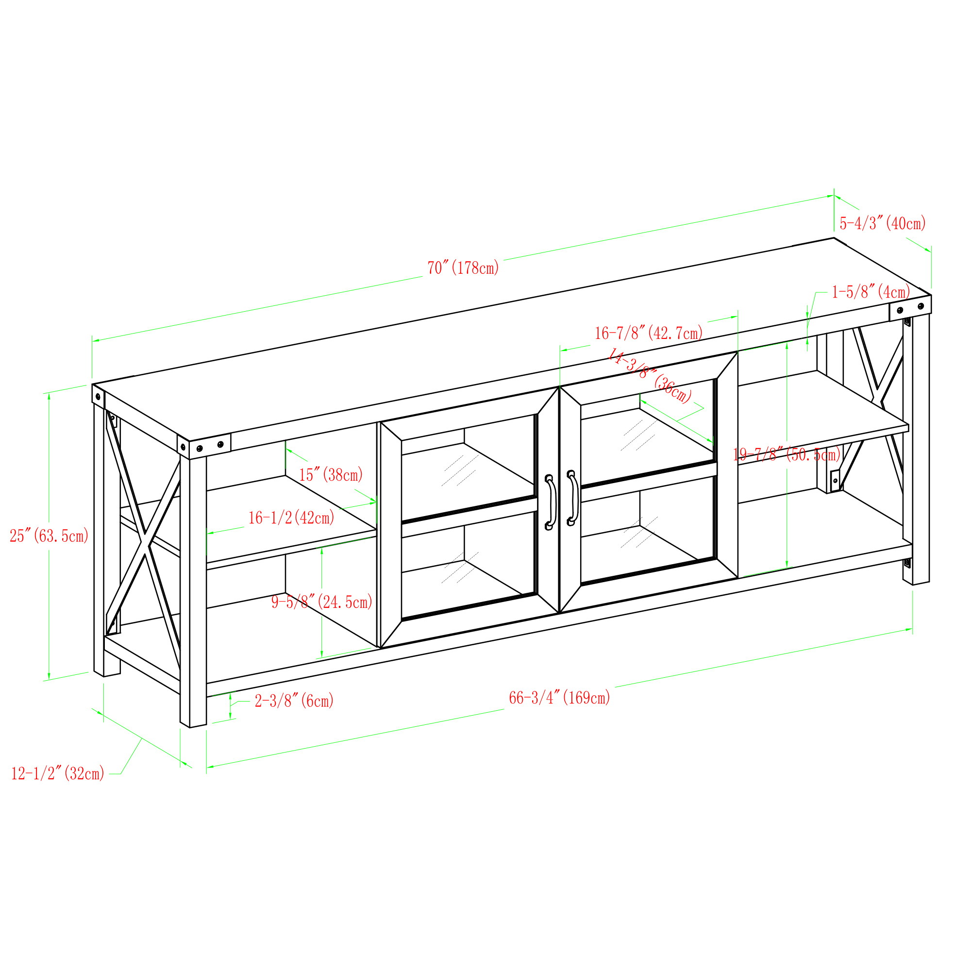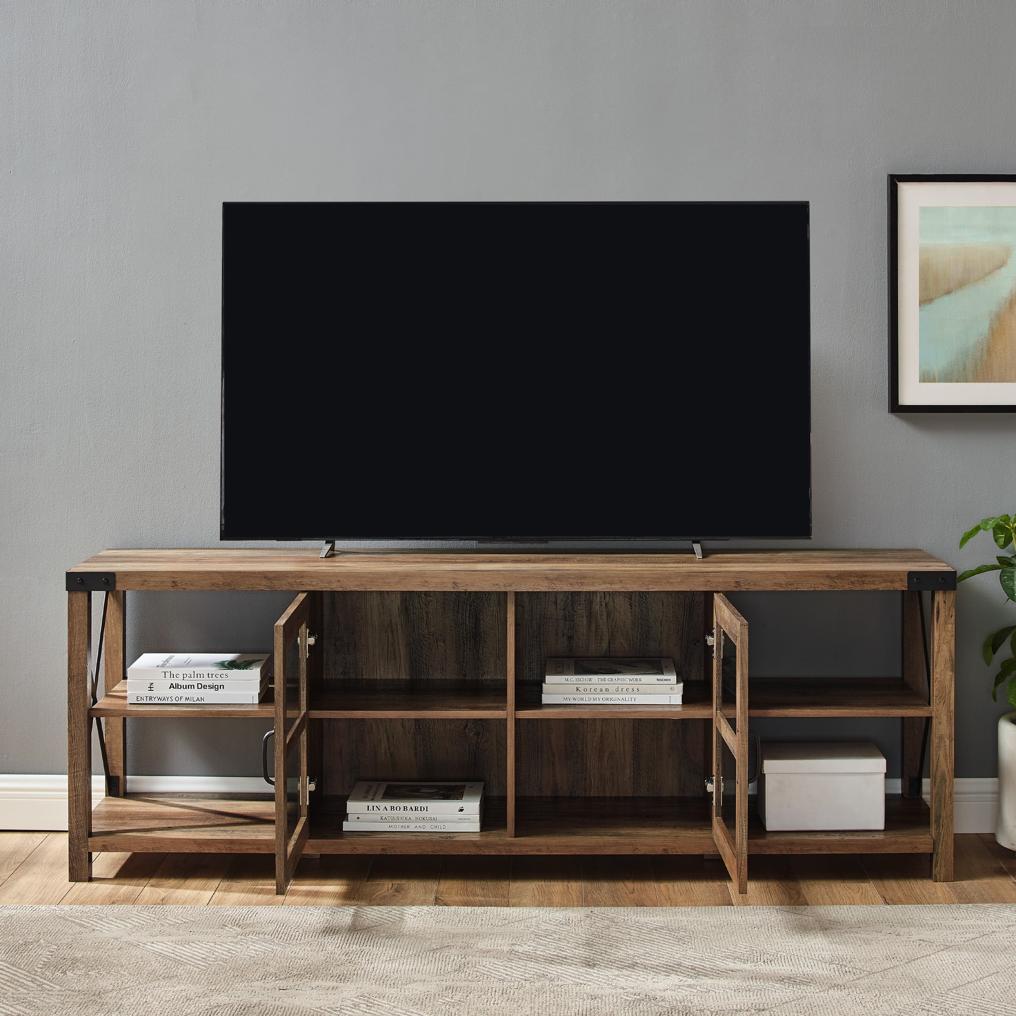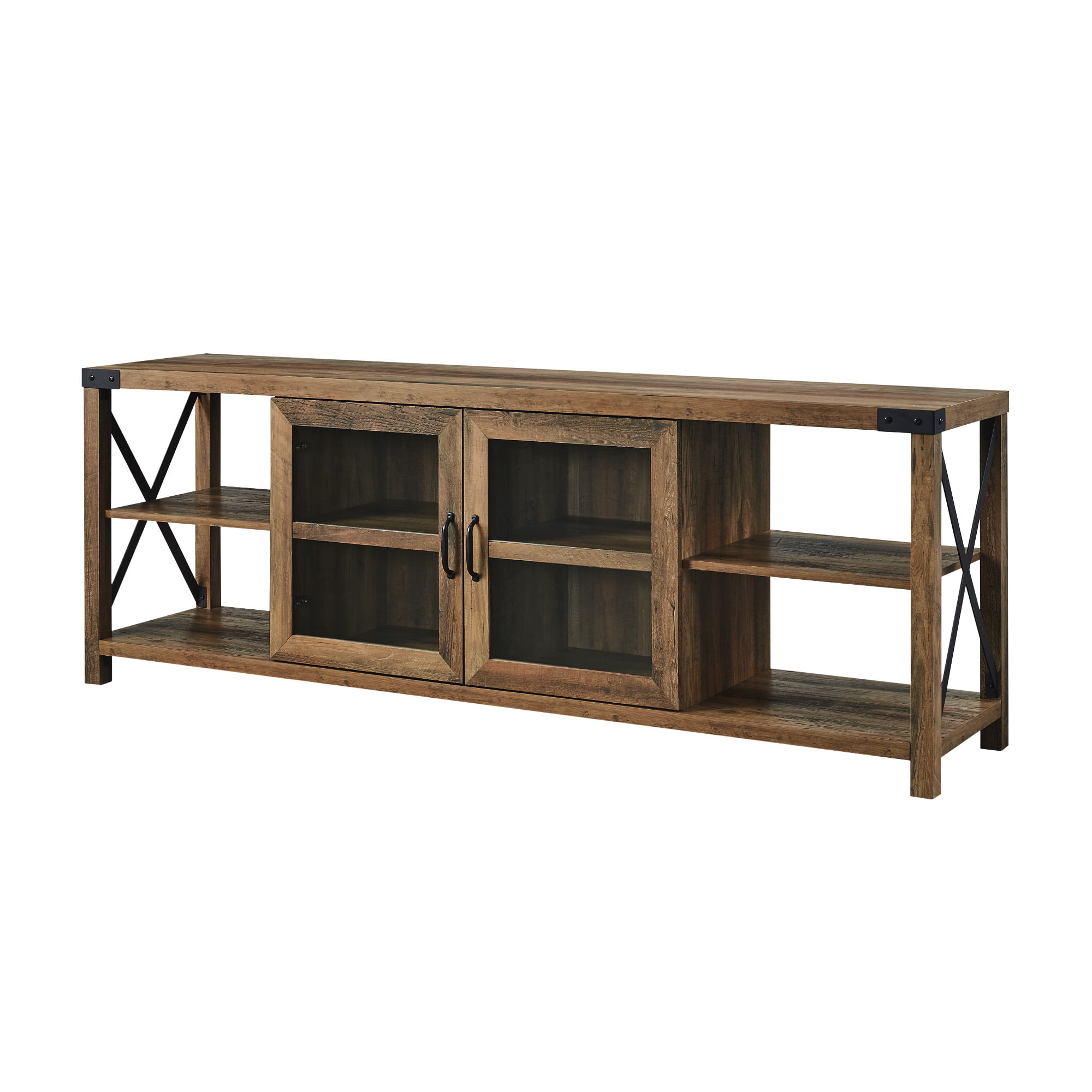Woven Paths Farmhouse 2 Door Metal X TV Stand for TVs up to 80″. Reclaimed Barnwood
