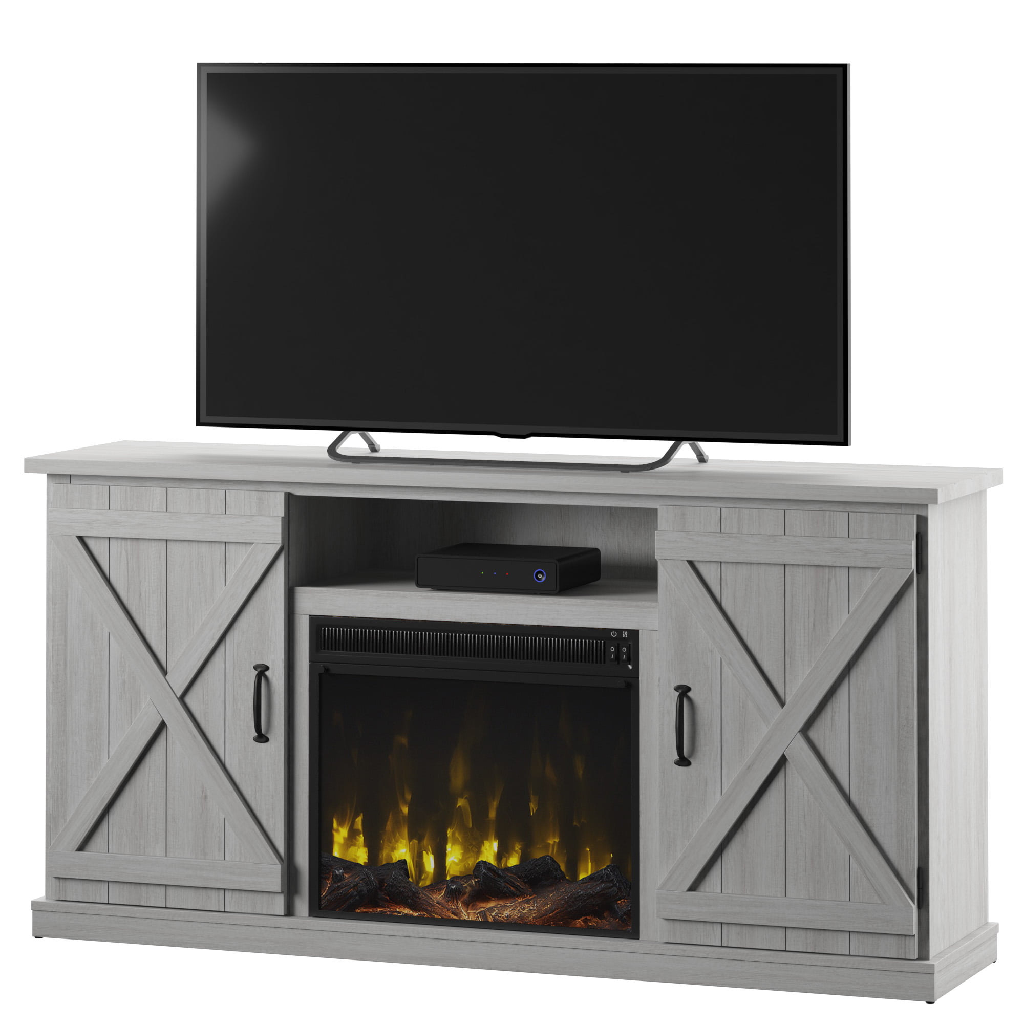 Twin Star Home Barn Door TV Stand for TVs up to 70 inches with ClassicFlame Electric Fireplace. Sargent Oak