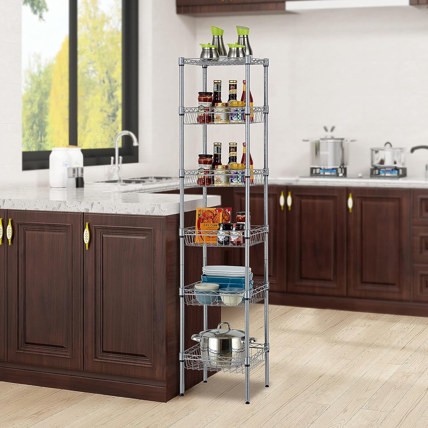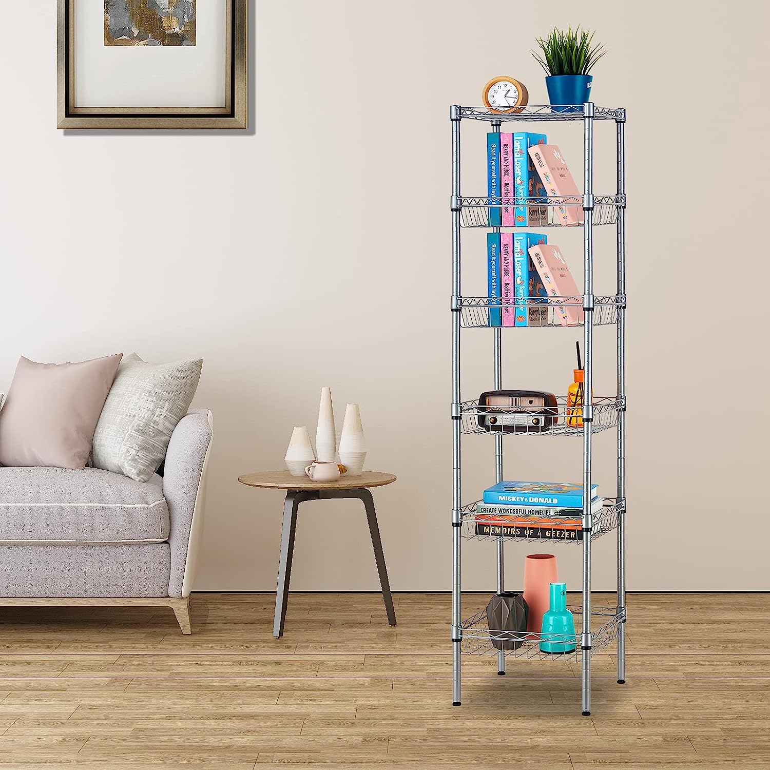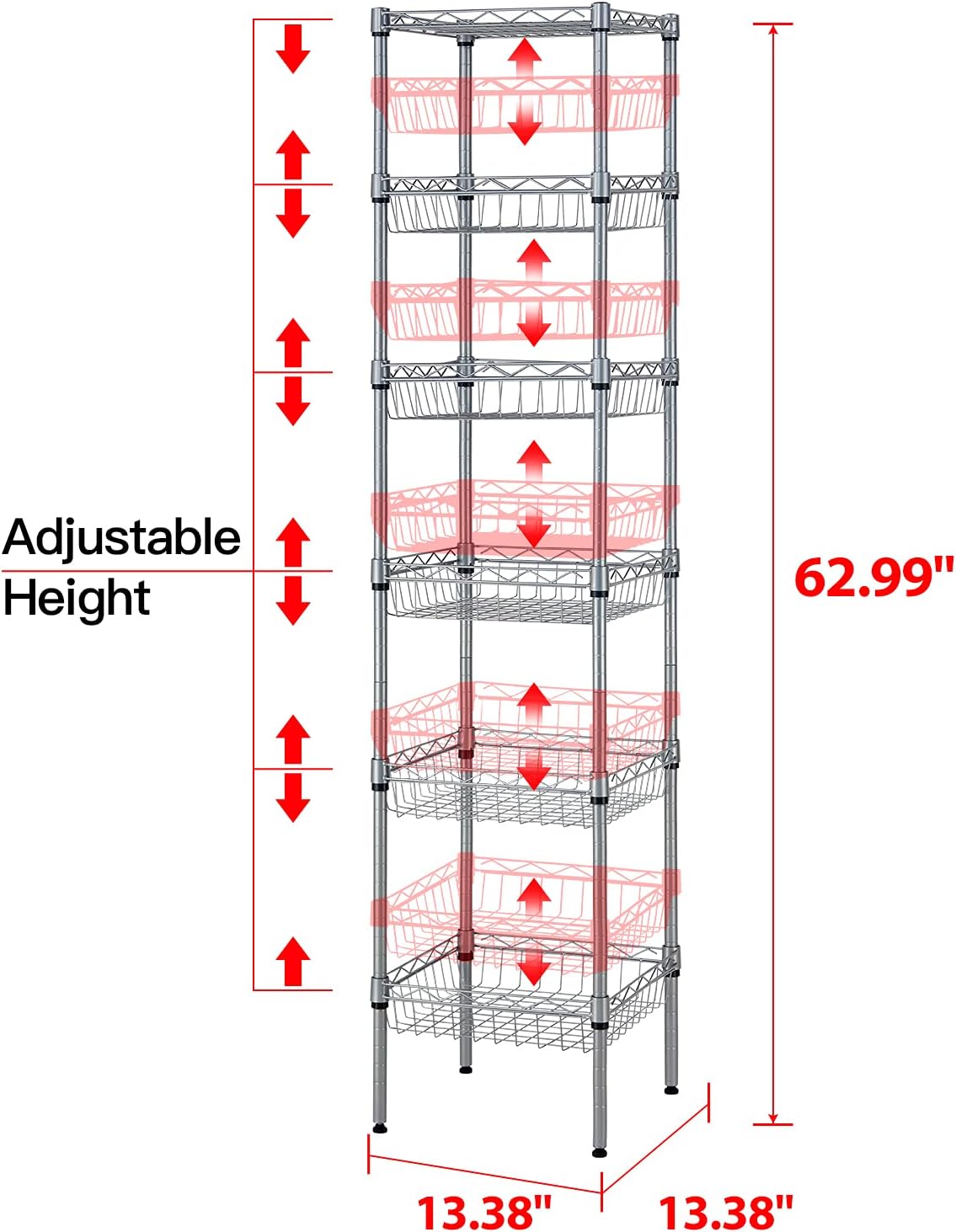 SINGAYE Storage Shelves. 6-Tier Wire Shelving Unit with Baskets Storage Rack Corner Shelf Shelving Adjustable Storage Shelf. Medium. 13.4″ D x 13.4″ W x 62.99″ H.Silver